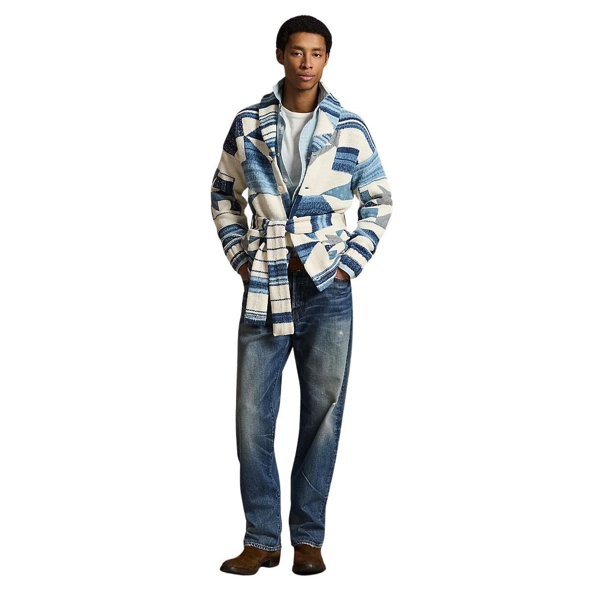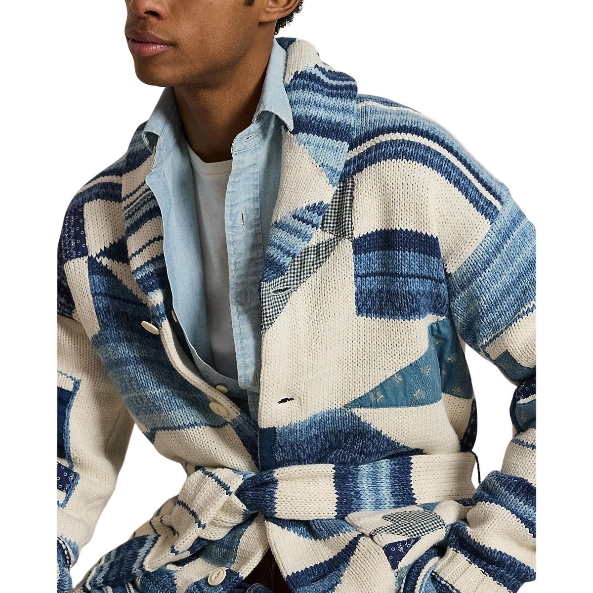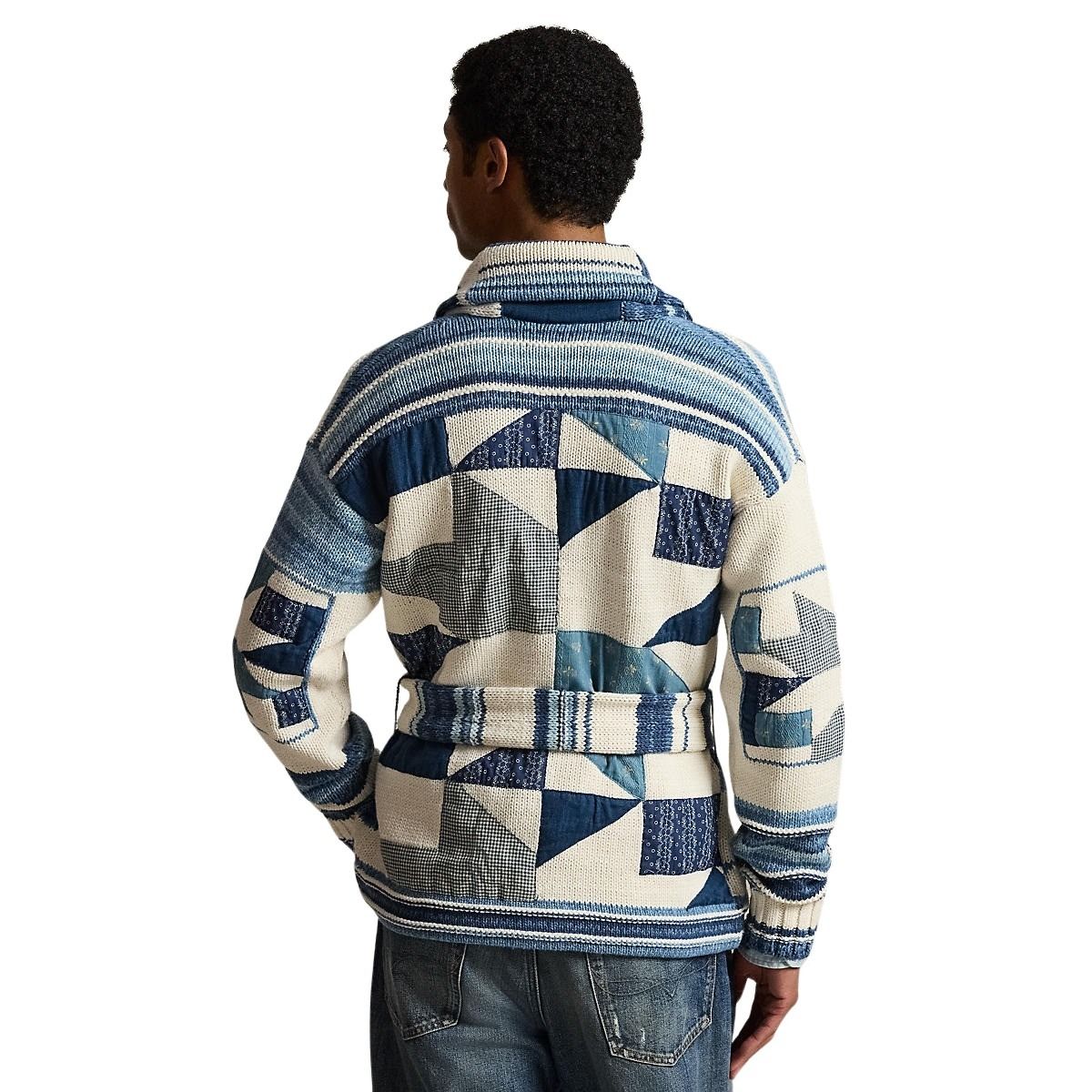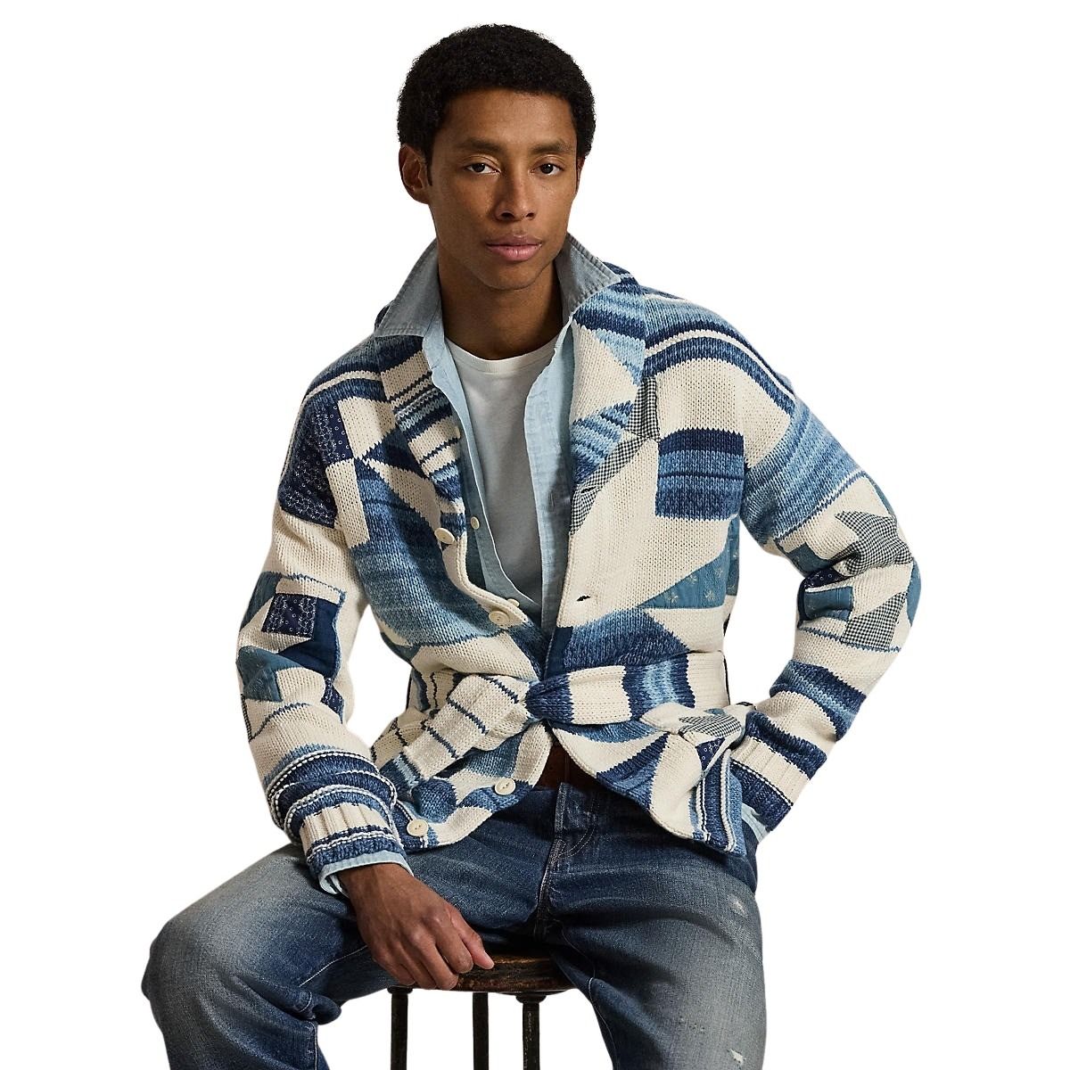 Cardigan til herre fra Polo Ralph Lauren. Cardiganen har sjalskrage og et unikt patchwork-design inspirert av Ralph Laurens arkiv. Strikket i en myk bomulls- og linblanding, med ulike mønstre som gir en fin struktur og et avslappet uttrykk.
