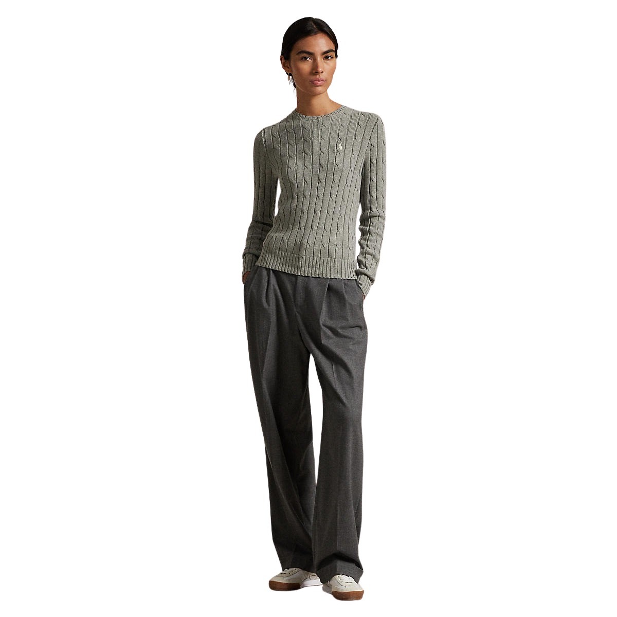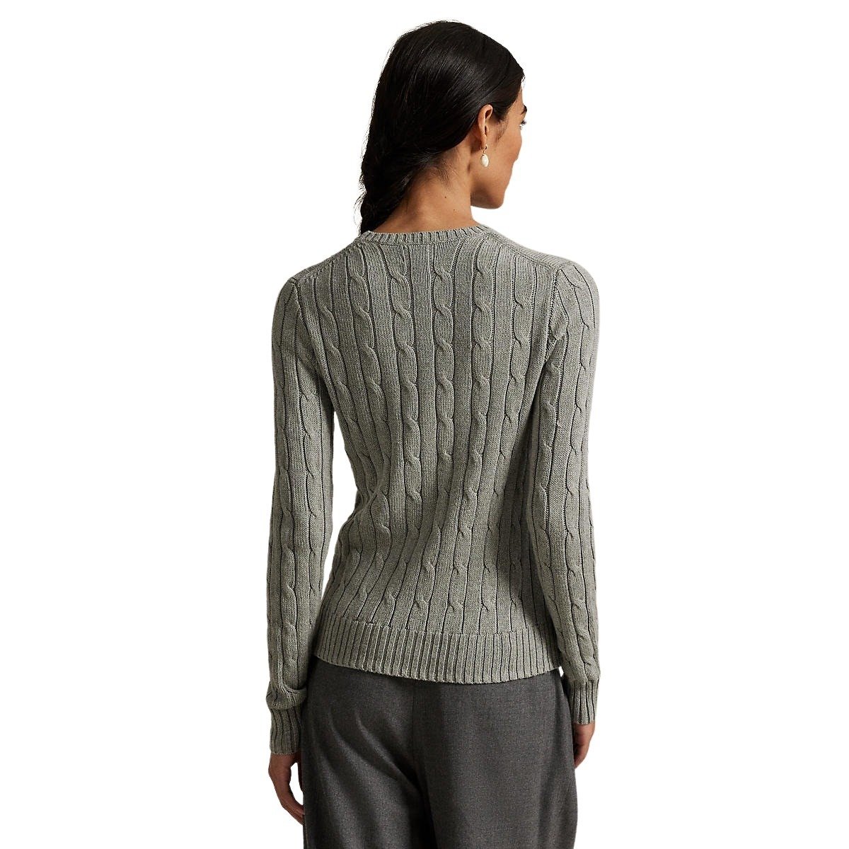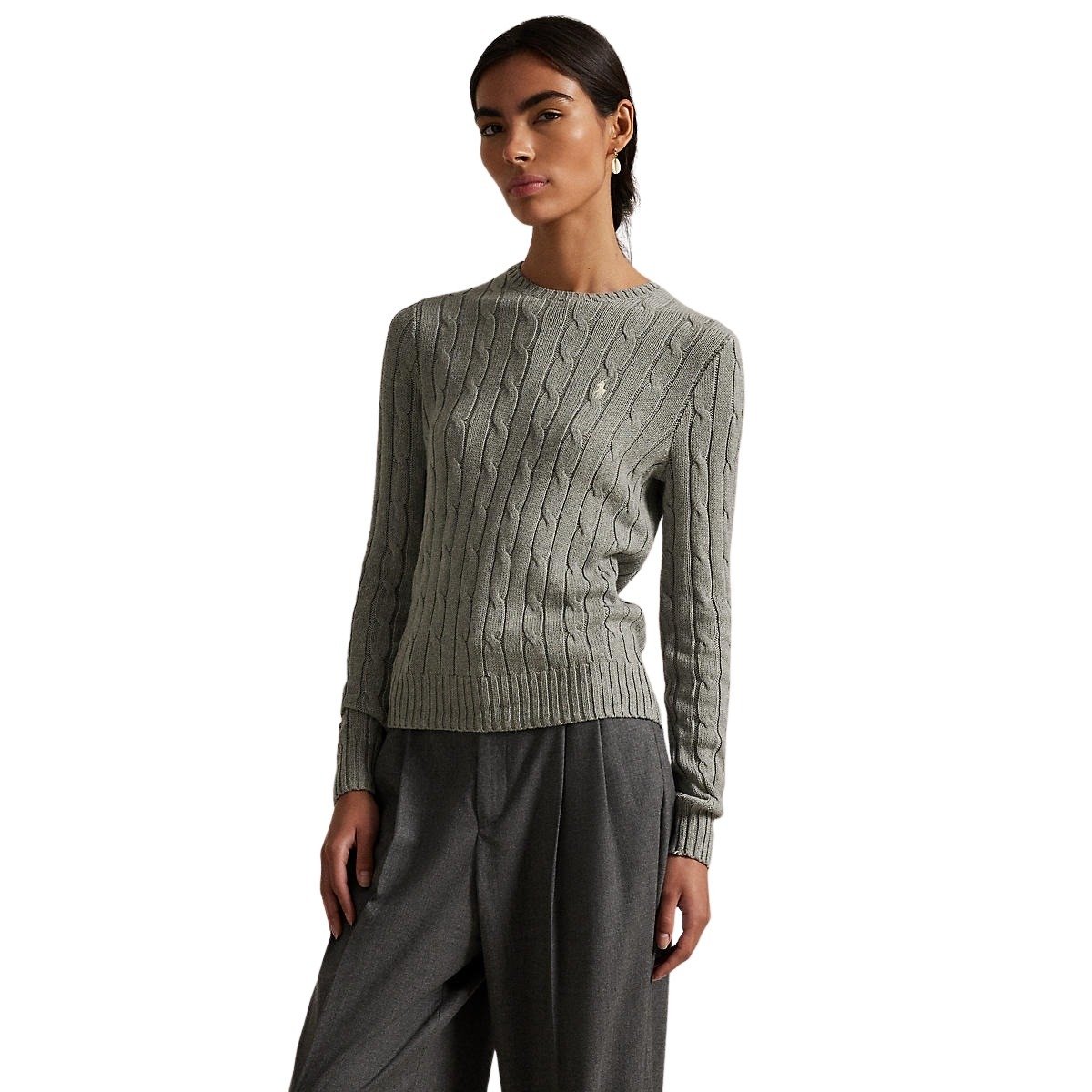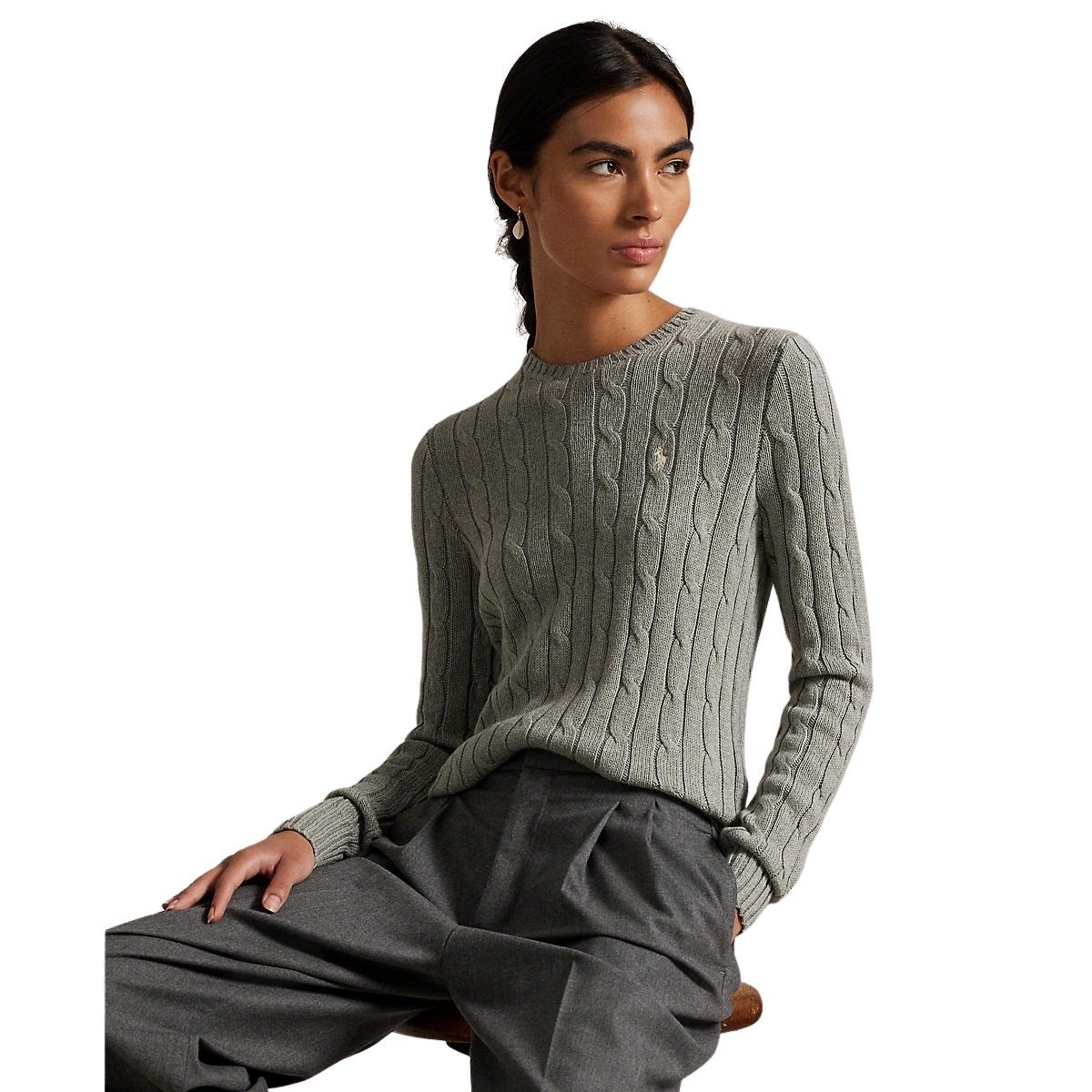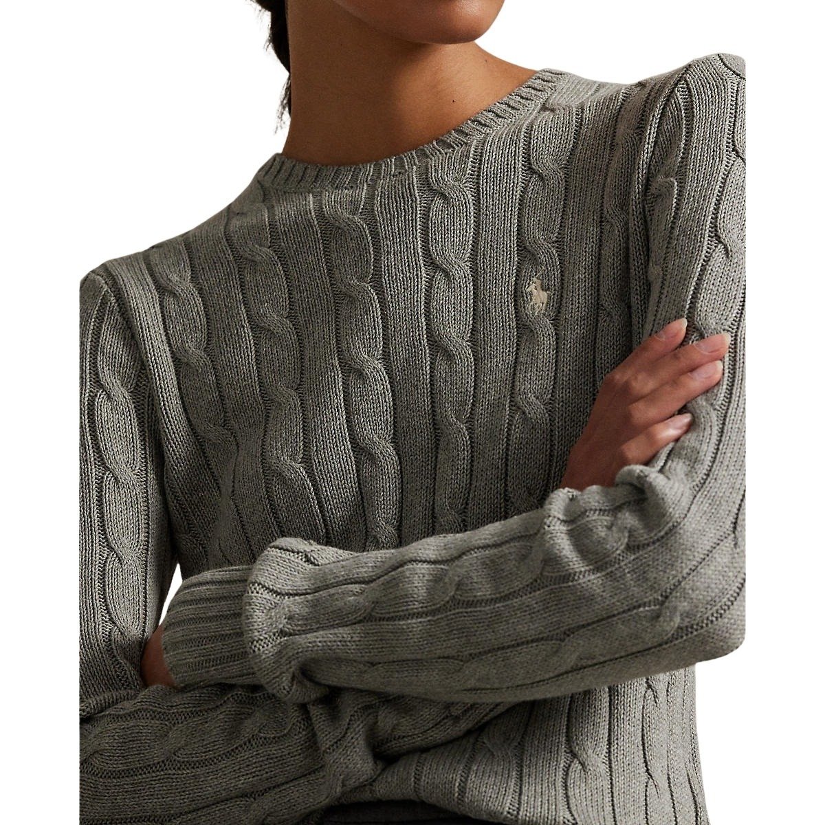 Genser til dame fra Polo Ralph Lauren. Genser med rund hals som kombinerer Ralph Laurens teksturerte kabelstrikkede konstruksjon med en slank silhuett. Laget av myk bomull og detaljert med deres signaturbroderte Pony på brystet.