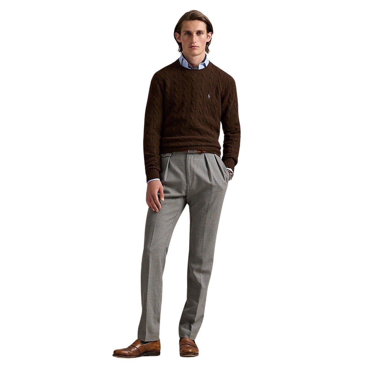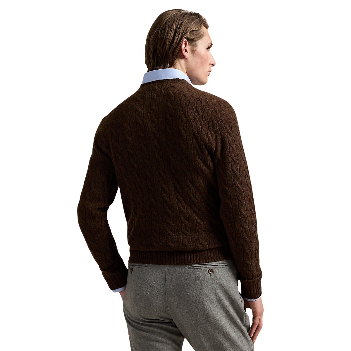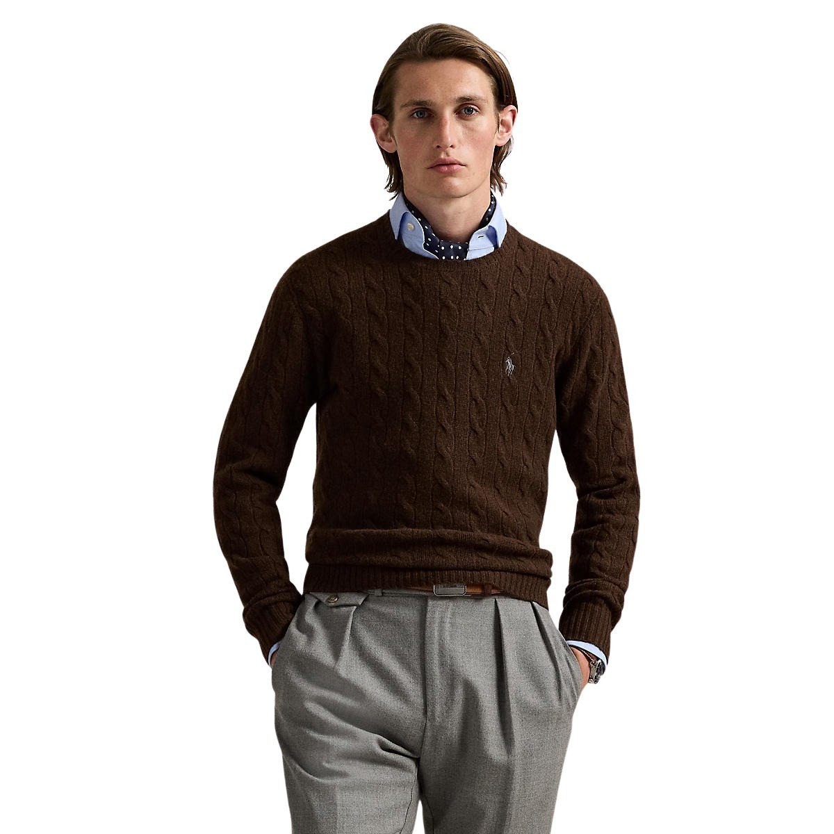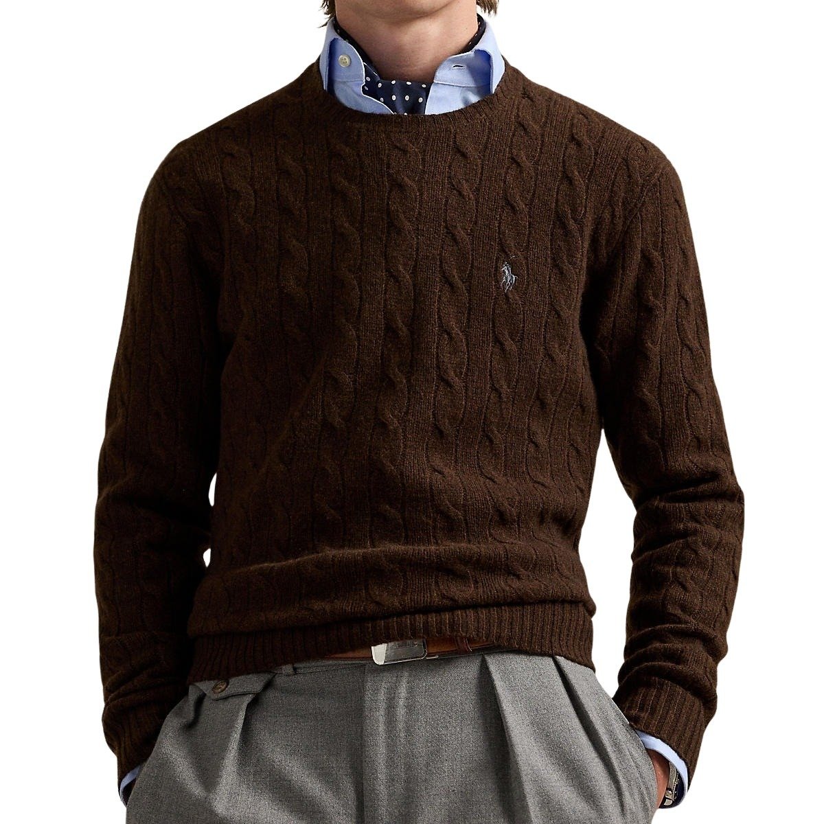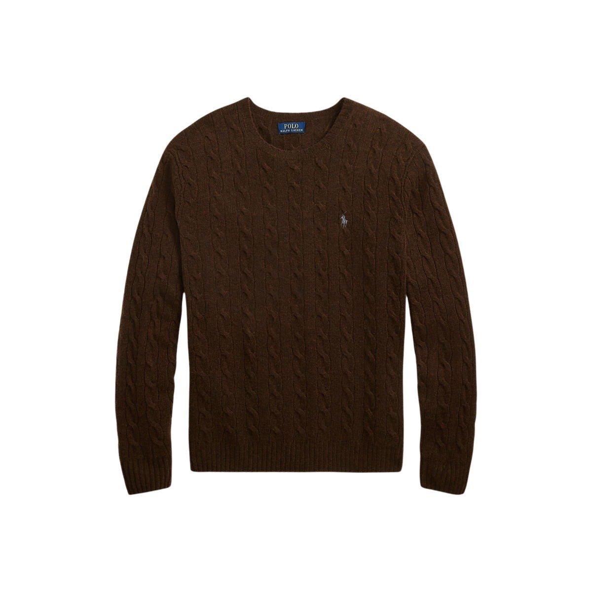 Genser til herre fra Polo Ralph Lauren. Deres ikoniske kabelstrikkede genser, laget av italiensk ullgarn spunnet med kasjmir. Detaljert med signaturbrodert Pony på venstre bryst.