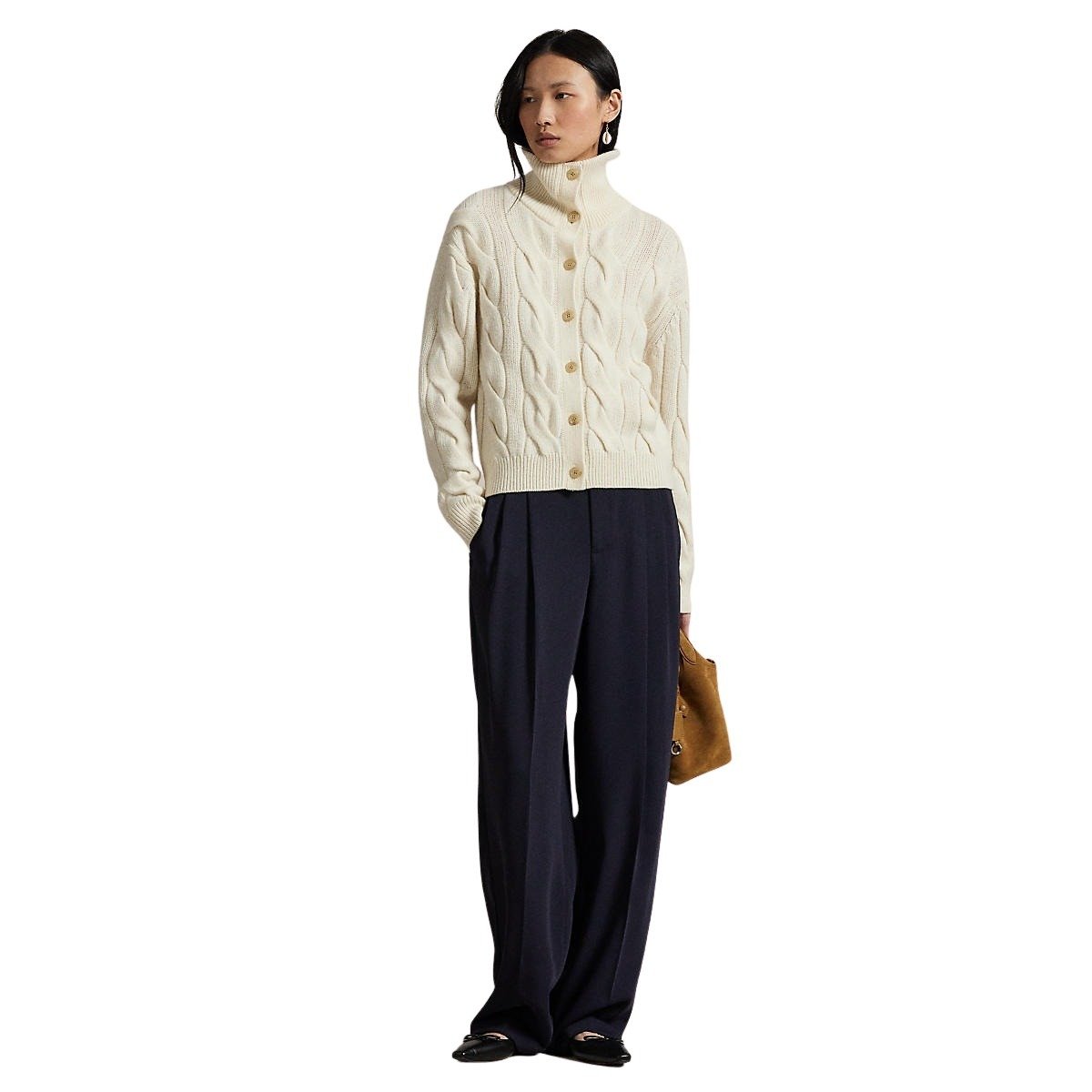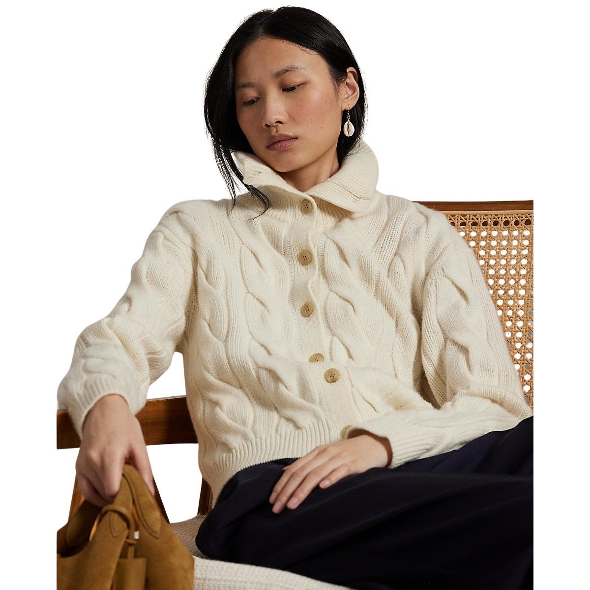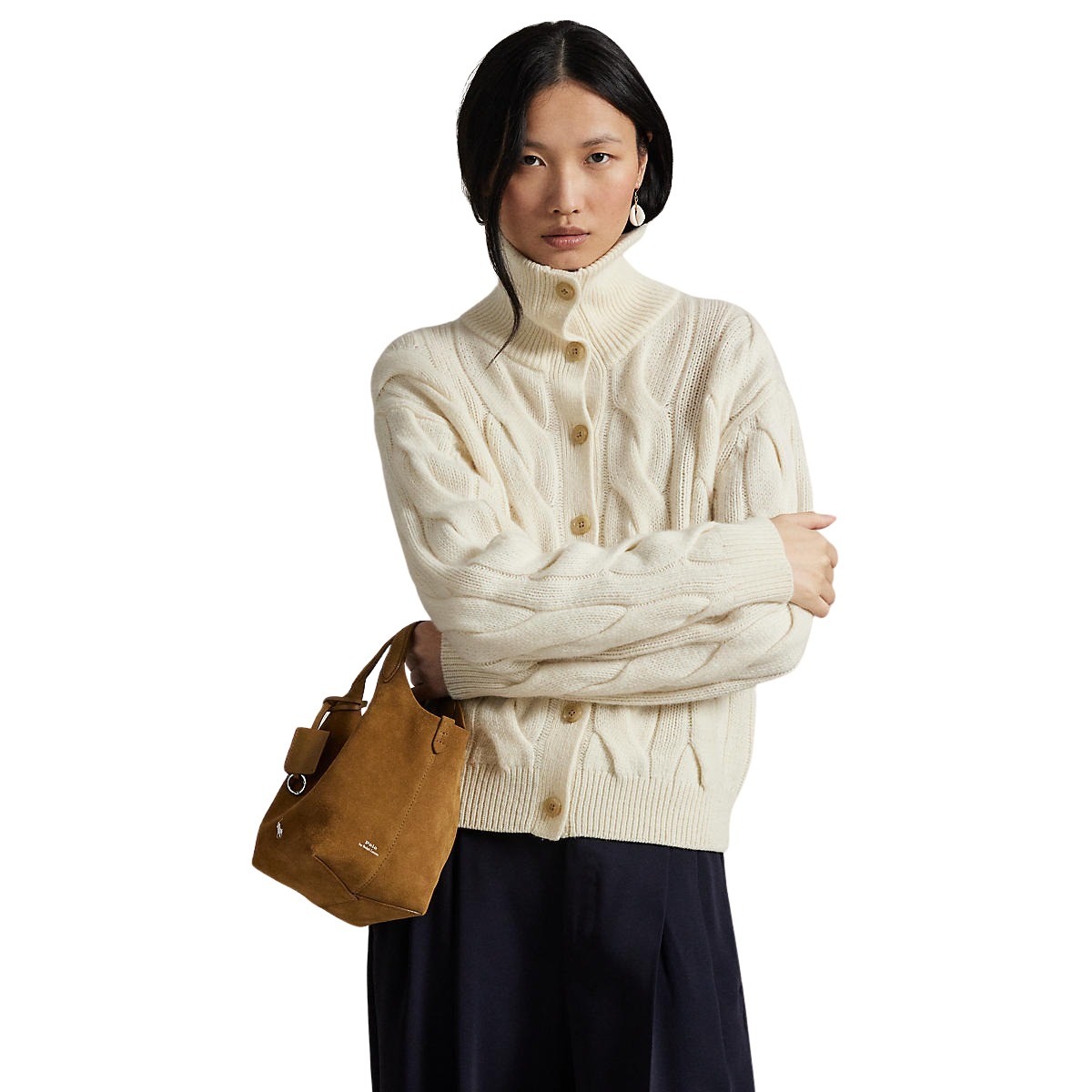 Cardigan til dame fra Polo Ralph Lauren. Eksklusiv cardigan i italiensk ull og kasjmir med et mykt, tungt fall. Oversized kabelstrikk-mønster med klassisk høy hals og knapper gir et tidløst plagg som er like allsidig som det er elegant.