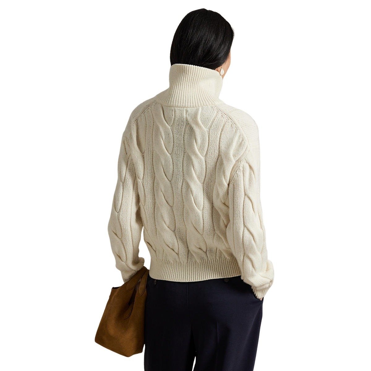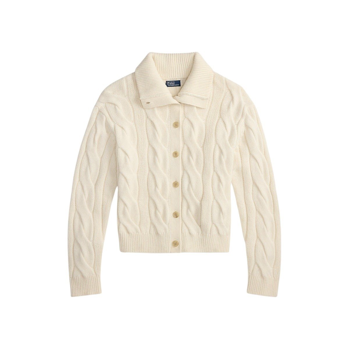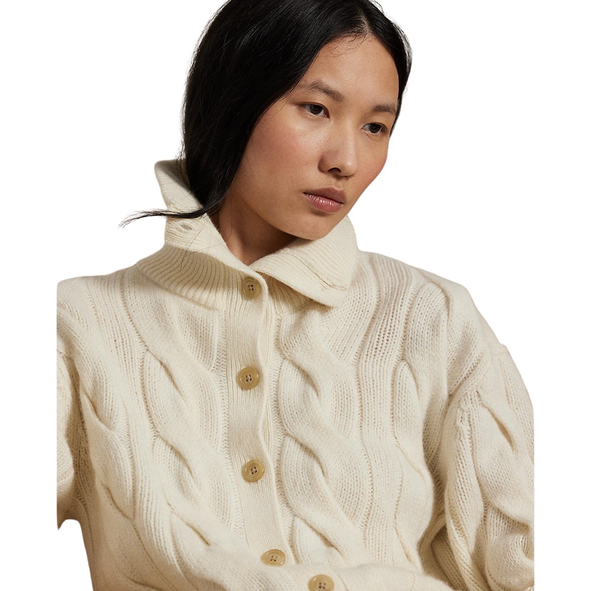 Cardigan til dame fra Polo Ralph Lauren. Eksklusiv cardigan i italiensk ull og kasjmir med et mykt, tungt fall. Oversized kabelstrikk-mønster med klassisk høy hals og knapper gir et tidløst plagg som er like allsidig som det er elegant.