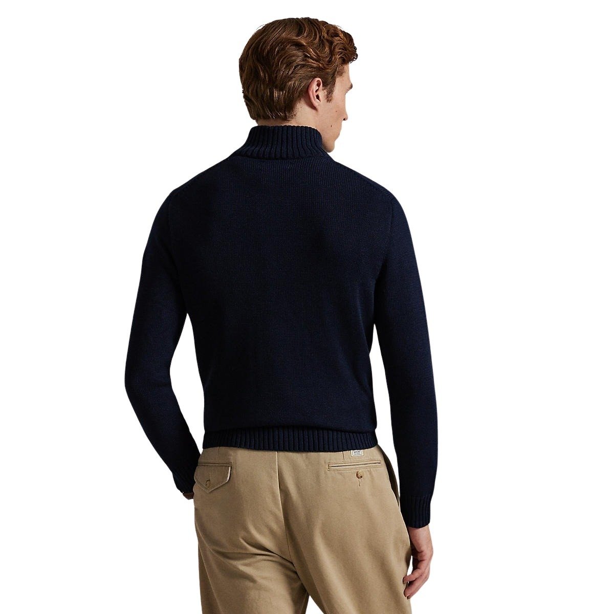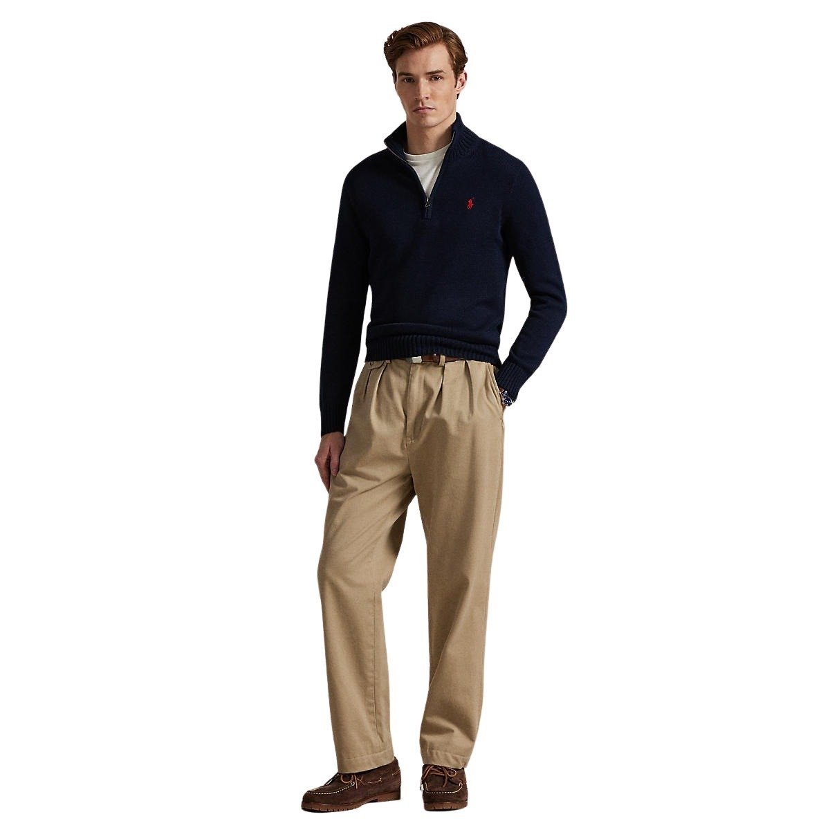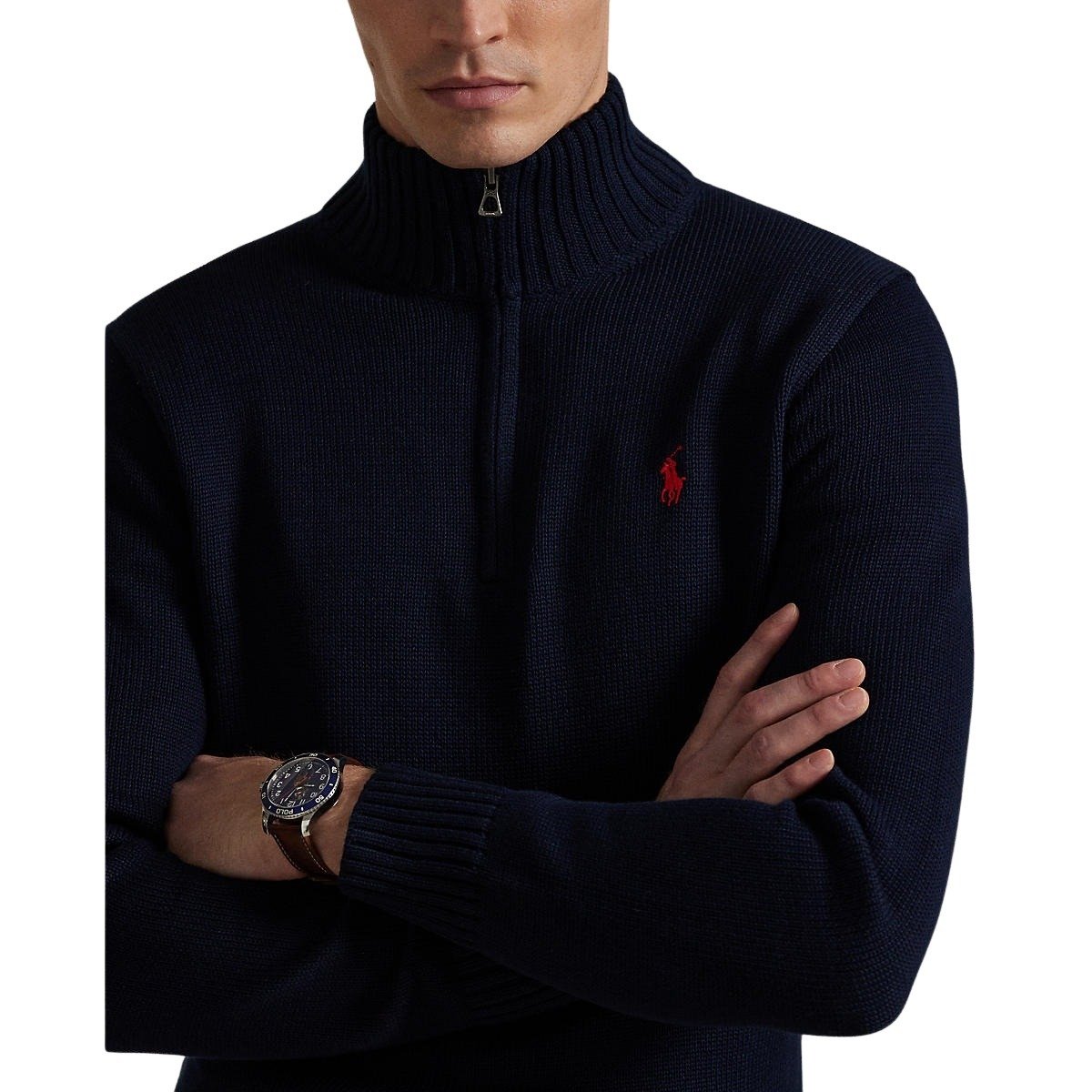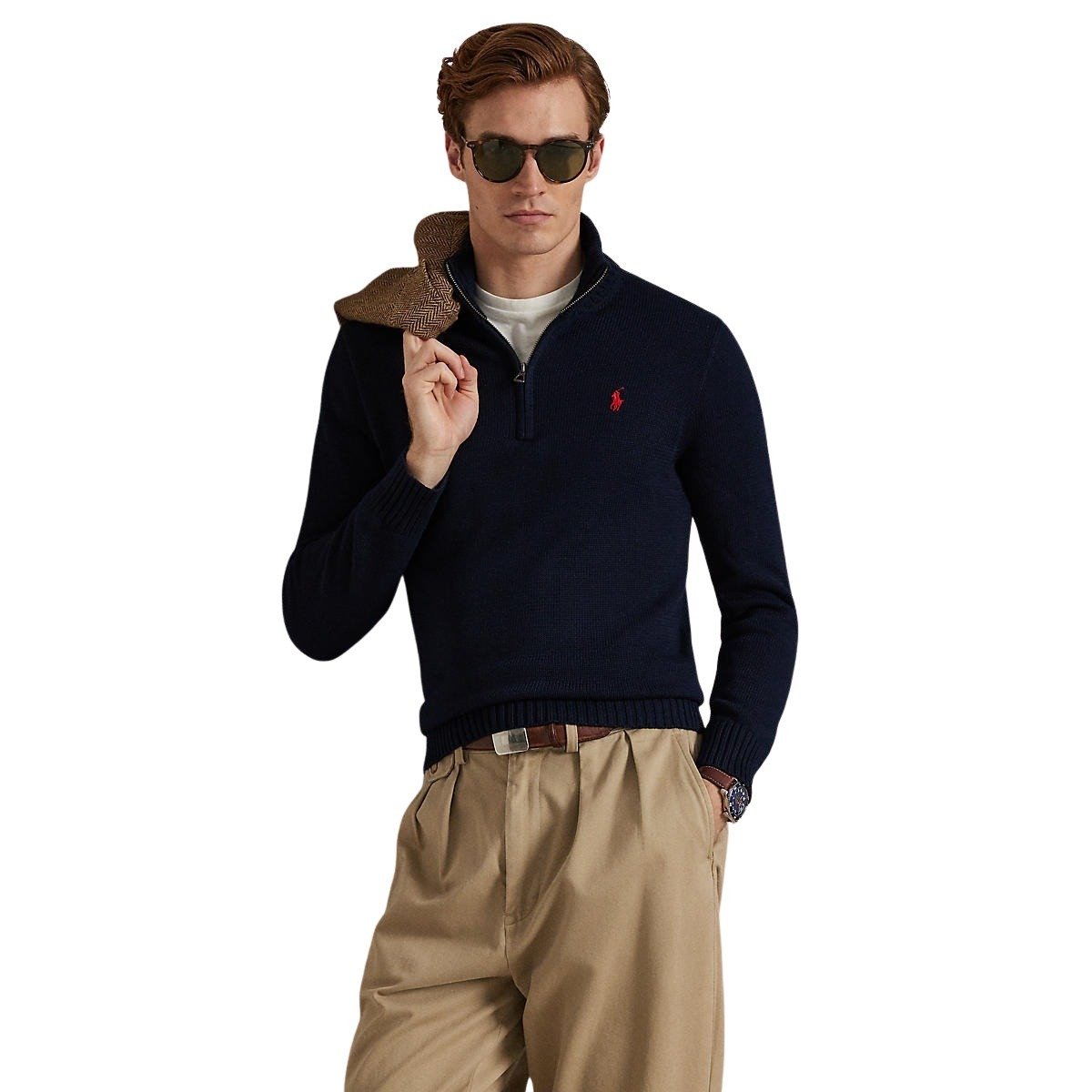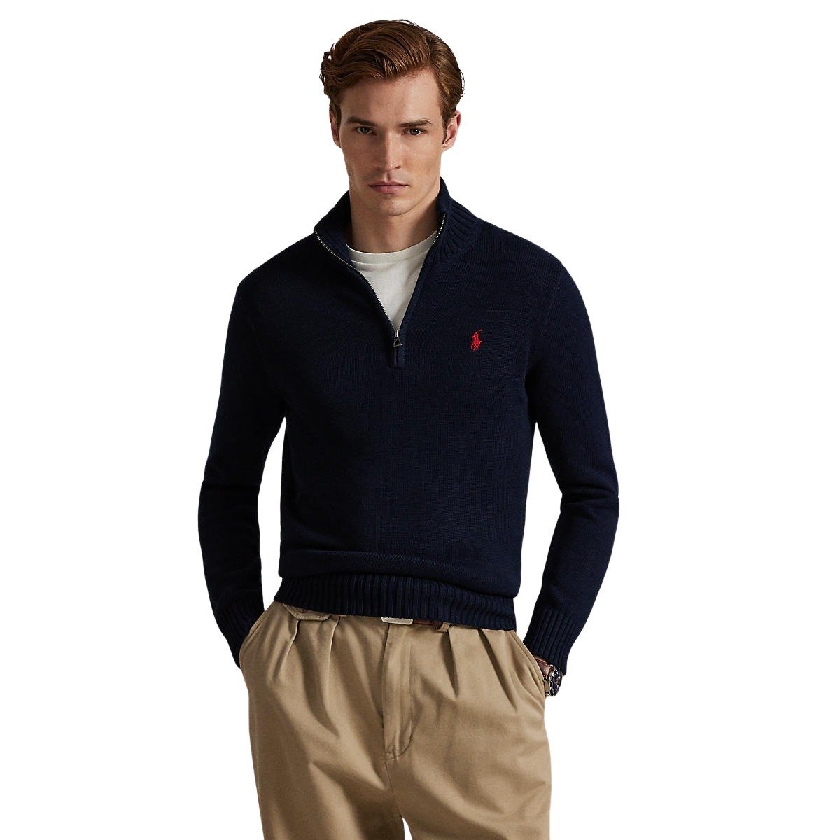 Half-zip til herre fra Polo Ralph Lauren. En klassisk half-zip-genser i myk bomull med ribbestrikkede detaljer. Den marineblå tonen og ikoniske Polo-logoen gir et sofistikert uttrykk. Perfekt til både skjorte og t-skjorte for en tidløs look.