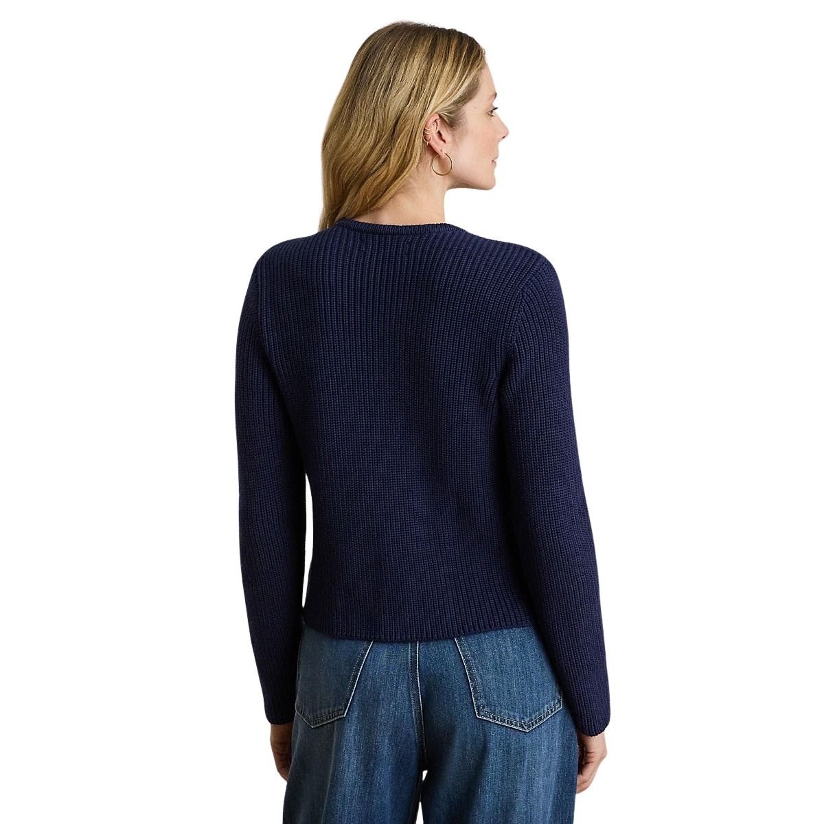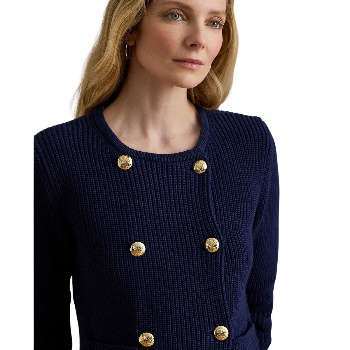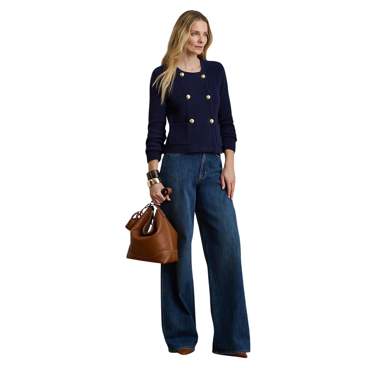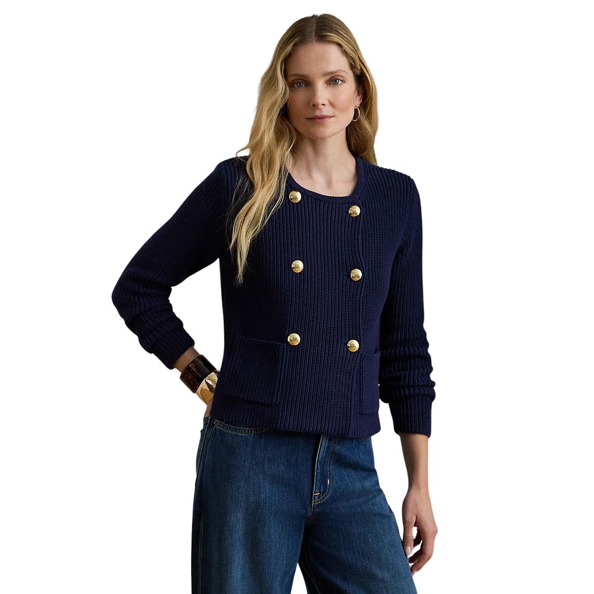 Elegant strikkejakke til dame fra Polo Ralph Lauren. Laget i myk, kjemmet bomull med ribbestrikket struktur. Den har en dobbelspent silhuett som gir et klassisk og sofistikert uttrykk. Gullfargede knapper med preget emblem setter en eksklusiv signatur.