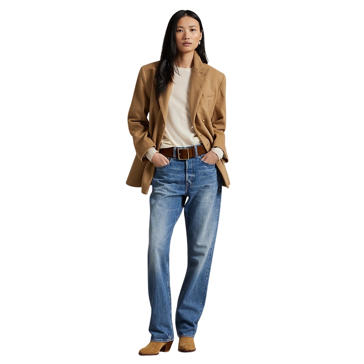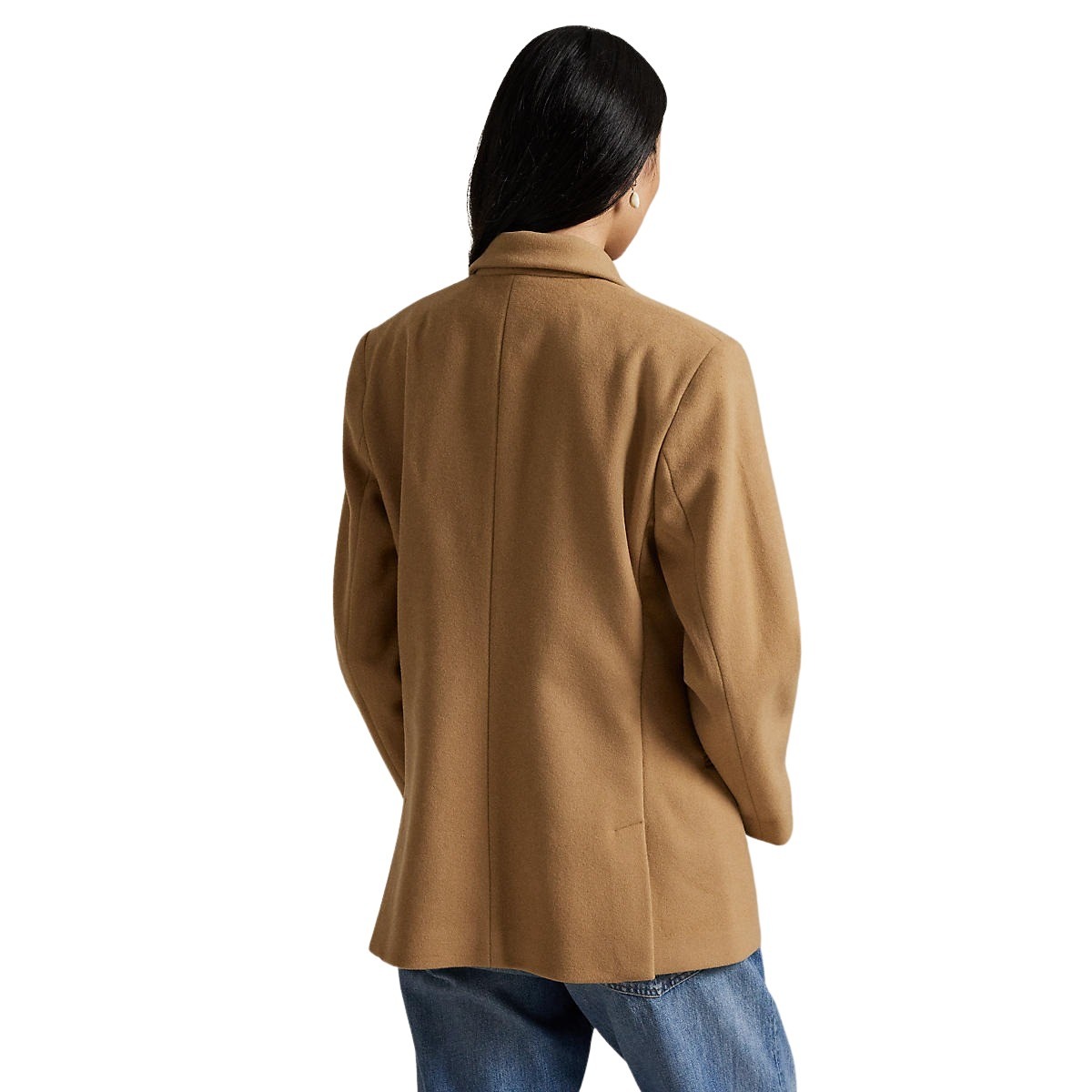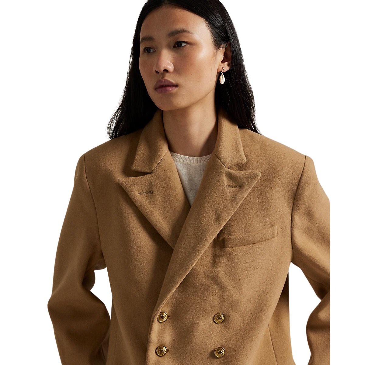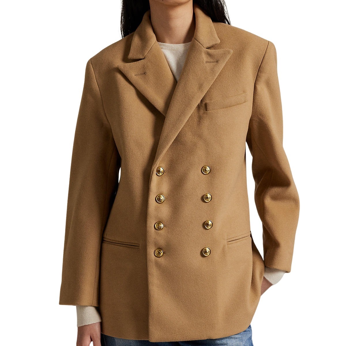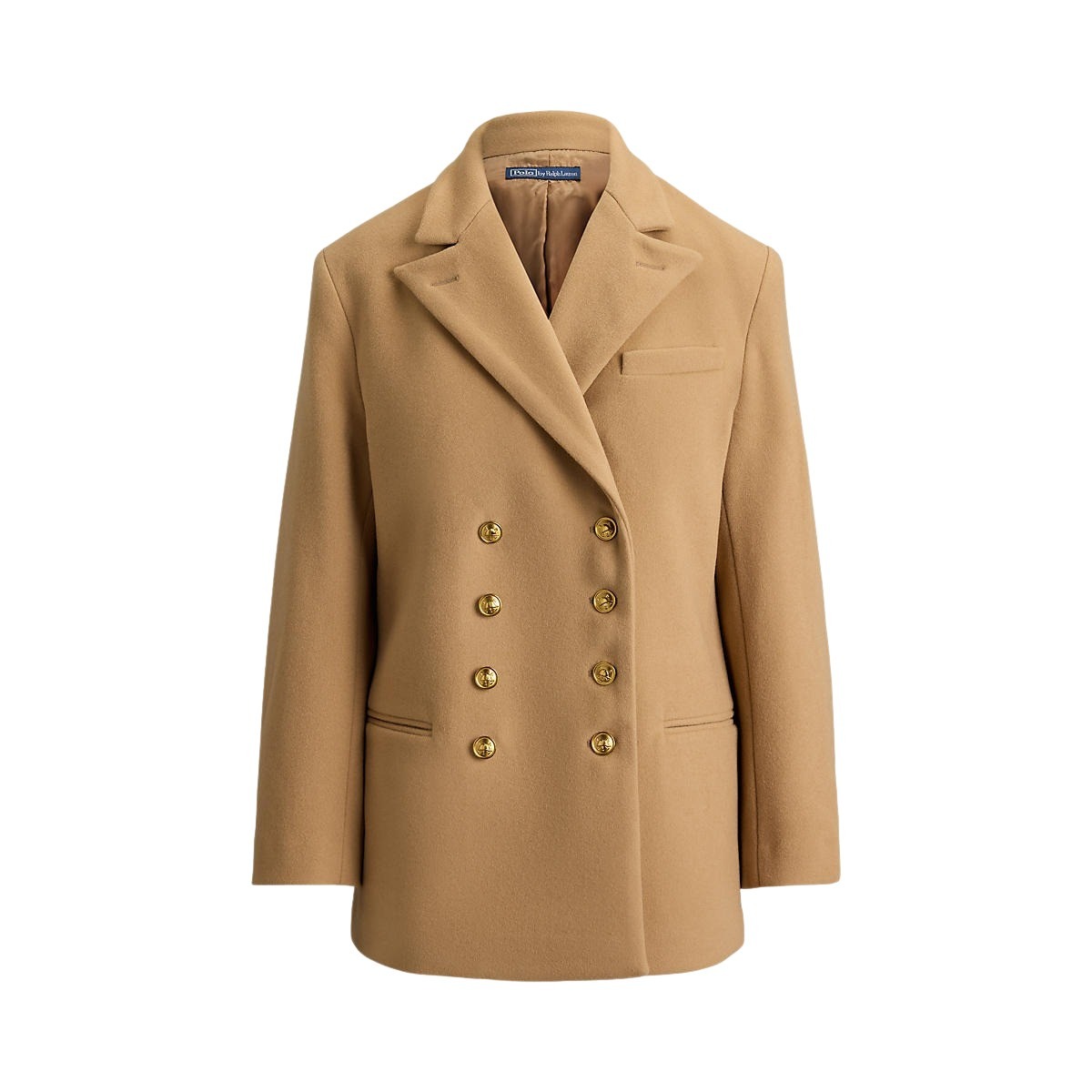 Jakke til dame fra Polo Ralph Lauren. Strukturert dobbeltspent jakke laget av italiensk meltonull. Jakken har skulderputer og delvis cuprofôr. Fremhevet av graverte signaturknapper for en tradisjonsinspirert finish.