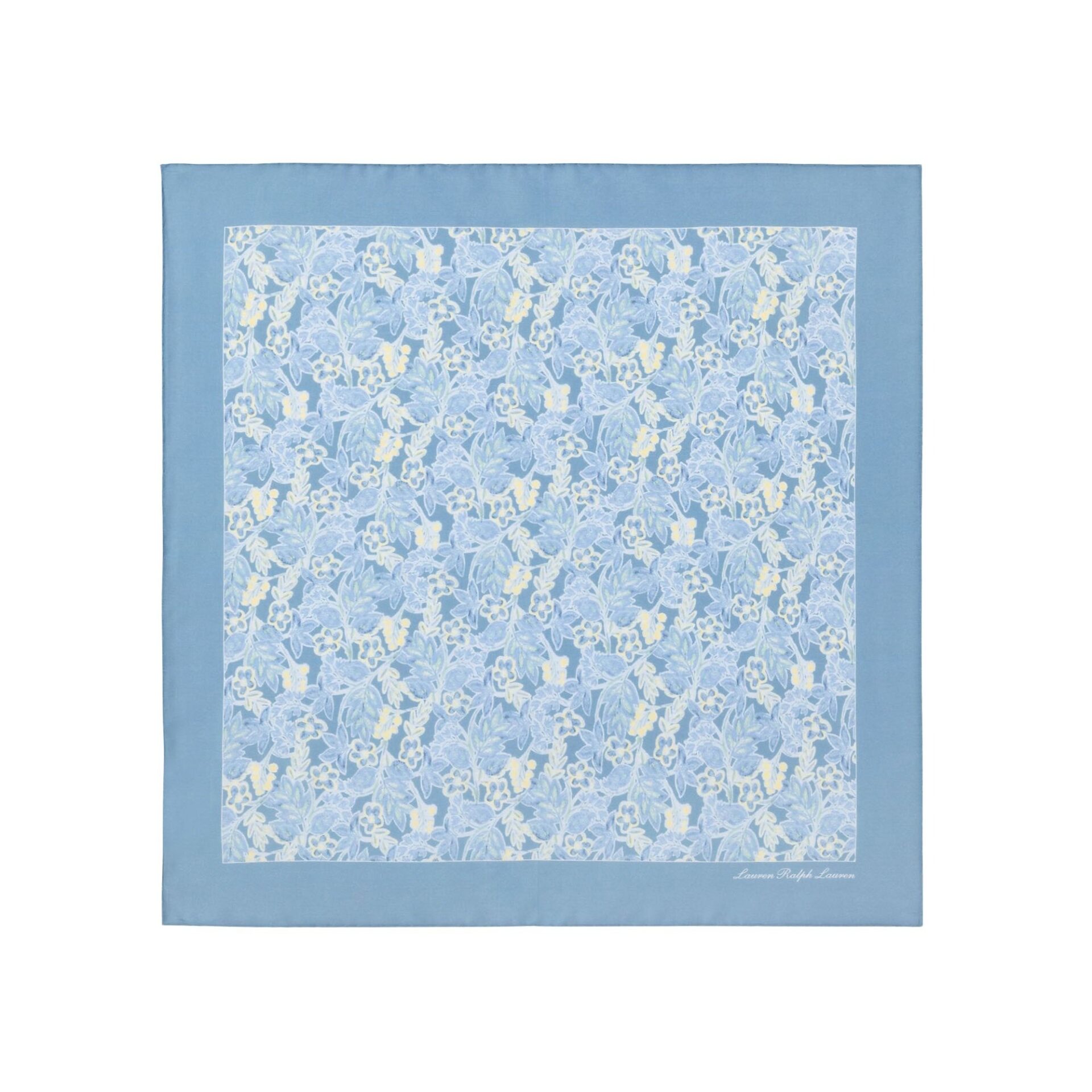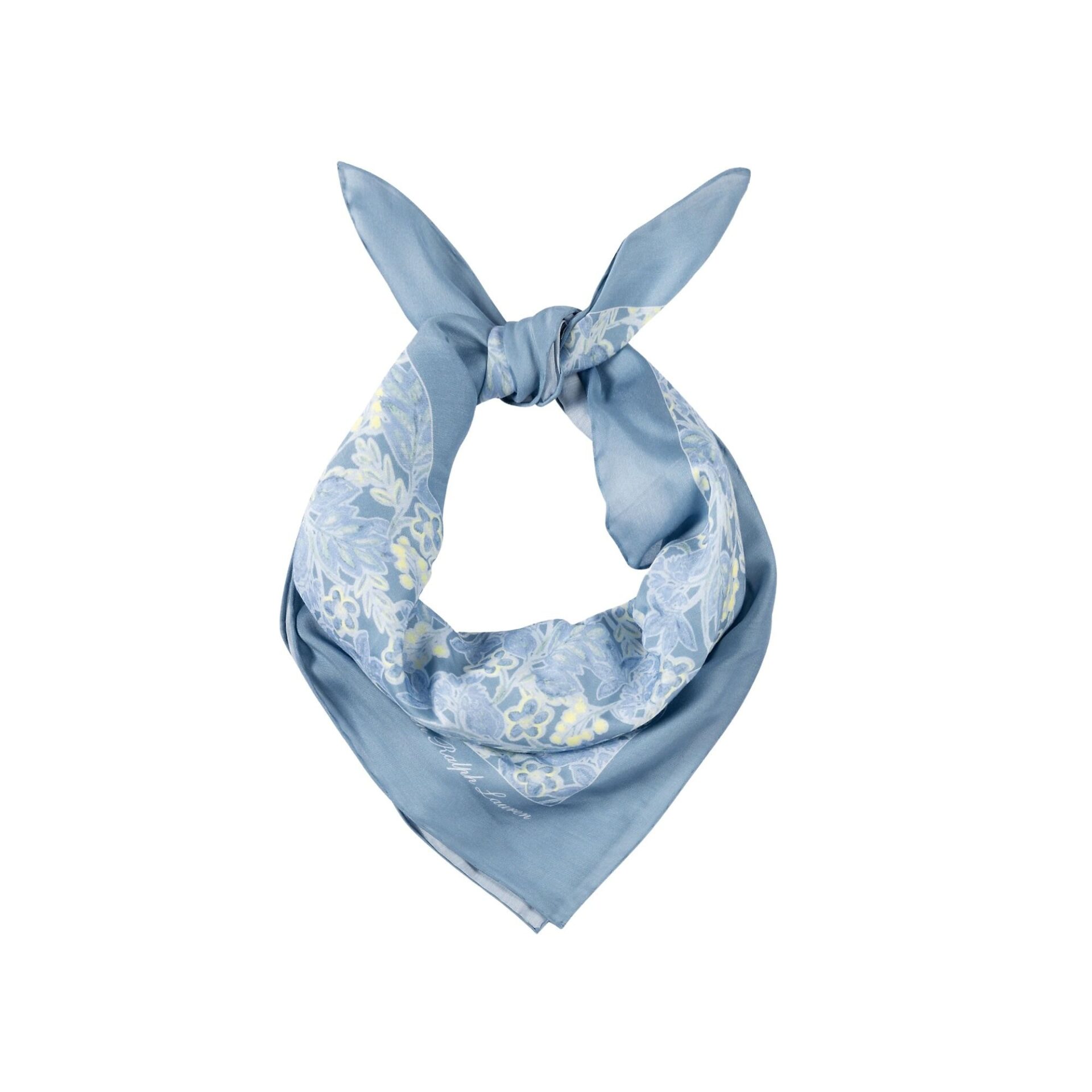 Skjerf til dame fra Polo Ralph Lauren. Kvadratisk skjerf laget i en myk blanding av bomull og silke. Det har et lyseblått blomsterprint som gir et elegant og feminint uttrykk. Lauren-signaturen i hjørnet setter en eksklusiv finish.