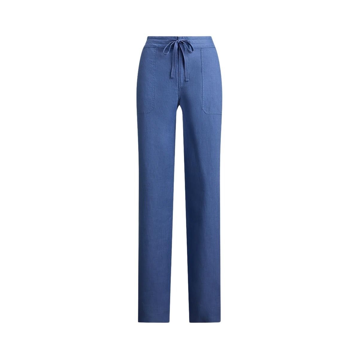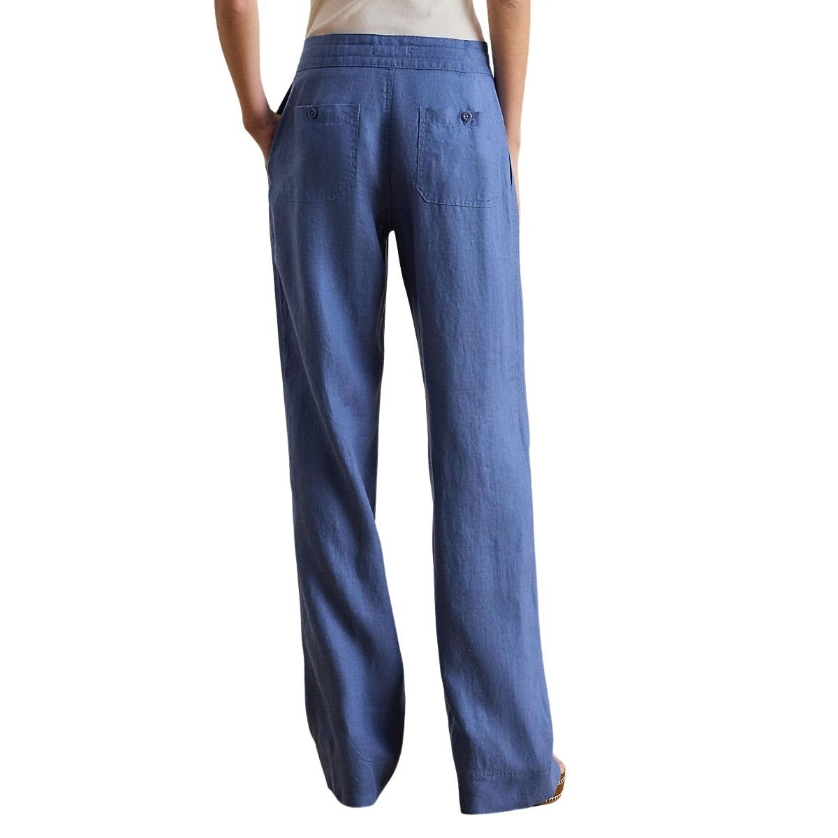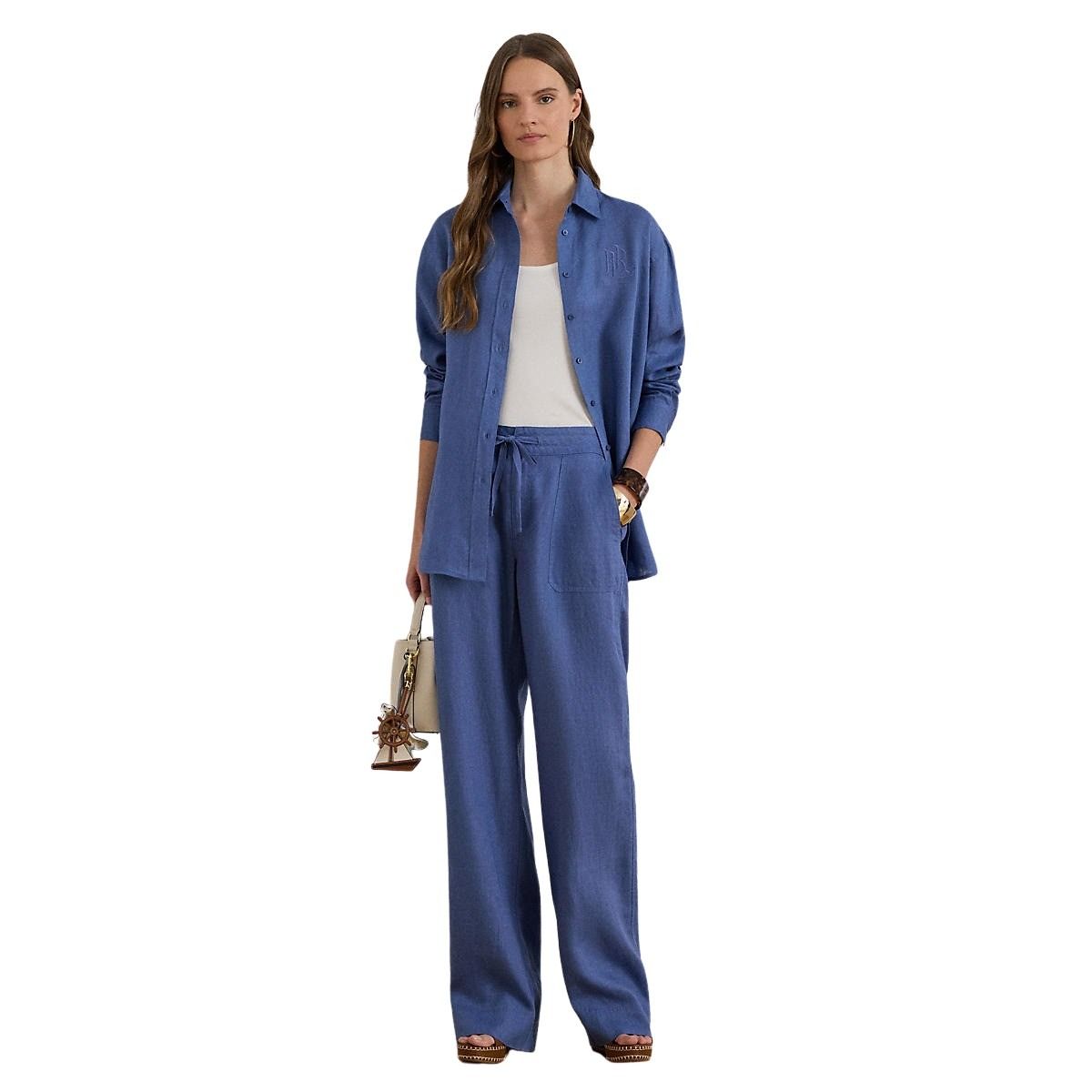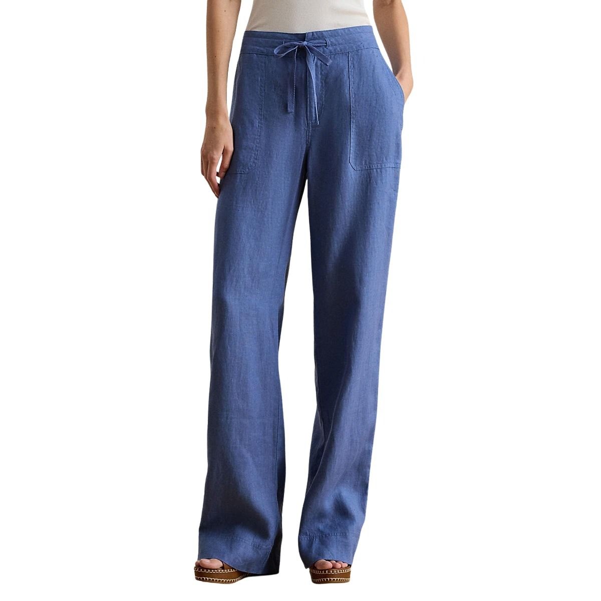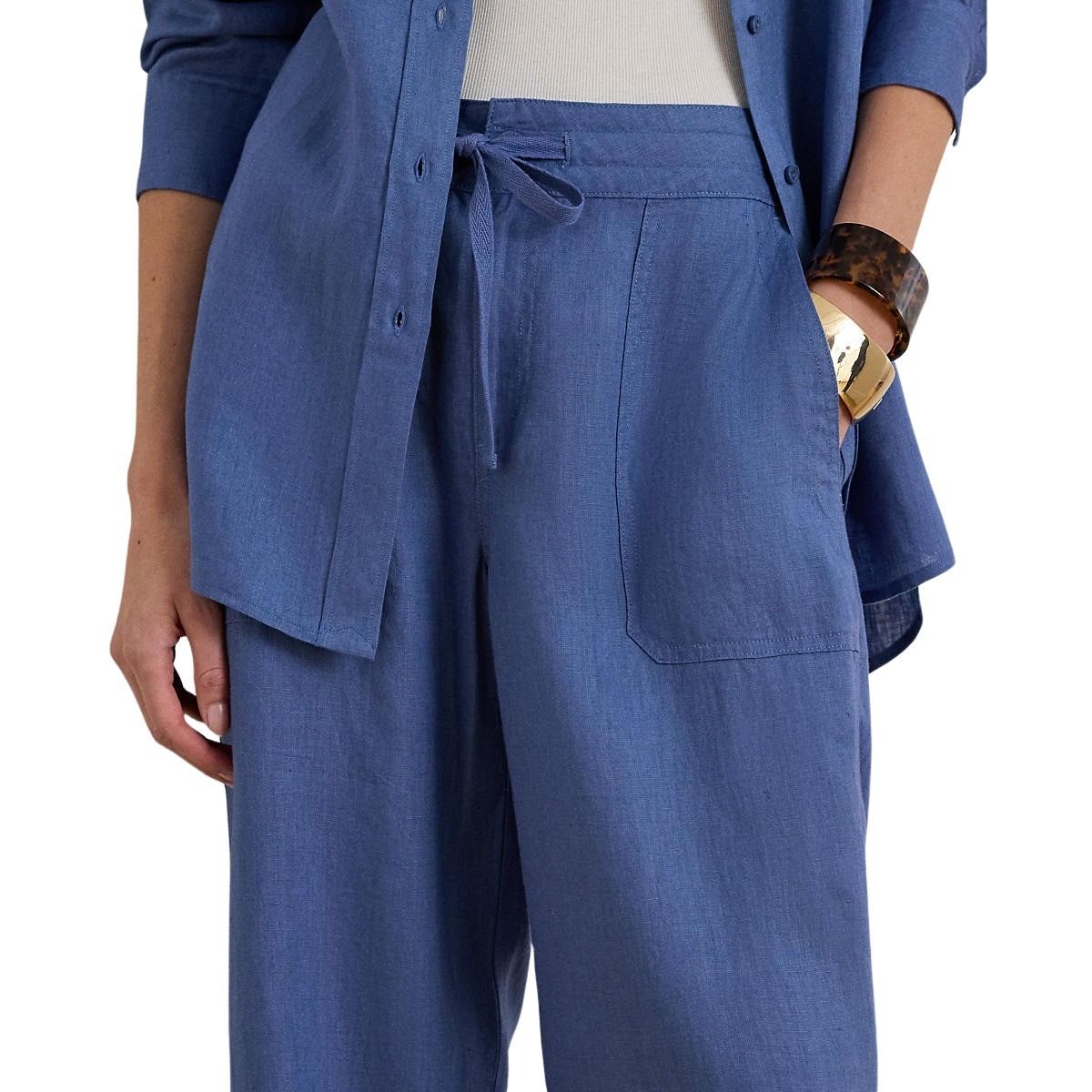 Bukse til dame fra Polo Ralph Lauren. Bukse med vide ben og en flatterende, middels høy midje. Llaget i lett og luftig lin som gjør dem perfekte på varme dager. Elastisk liv med snøring gir en avslappet stil, mens graverte metalldetaljer setter en diskré signatur.