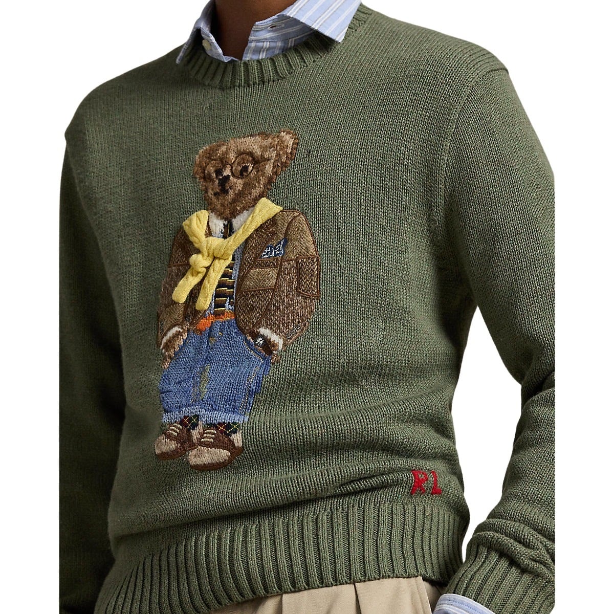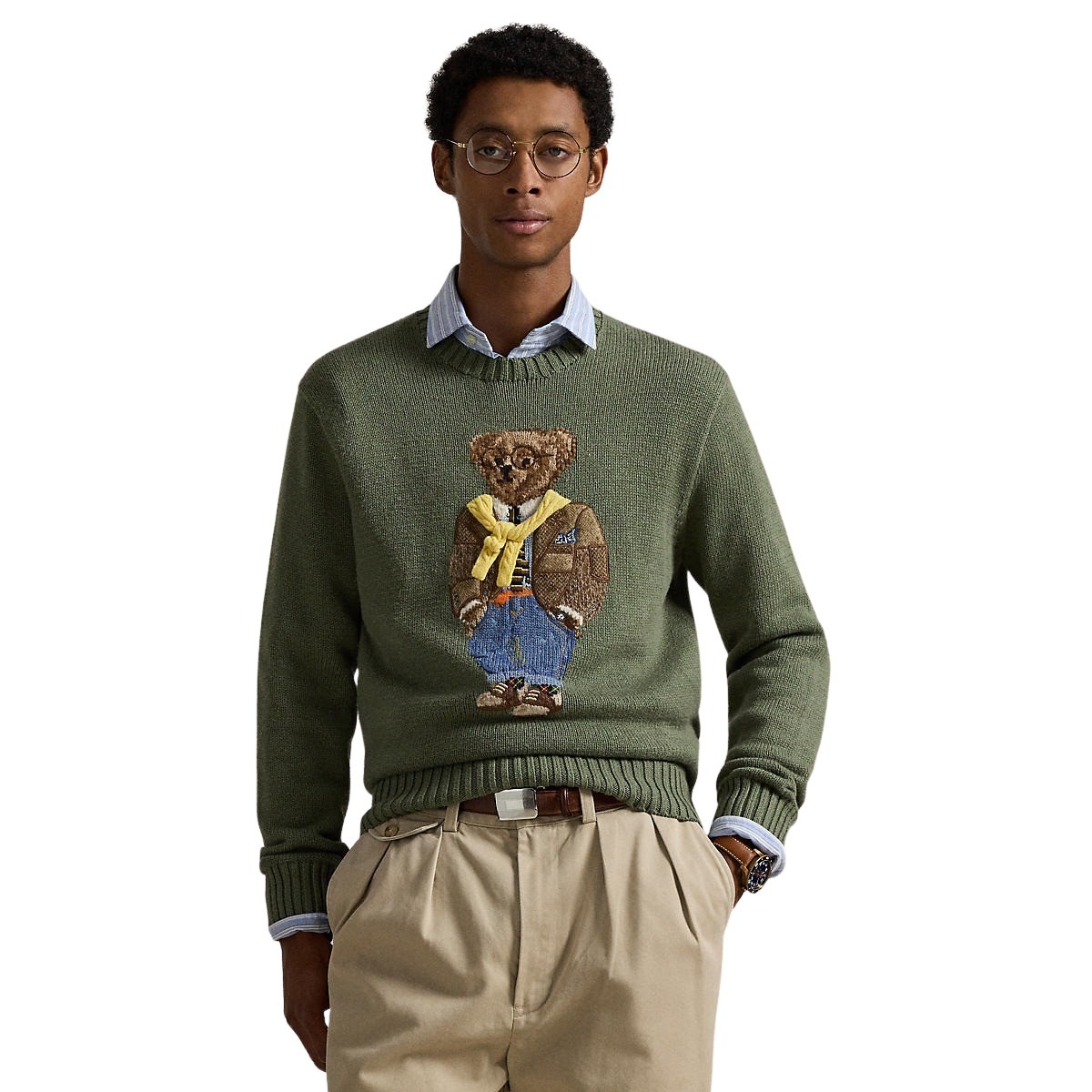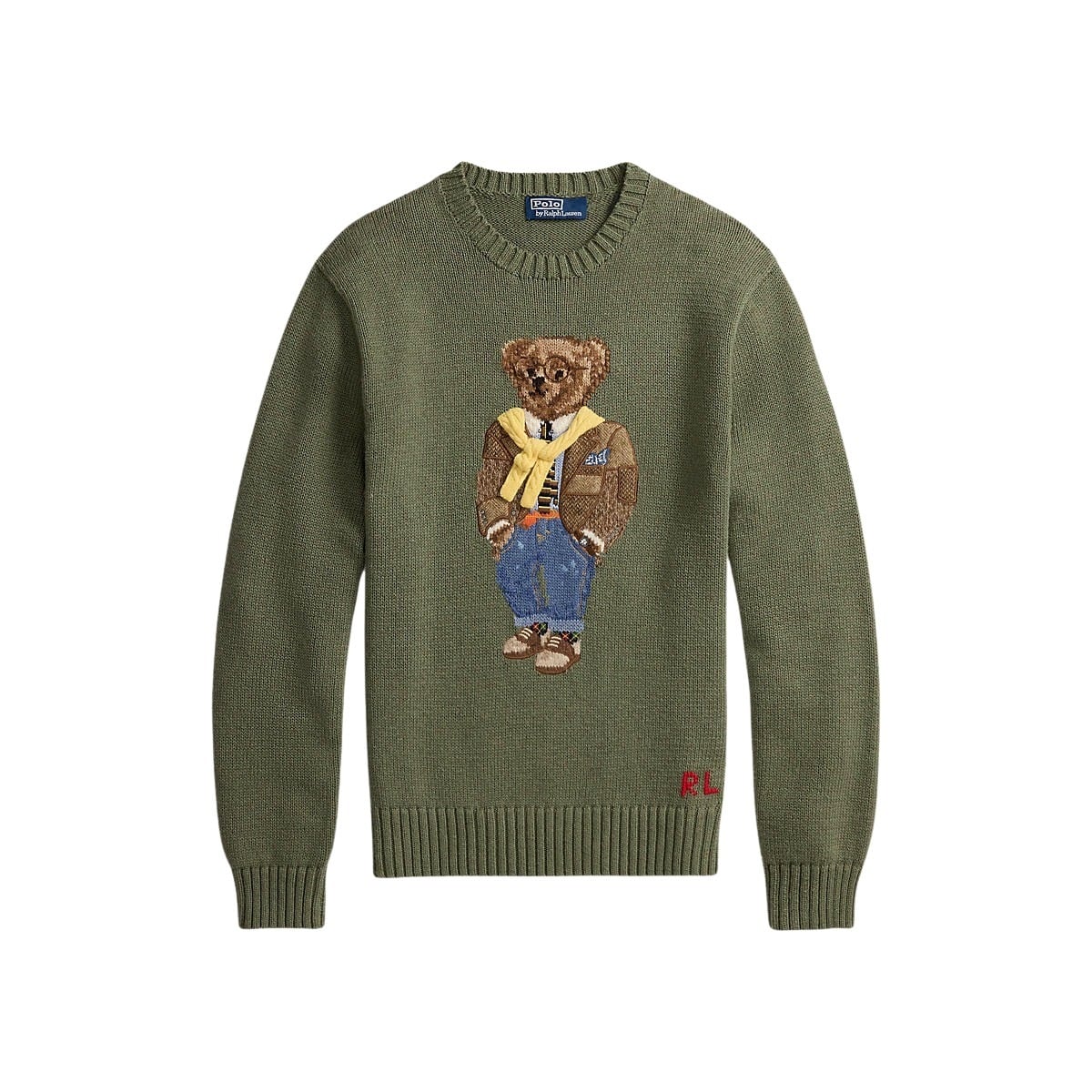 Genser til herre fra Polo Ralph Lauren. Brodert med deres ikoniske Polo Bear på brystet i et detaljert og fargerikt design. Denne varianten har en militærgrønn base og fremstiller bjørnen kledd i et preppy og lag-på-lag-inspirert antrekk.