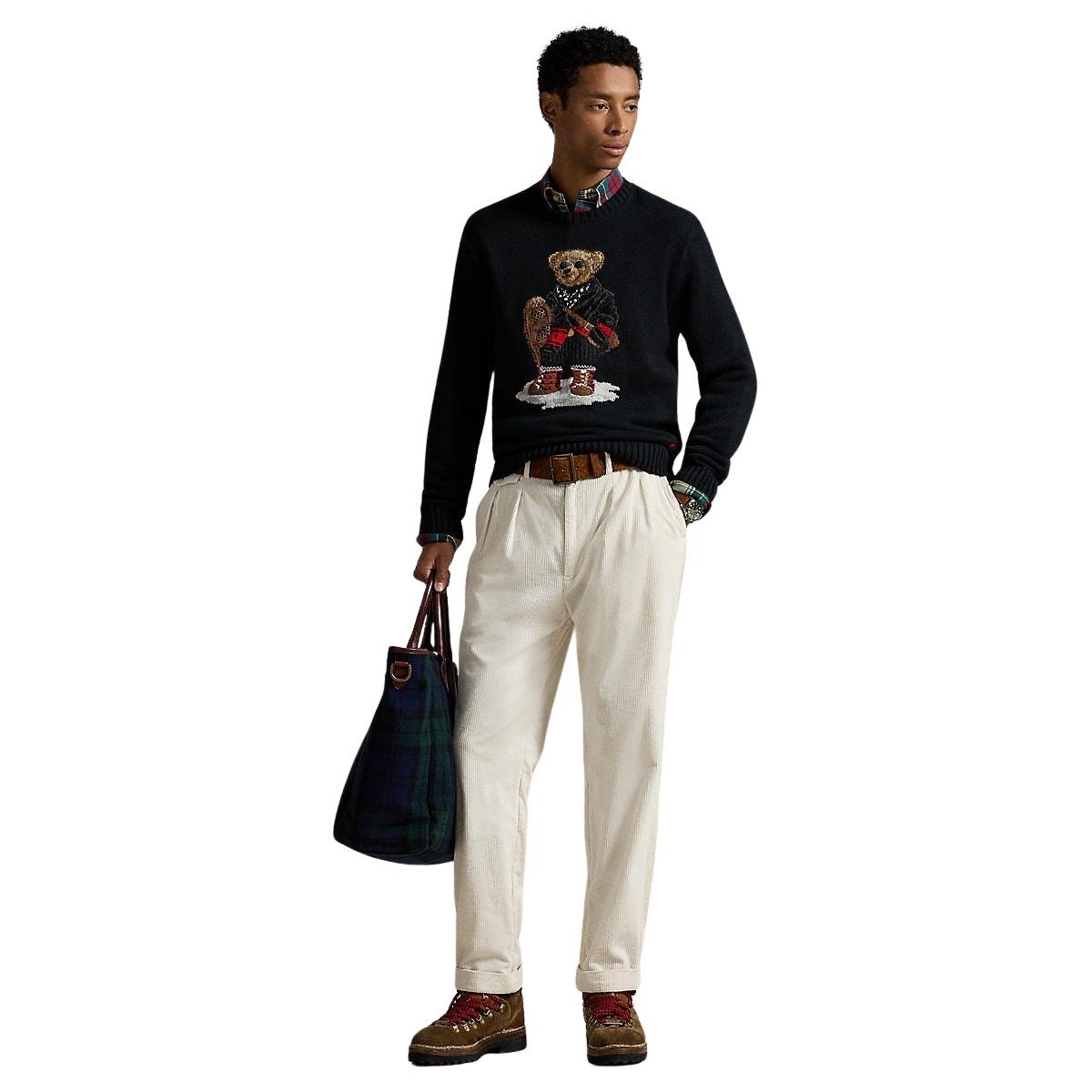 Genser til herre fra Polo Ralph Lauren. En eksklusiv bomull- og kasjmirgenser med den ikoniske Polo Bear, kledd i et vintagestil-antrekk med truger. Raffinerte detaljer som håndbroderte initialer gir genseren sjarm.