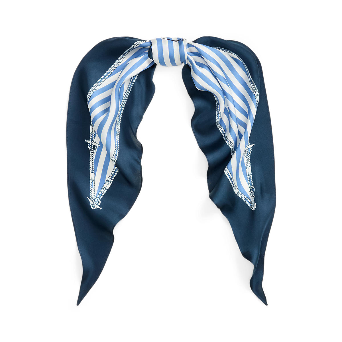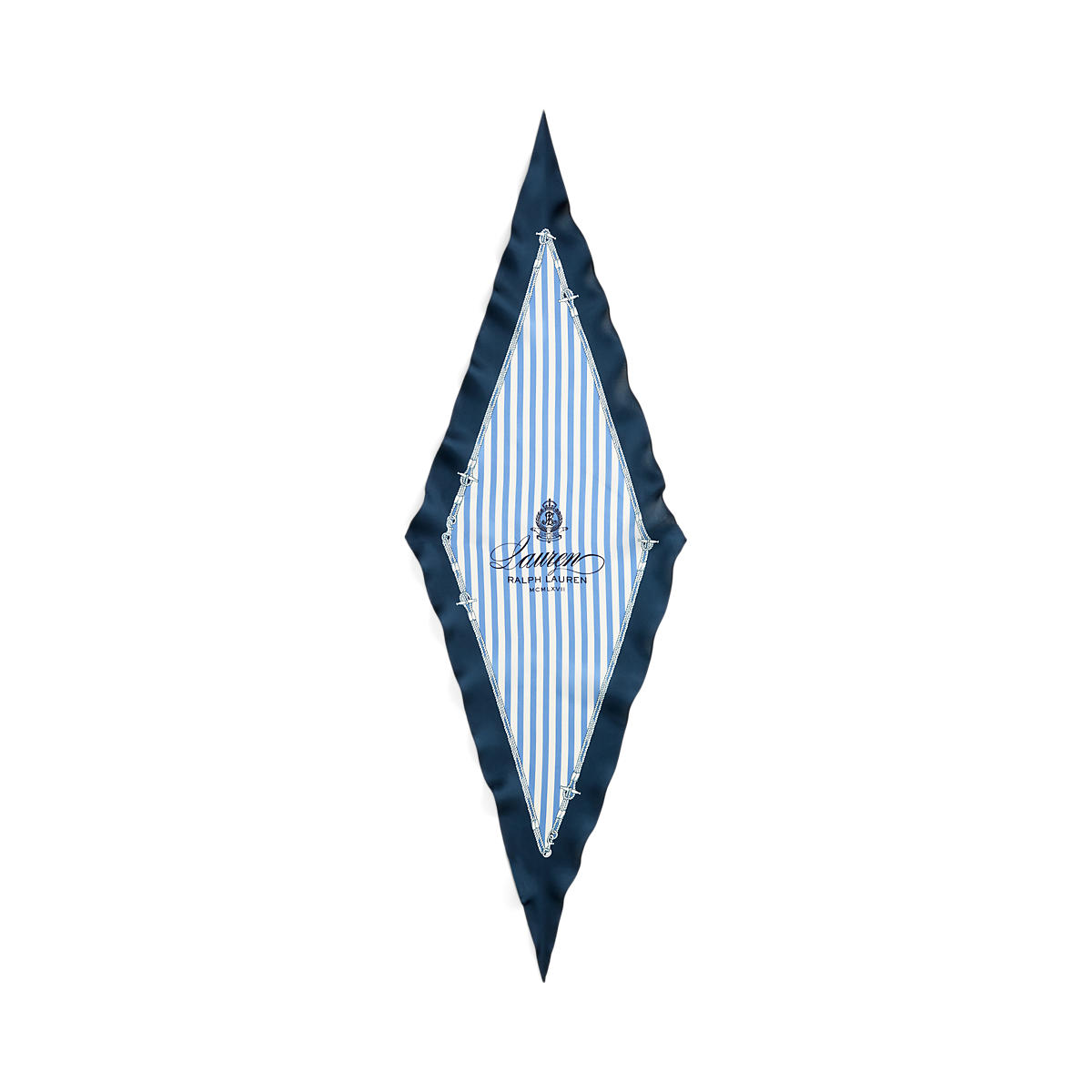 Diamantformet skjerf fra Polo Ralph Lauren. Laget av myk, flytende silke med et maritimt uttrykk. Designet kombinerer klassiske striper, et tauinspirert kantmotiv og Lauren sin ikoniske crest for et tidløst preg.