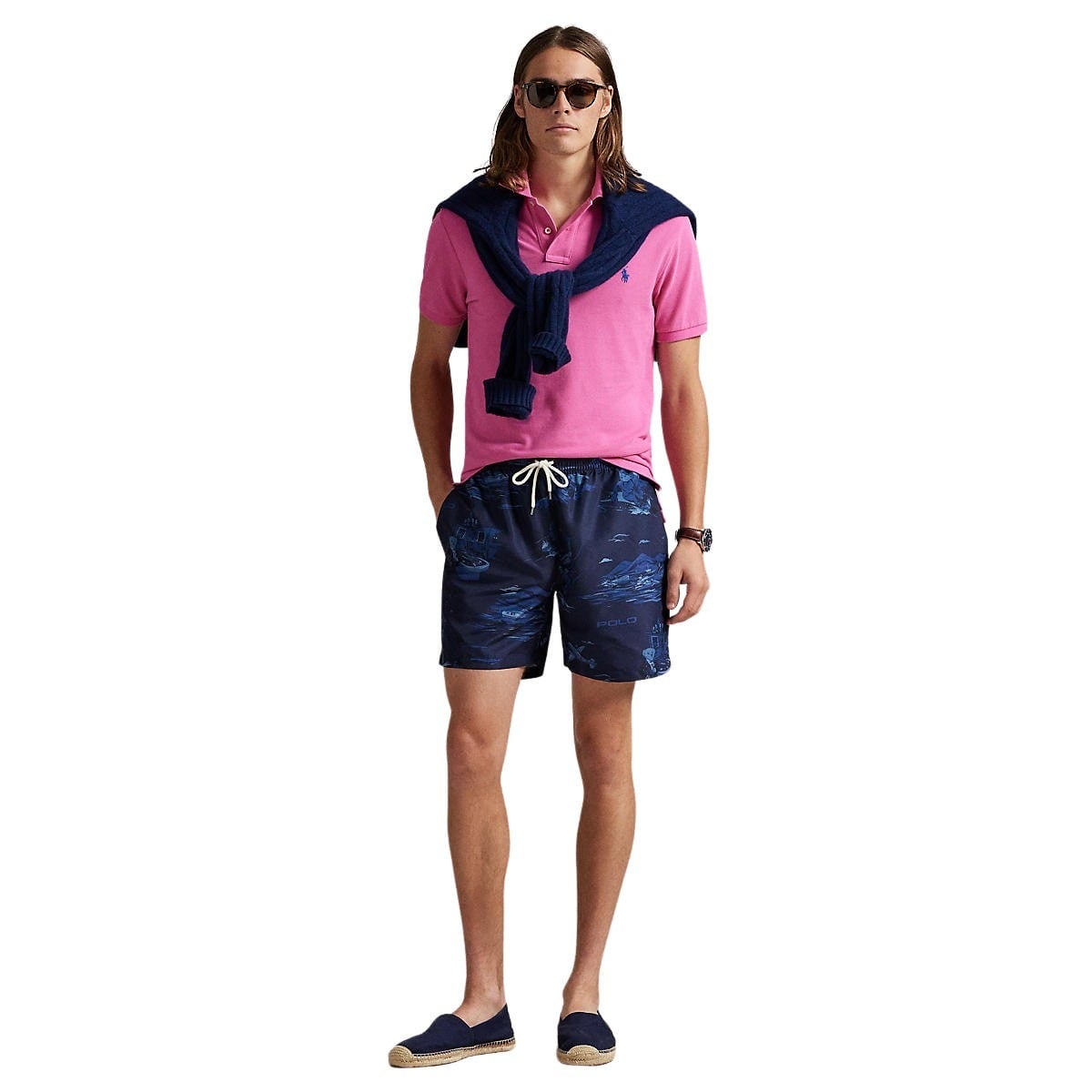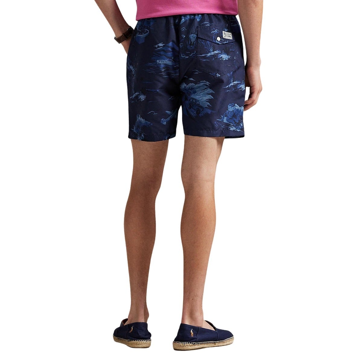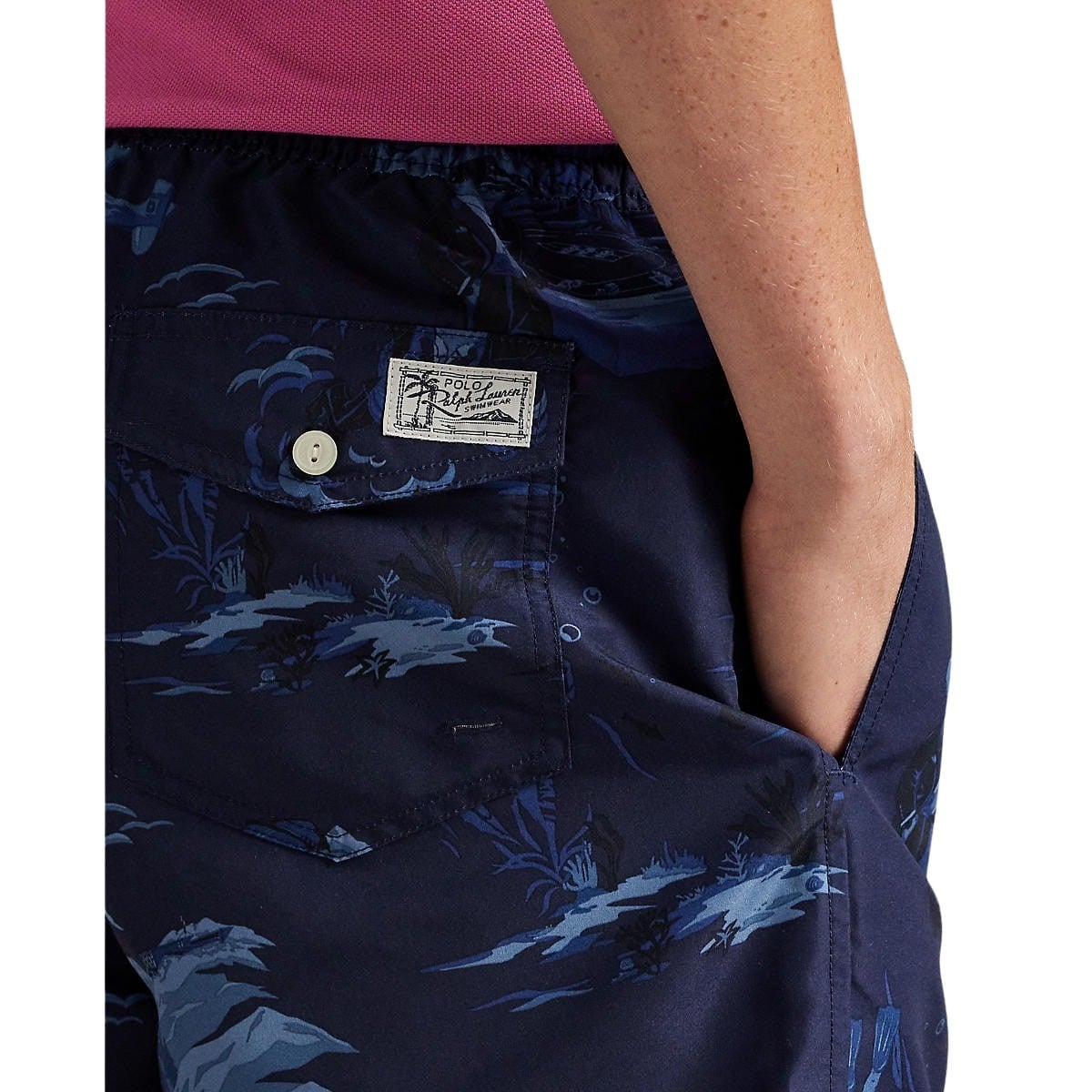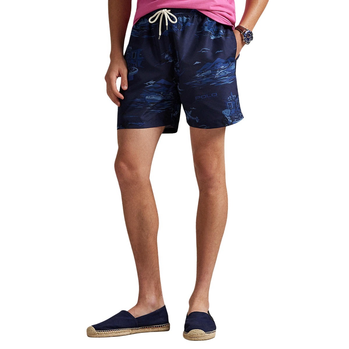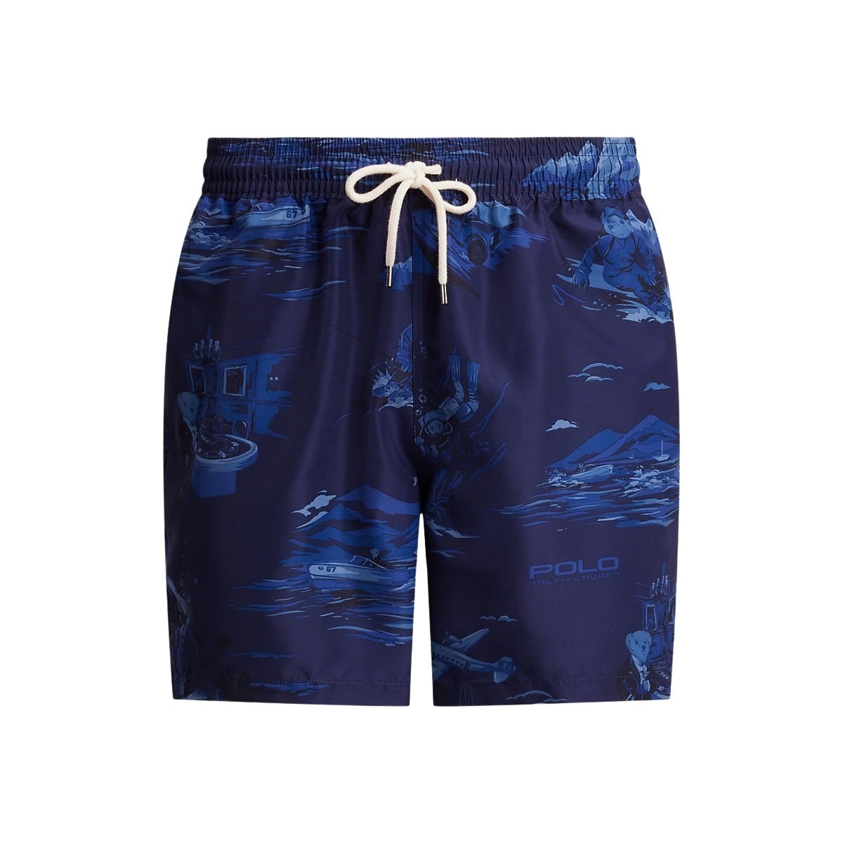 Badeshorts til herre fra Polo Ralph Lauren. En klassisk badeshorts i en mørk marineblå base med et karakteristisk all-over grafisk print i blåtoner. Mønsteret inkluderer typiske Polo-motiver, et signaturpreg som gir shortsen et lekent, men samtidig eksklusivt uttrykk.