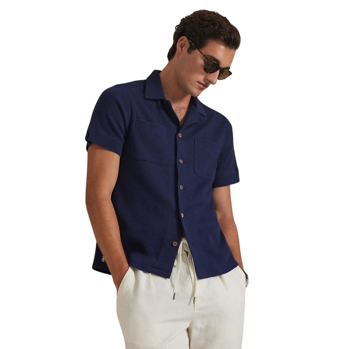 Waffle-Knit Cotton-Linen Camp Shirt – Marine
