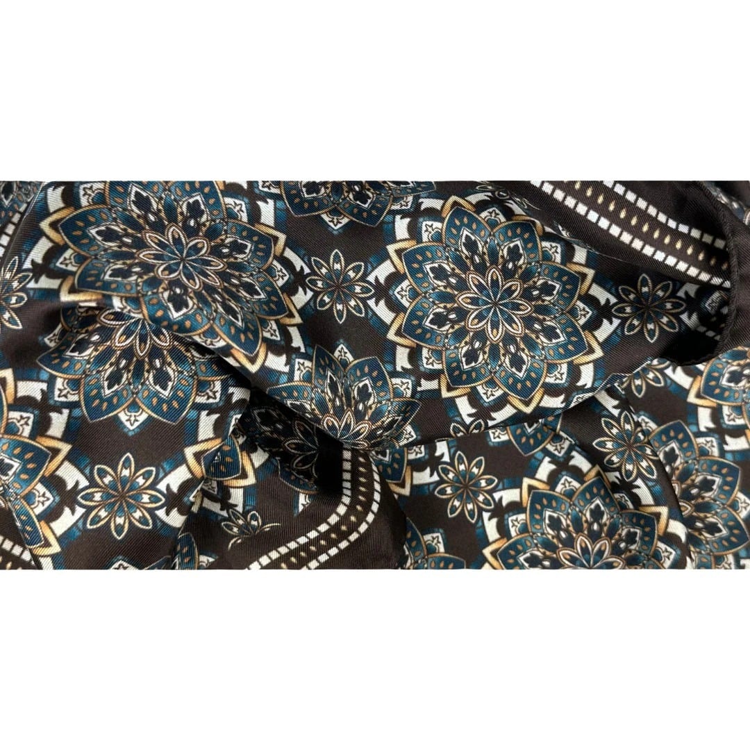 Bandana til herre fra Portia. Designet med et vakkert detaljert geometrisk mønster i bruntoner. Laget av silke fra Italia. Et allsidig stykke som både kan pynte opp hverdagstilen og formelle antrekk.