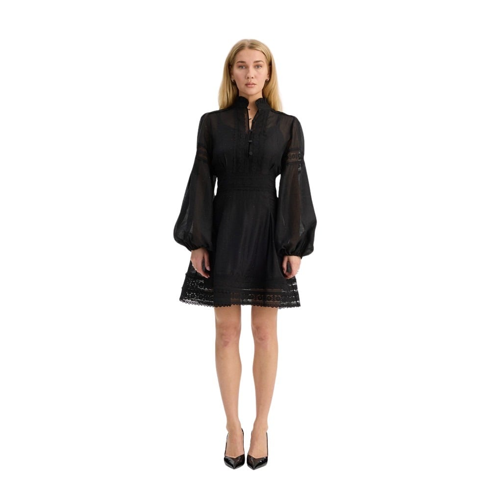 Kjole til dame fra Ravn Ravn. En elegant minikjole med et sofistikert og romantisk uttrykk. De voluminøse ermene, høye halsen og lekre blondedetaljene gir kjolen et luksuriøst preg. Perfekt både til fest og middager når du vil kombinere femininitet med tidløs stil.