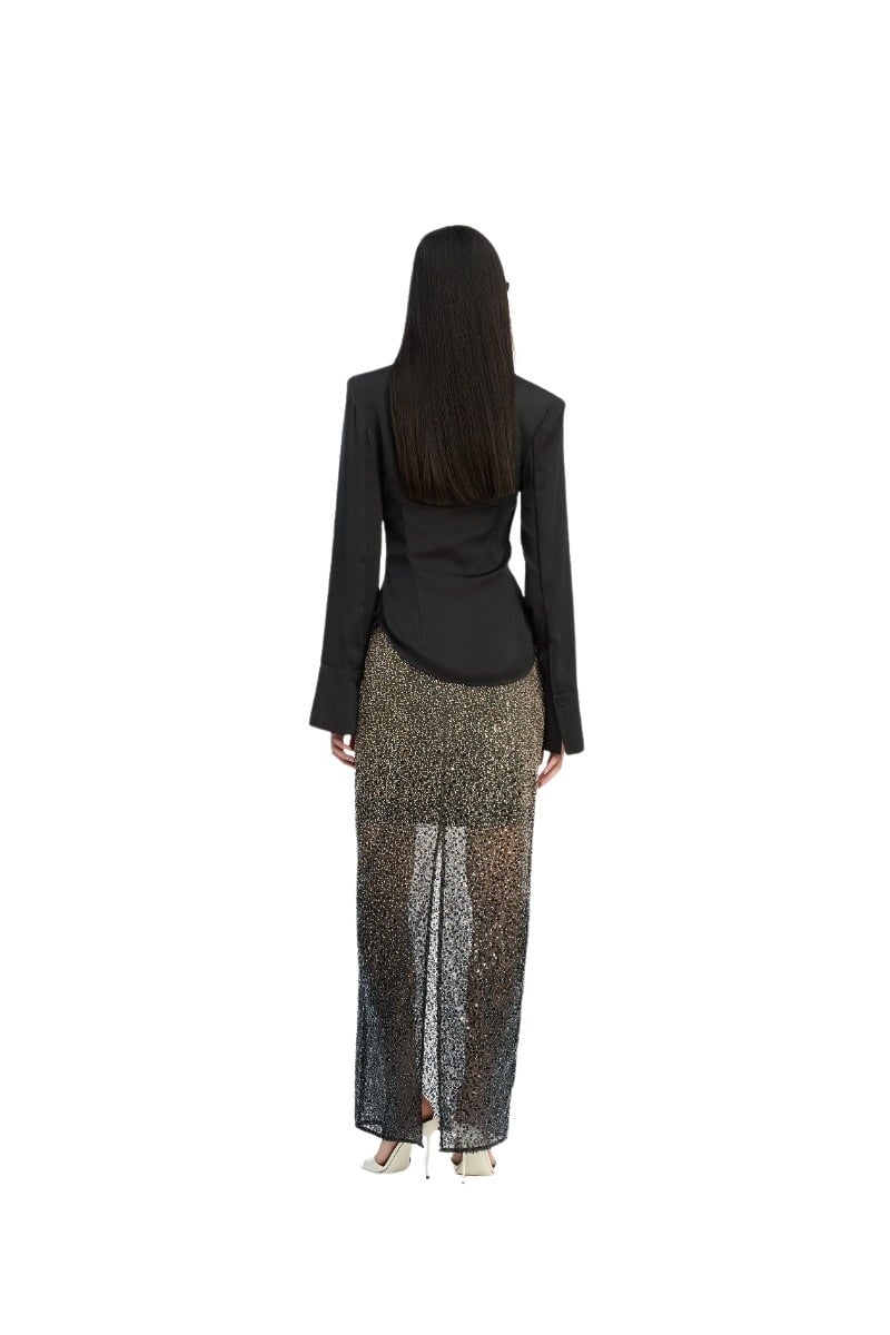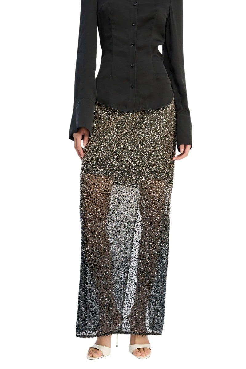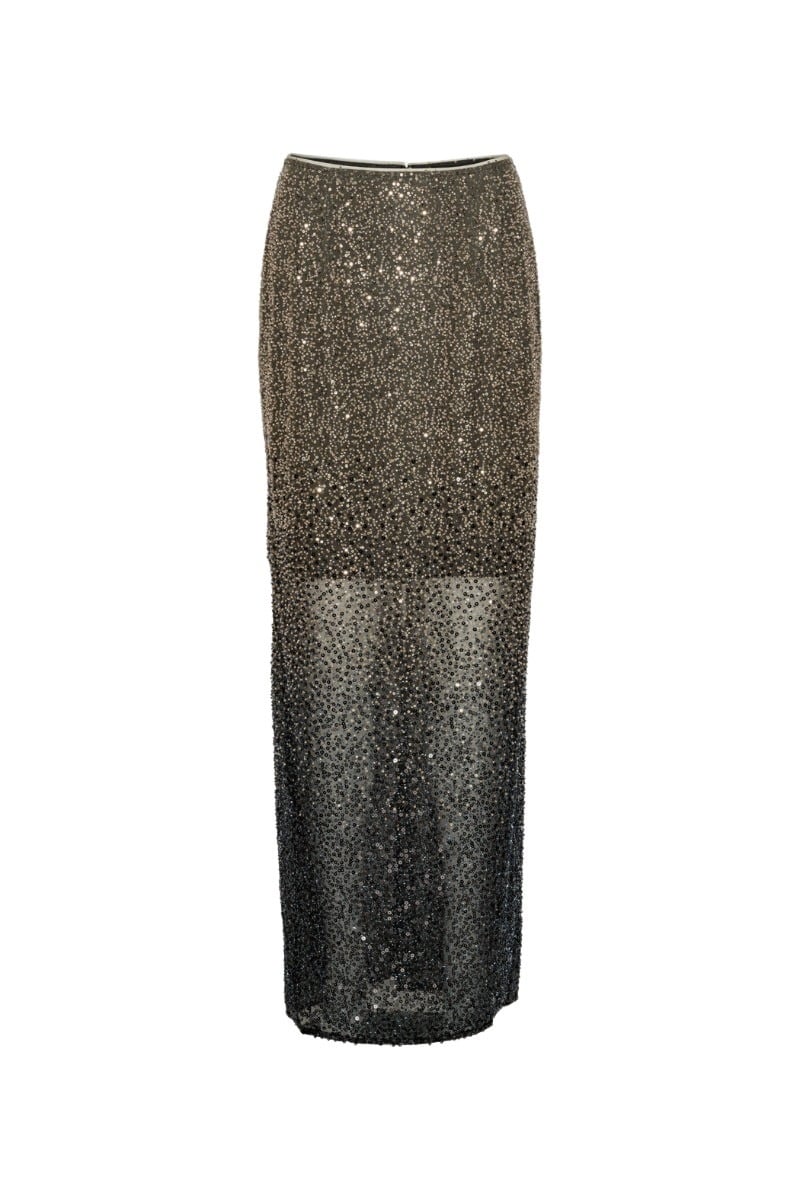 Maxiskjørt til dame fra Rotate. Elegant skjørt utsmykket med skimrende paljetter og konstruert med et mykt fôr og en rett silhuett som følger kroppens form.