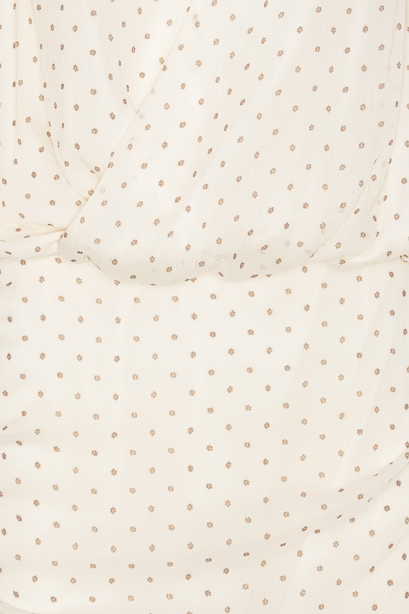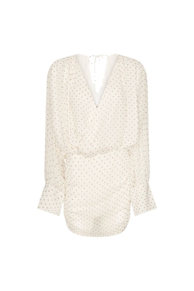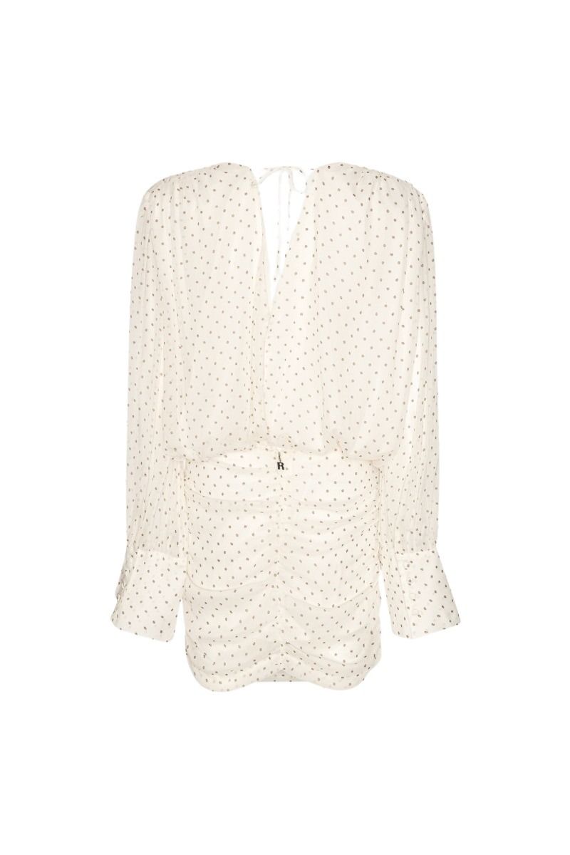 Chiffon LS V-neck Dress fra Rotate. En kort kjole i lett chiffon med diskret prikkemønster og en flatterende, drapert silhuett. Den har dyp V-hals, lange ermer med volum og markerte mansjetter, samt definert midje som fremhever fasongen. Åpen rygg med knytedetalj og fôret utførelse gjør den perfekt til fest og sesongens spesielle anledninger.