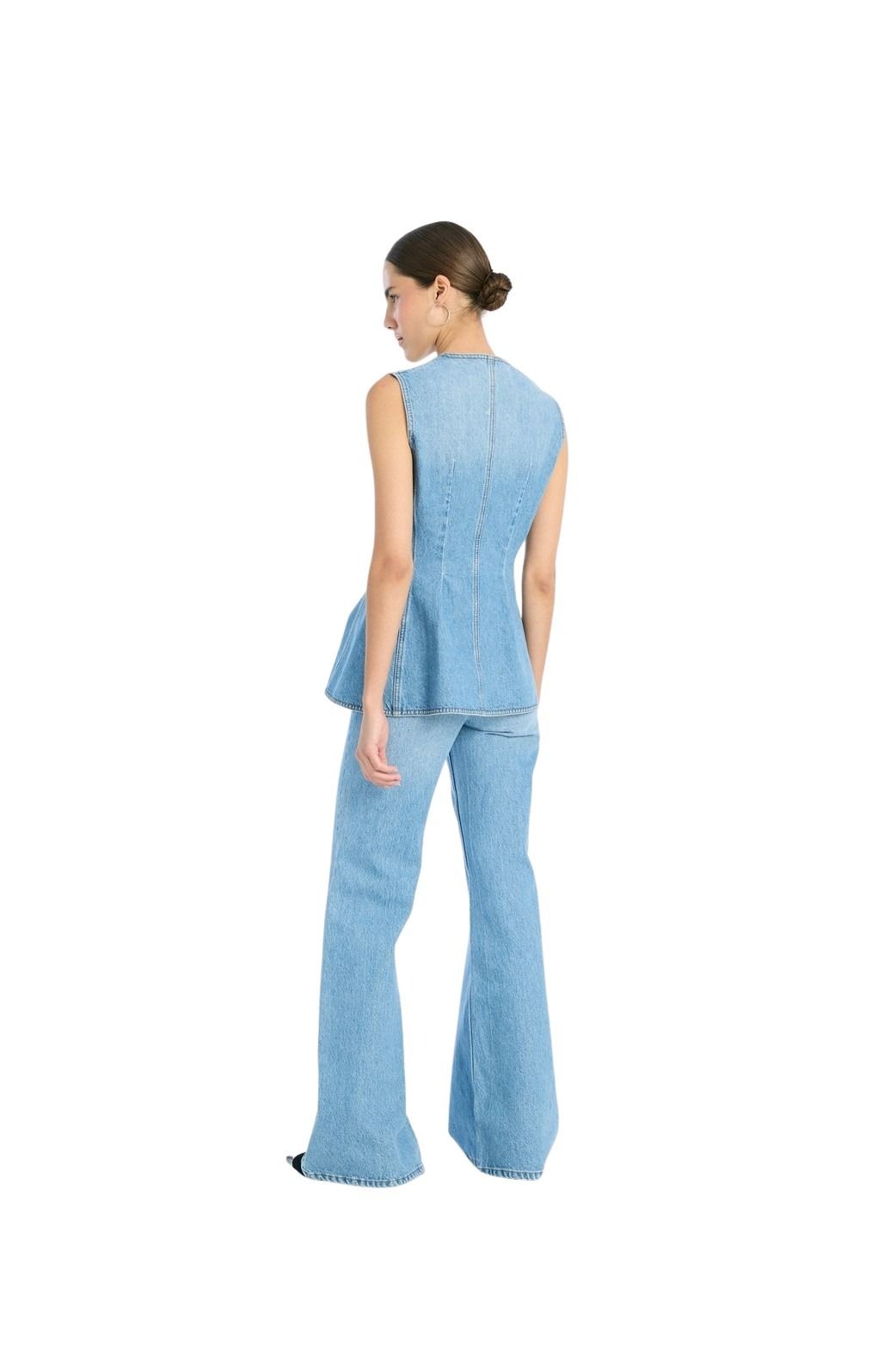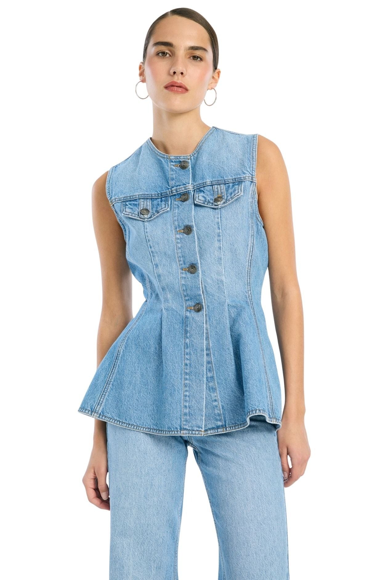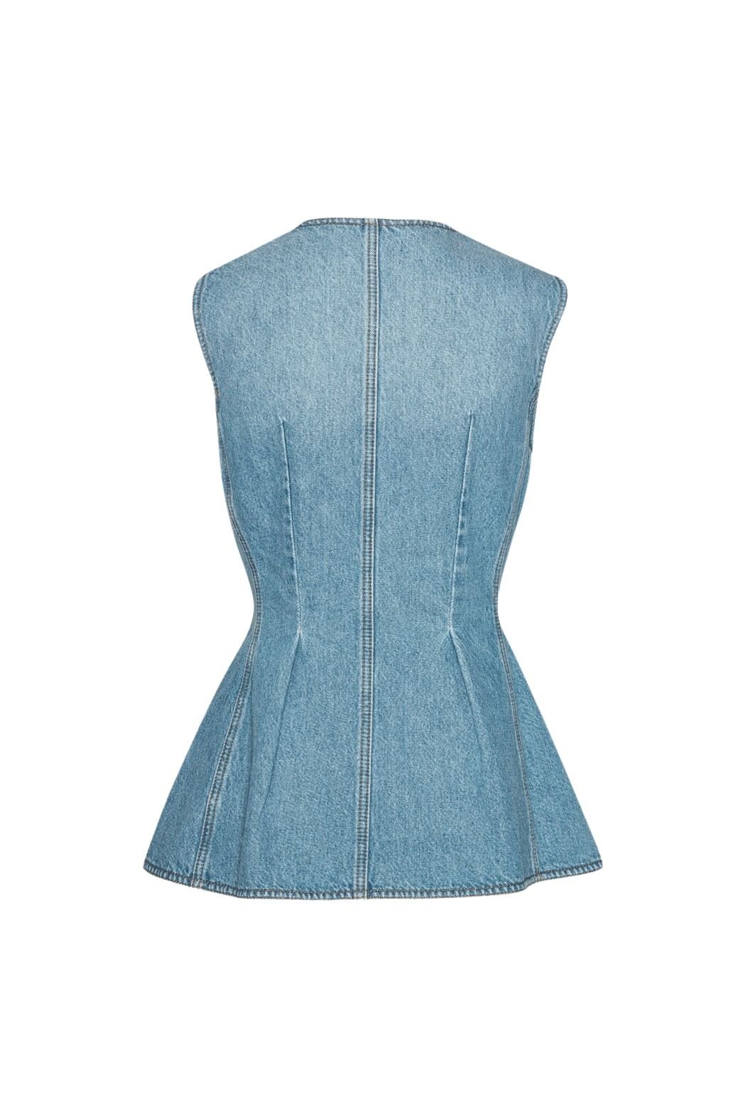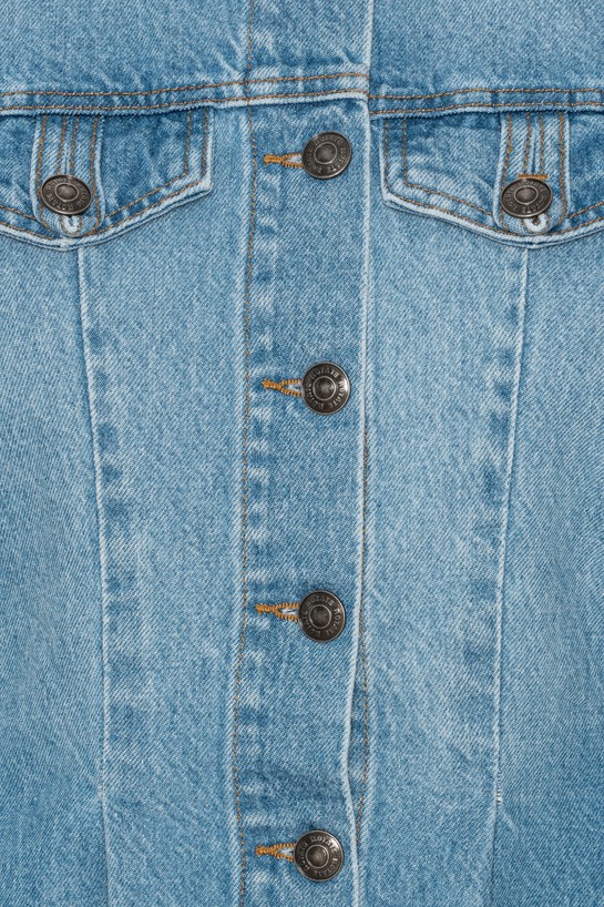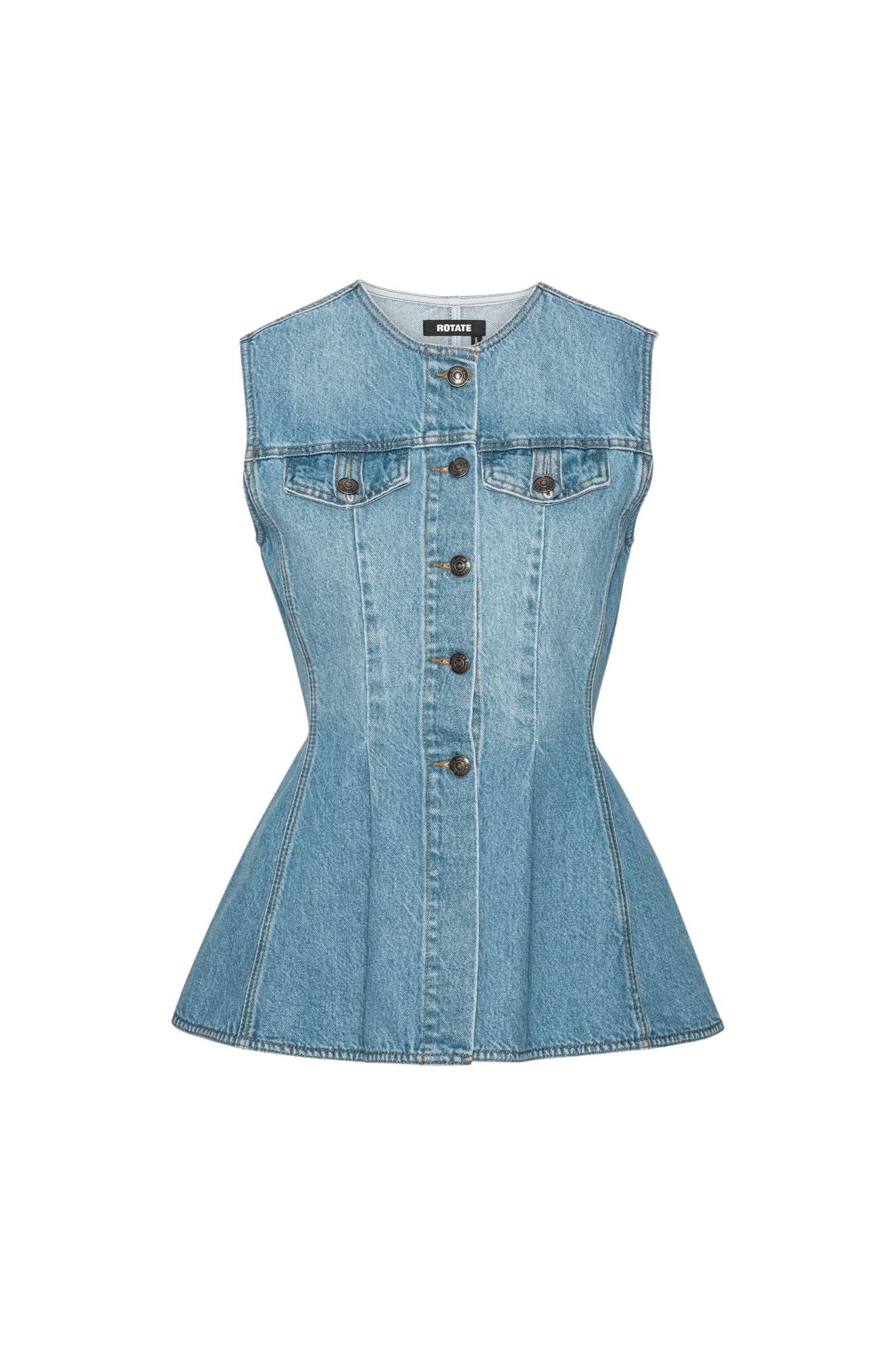Feminin topp til dame fra Rotate. Toppen kombinerer en klassisk denimlook med en markert og flatterende midje som gir en nydelig silhuett. Knappestolpen og brystlommene tilfører et røft, moderne preg, mens den utsvingte fasongen gjør toppen både unik og stilfull. Perfekt til både jeans, skjørt og shorts for et gjennomført, trendbevisst antrekk.