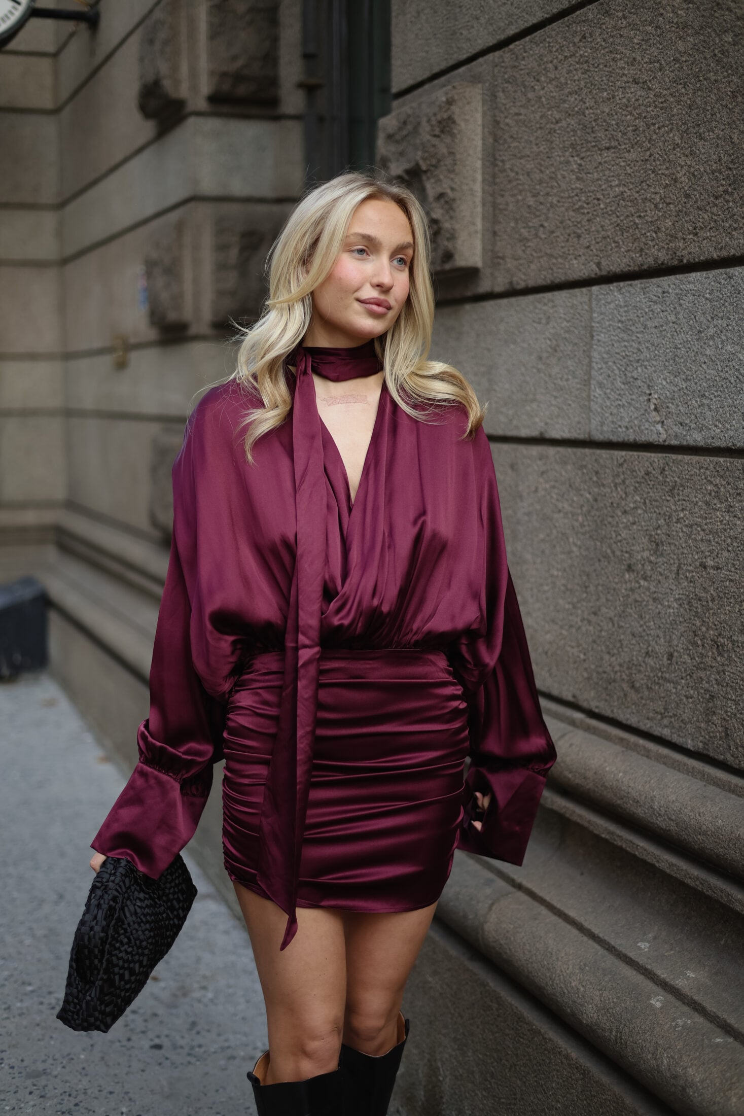 Kjole til dame fra Rotate. Kjolen har dyp V-hals både foran og bak. Overdelen er mykt drapert med plisserte skuldre og en påsydd skjerfdetalj. Designet med lange ermer, en definert midje og et rysjet miniskjørt med en avrundet fald. Skjult glidelåslukking bak.