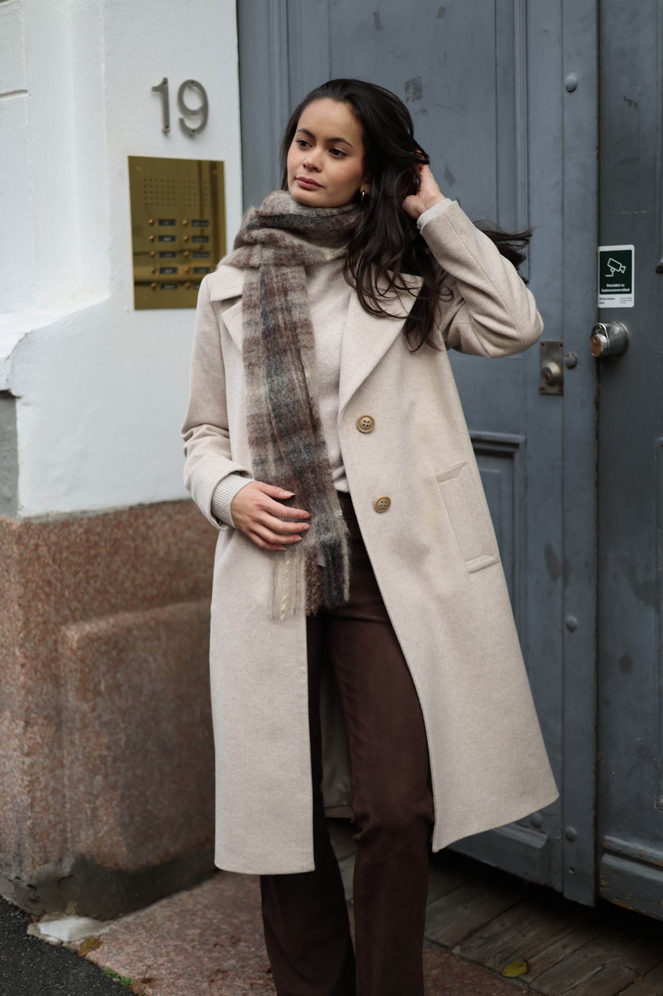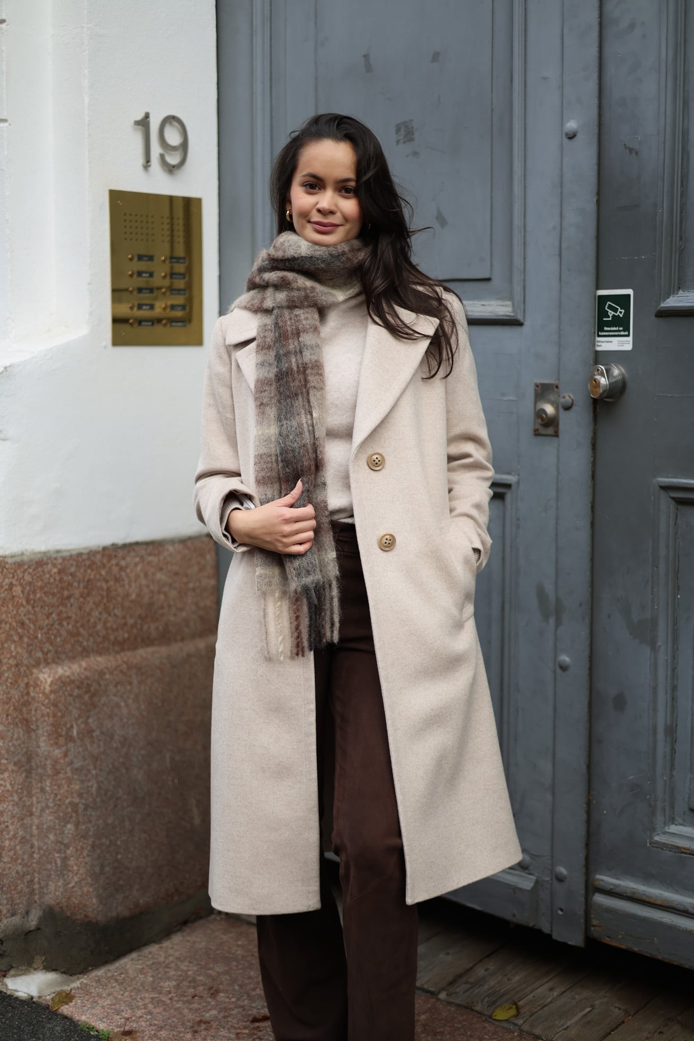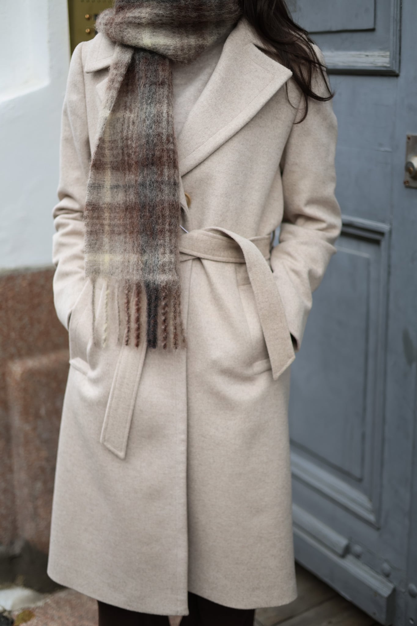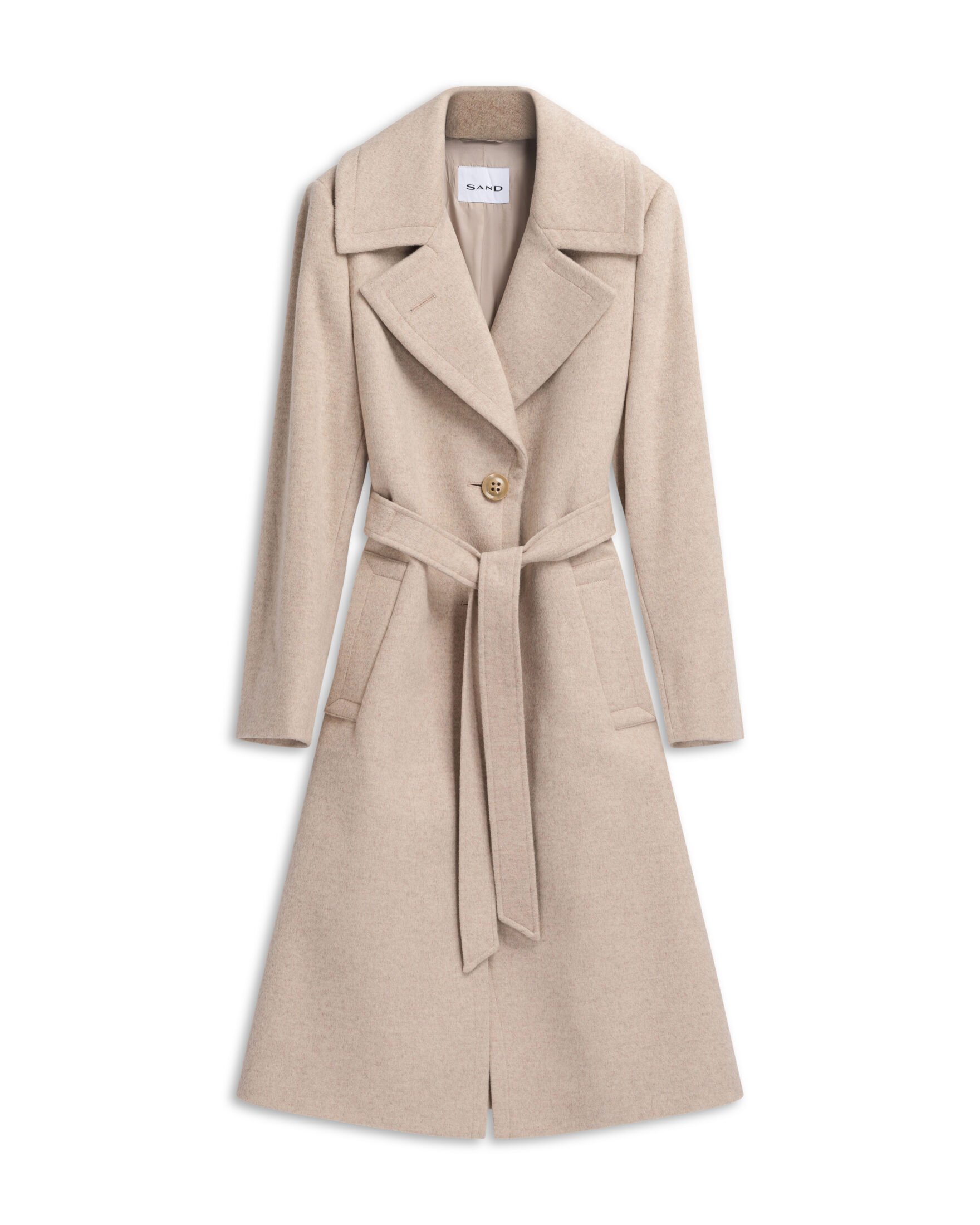 Midi-kåpe til dame fra Sand Copenhagen. Eksklusiv ullfrakk i en luksuriøs blanding av ull og kashmir med myk drapert finish. Designet med stor krage, ekstra store slag, belte i livet og sidelommer. Kåpen har knappelukking med tre knapper som kan lukkes helt for et elegant og funksjonelt uttrykk. En tidløs modell i midi-lengde som kombinerer skandinavisk eleganse med førsteklasses kvalitet.