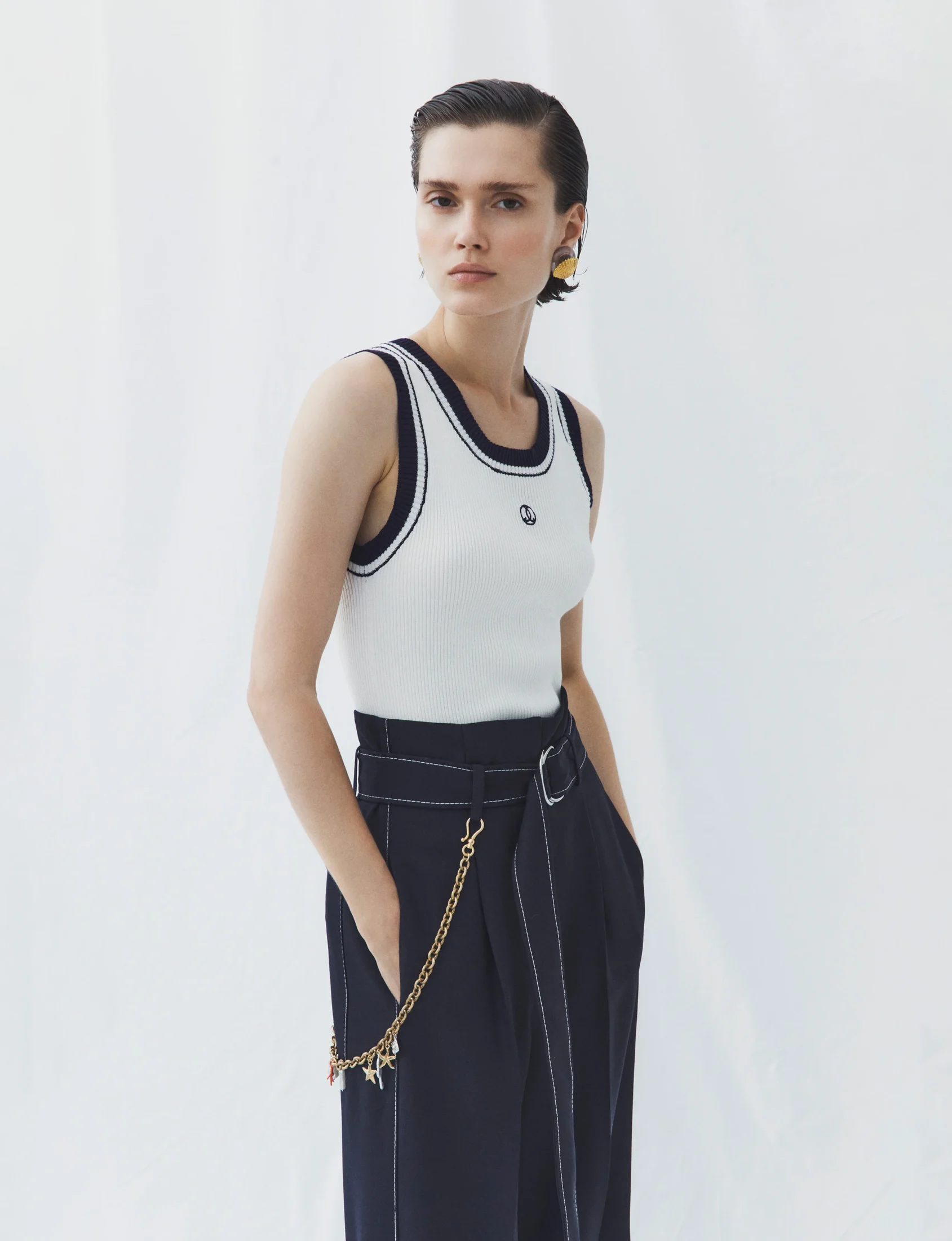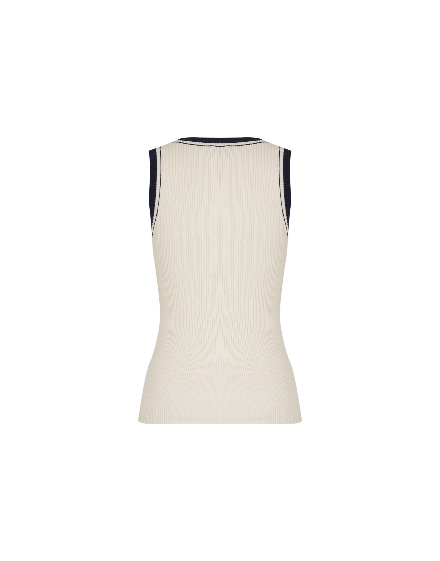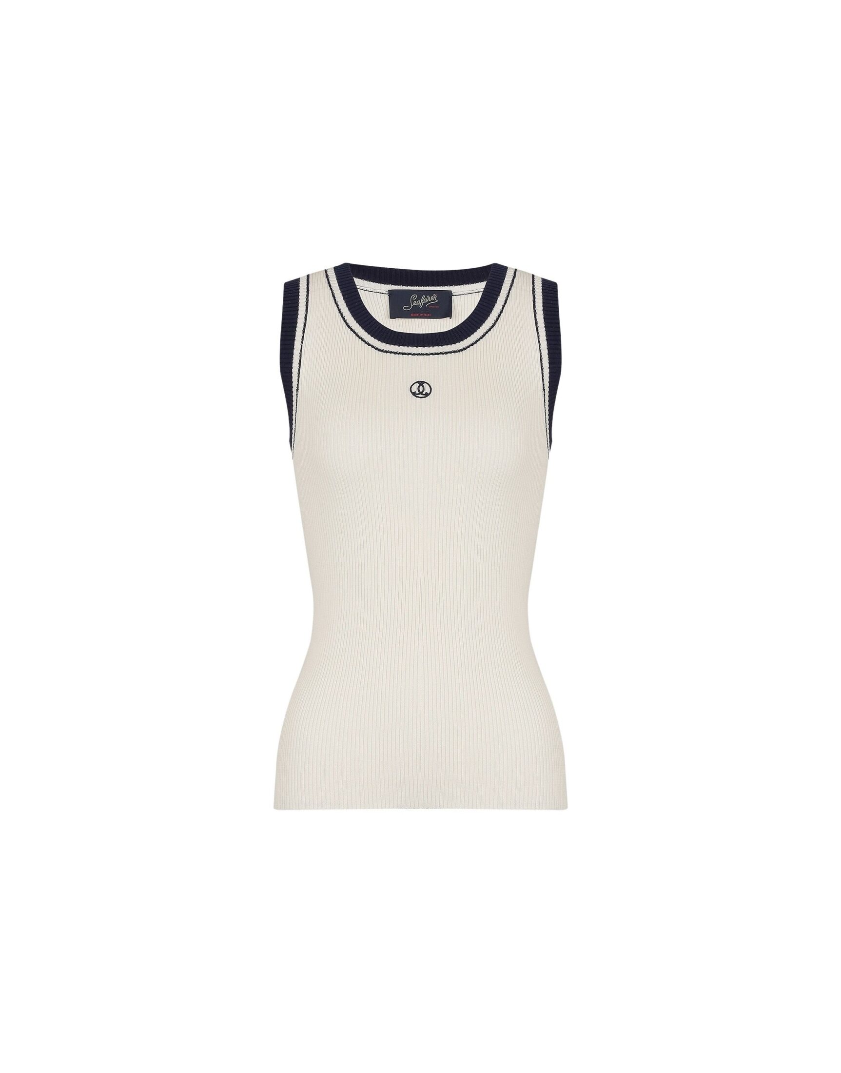 Bath fra Seafarer er en ermeløs, ribbestrikket topp med et rent og raffinert uttrykk. Den er laget i myk bomullsgarn som gir en behagelig og fleksibel passform. Klassisk rund hals og kontrastkanter ved hals og ermehull tilfører et subtilt sporty preg, mens et lite brodert logomerke på brystet gir en diskret signaturdetalj. En allsidig garderobefavoritt som enkelt kan styles alene til jeans eller dressbukser, eller lagvis under en blazer eller cardigan.