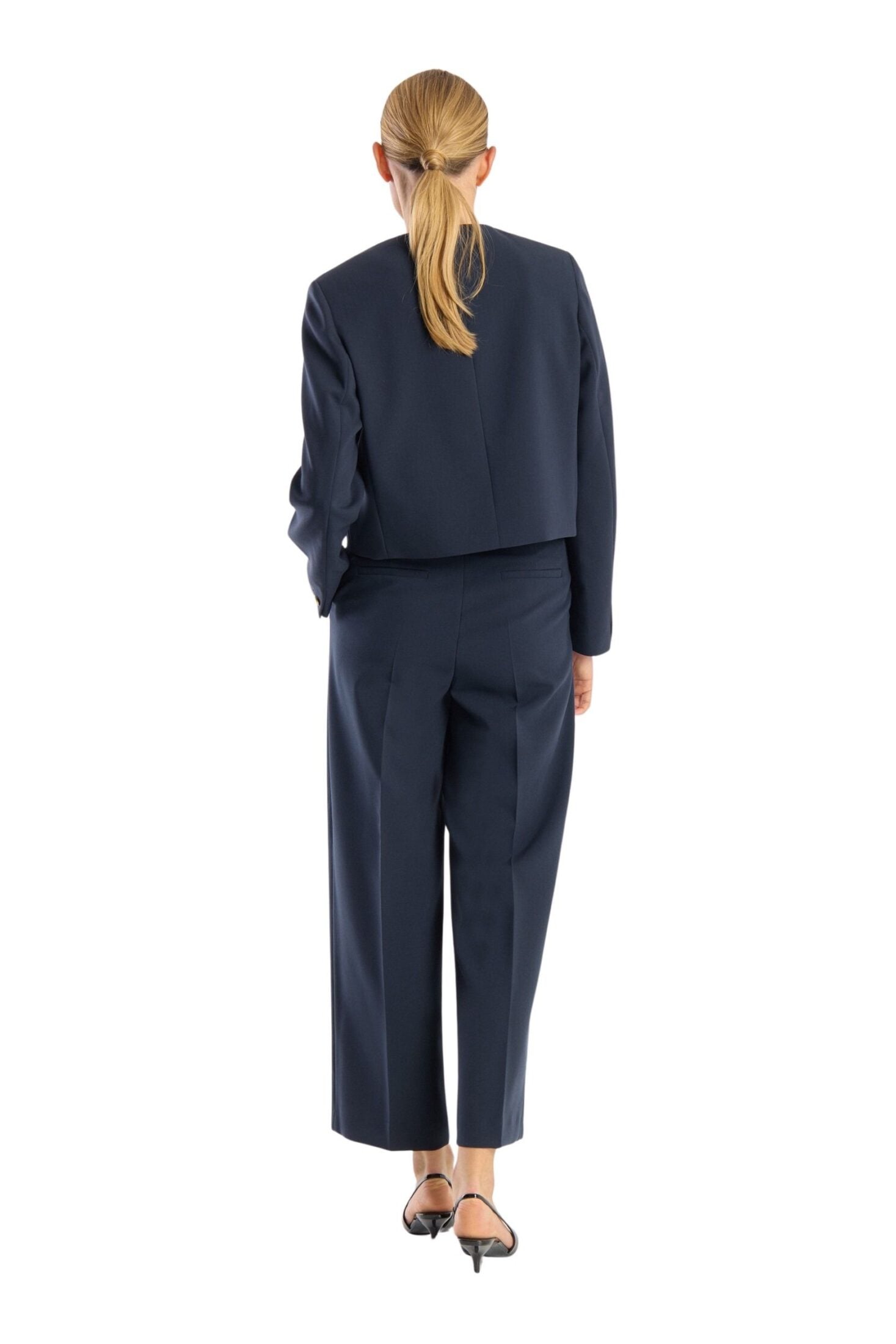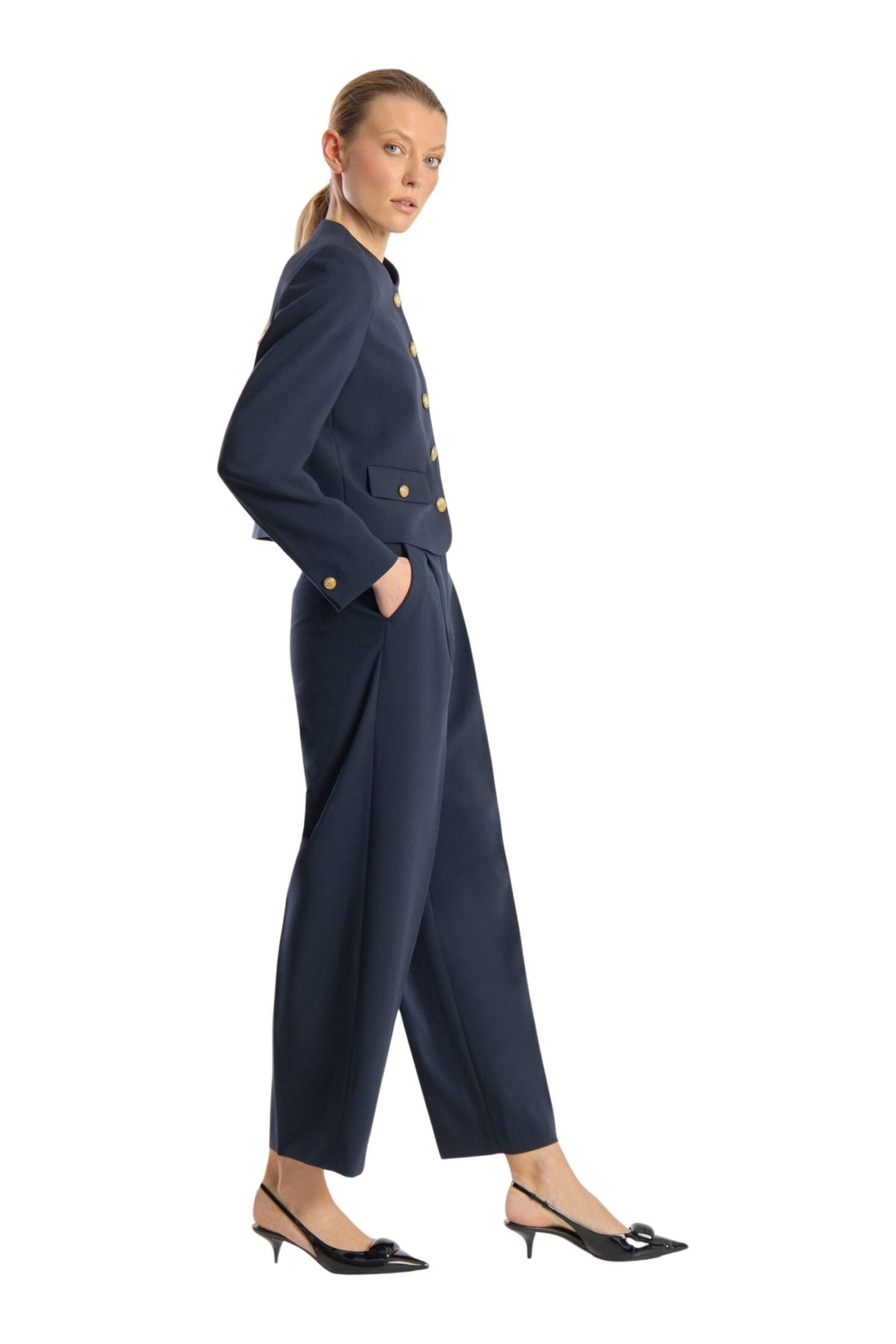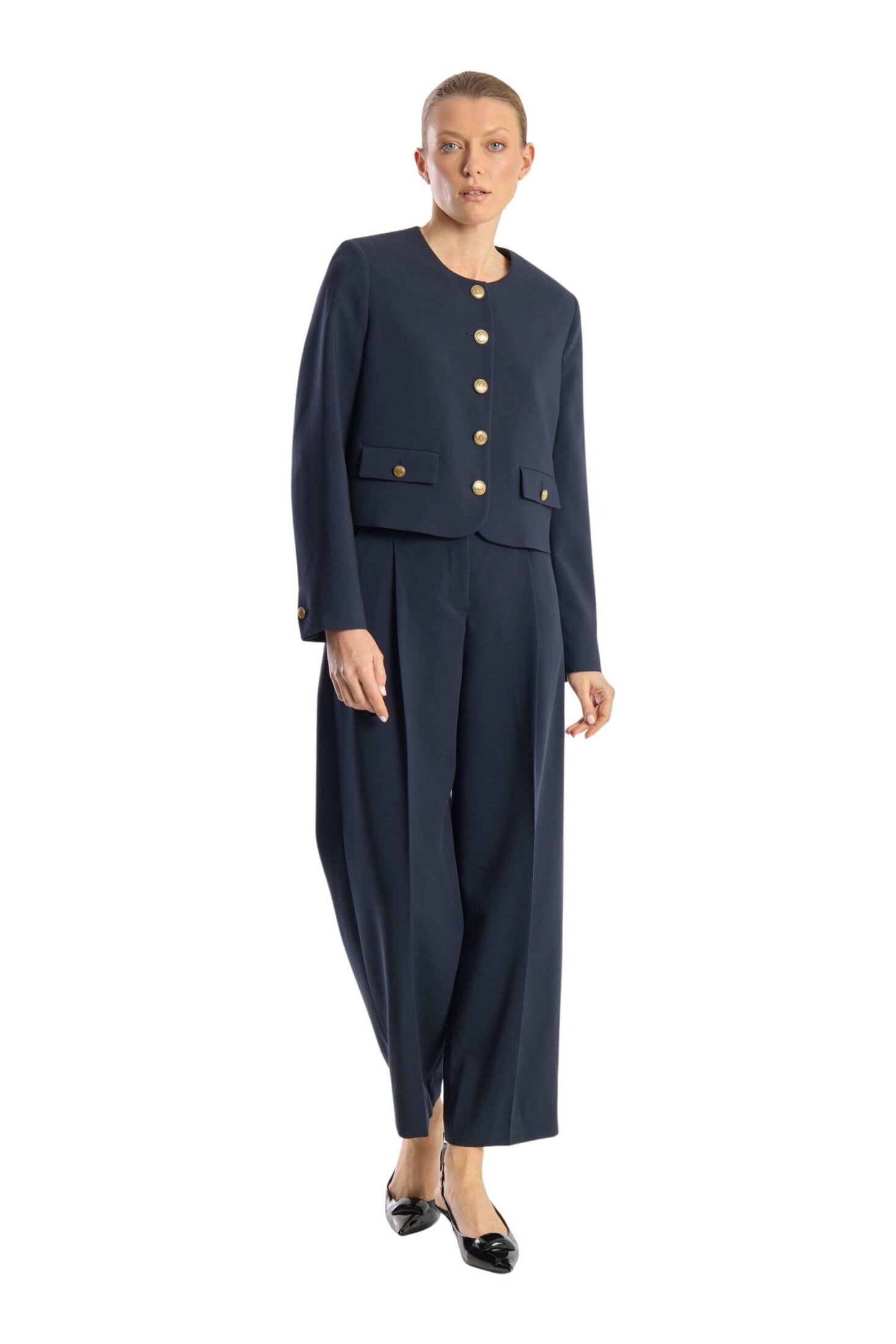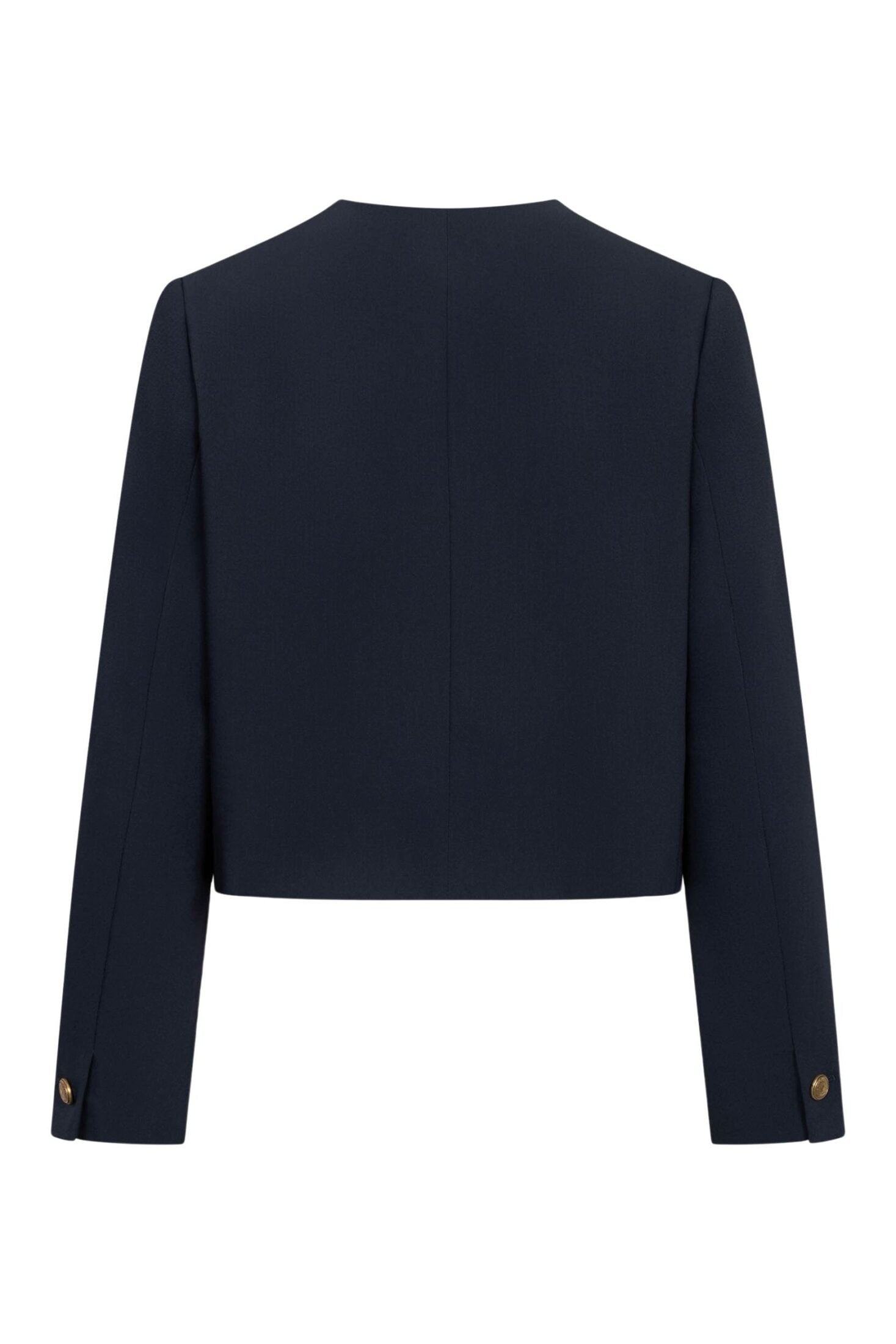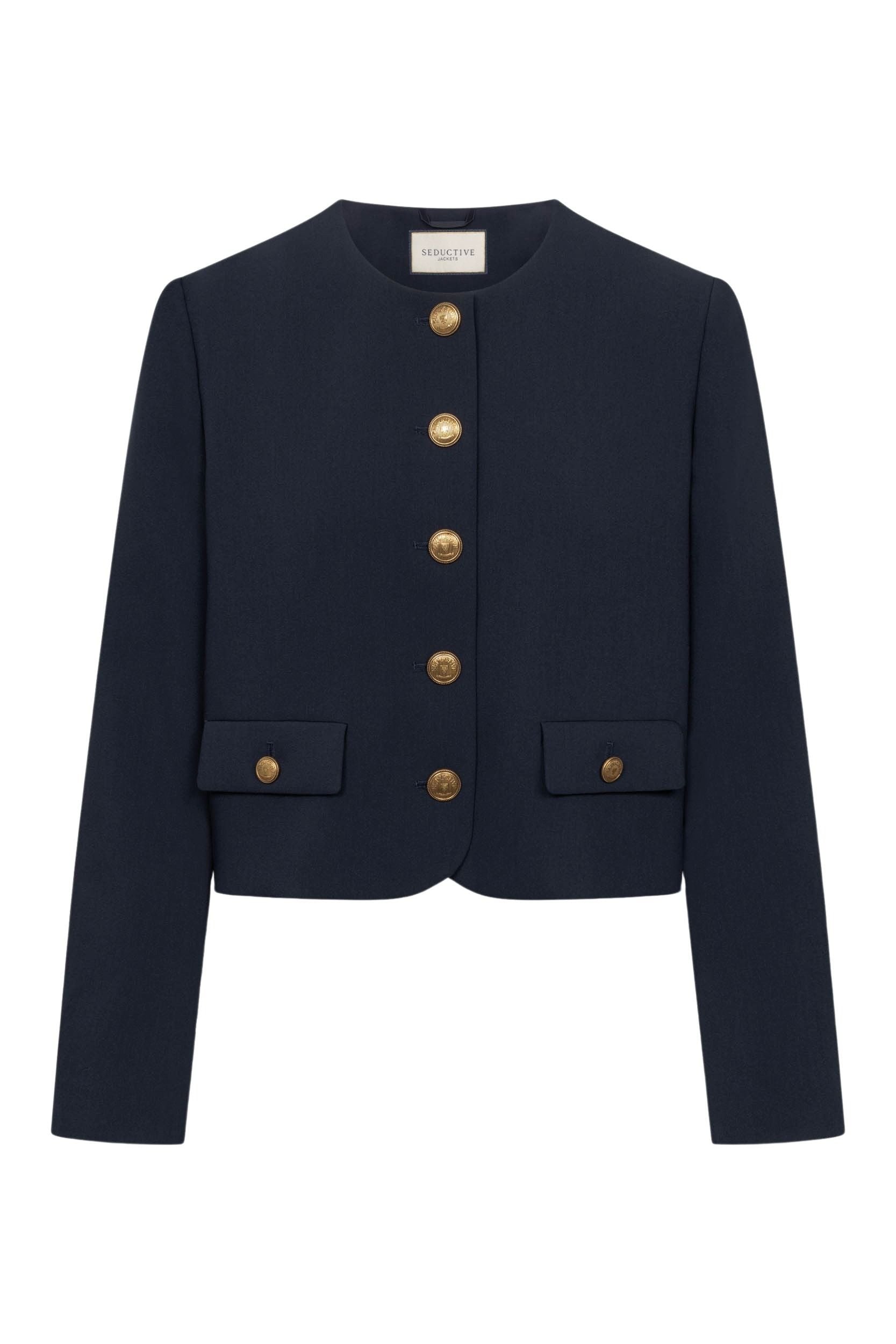 Catherine fra Seductive. En elegant, kort jakke med et rent og sofistikert uttrykk. Den har rund hals, dekorative gullknapper og frontlommer som gir et klassisk, tidløst preg. Perfekt både til jobb og mer pyntede anledninger.