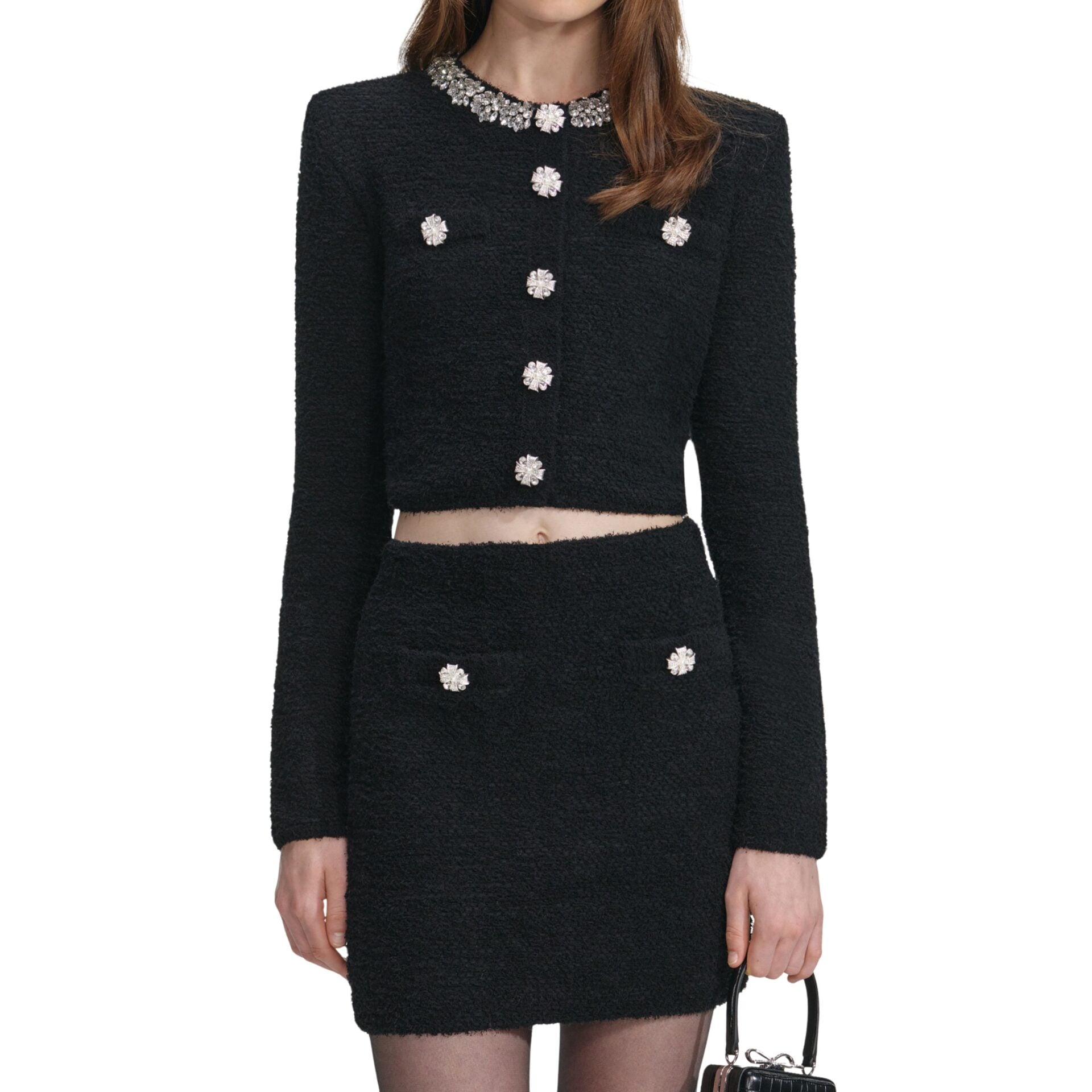 Cardigan til dame fra Self-Portrait i en myk og elastisk bomullsblanding med glitrende diamantdetaljer. Croppet passform og knapper i front gir et moderne uttrykk, perfekt alene eller med matchende skjørt.