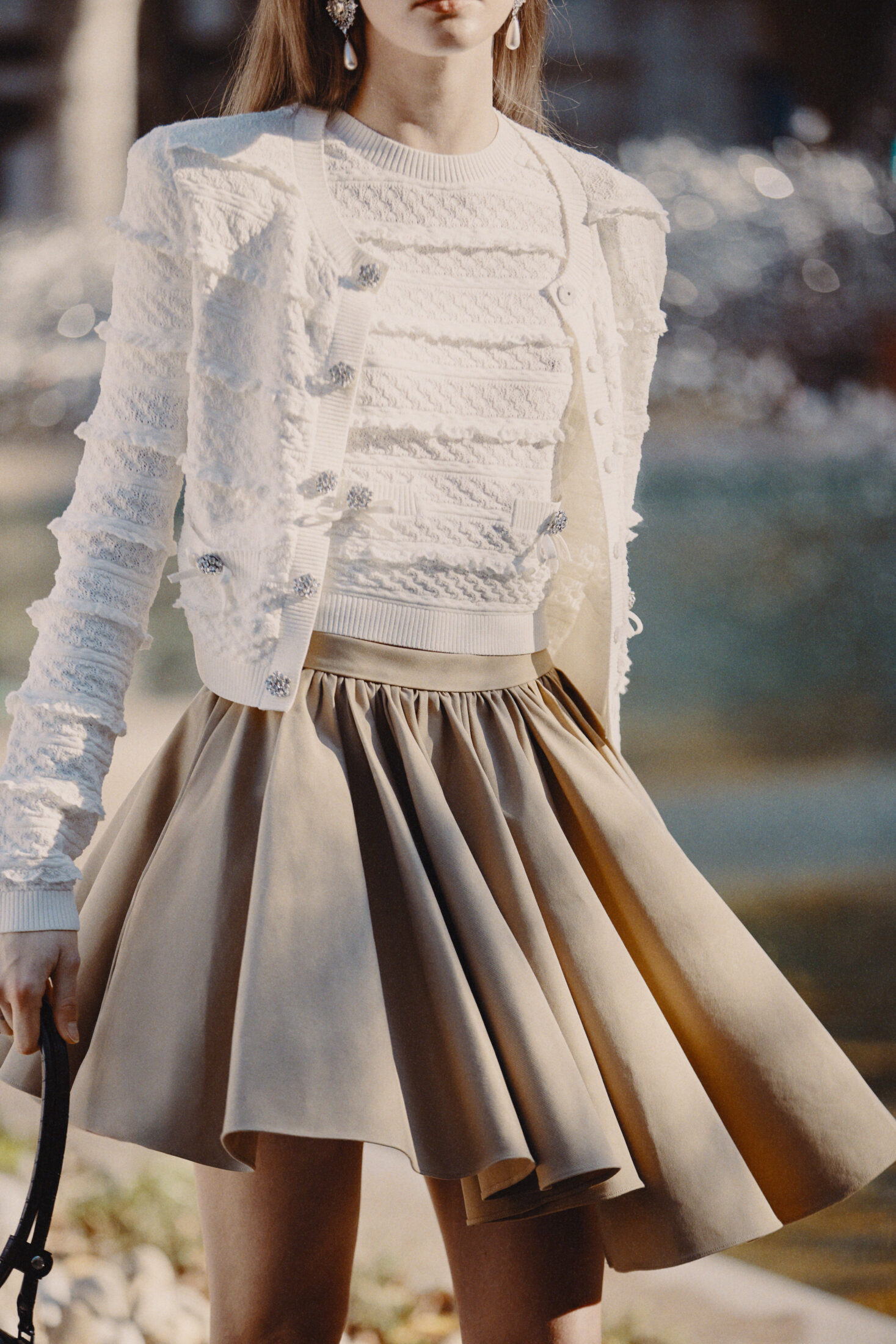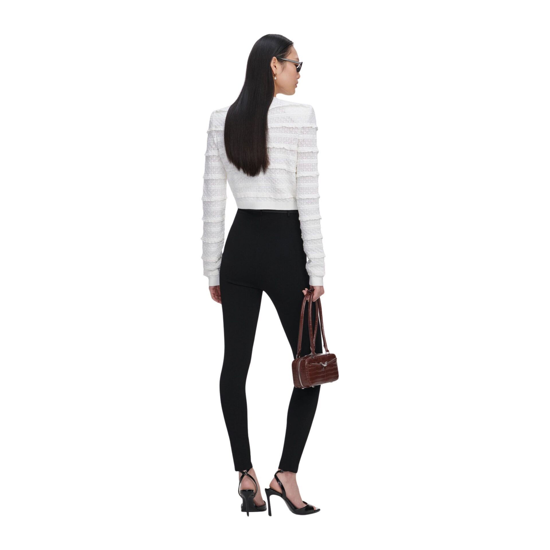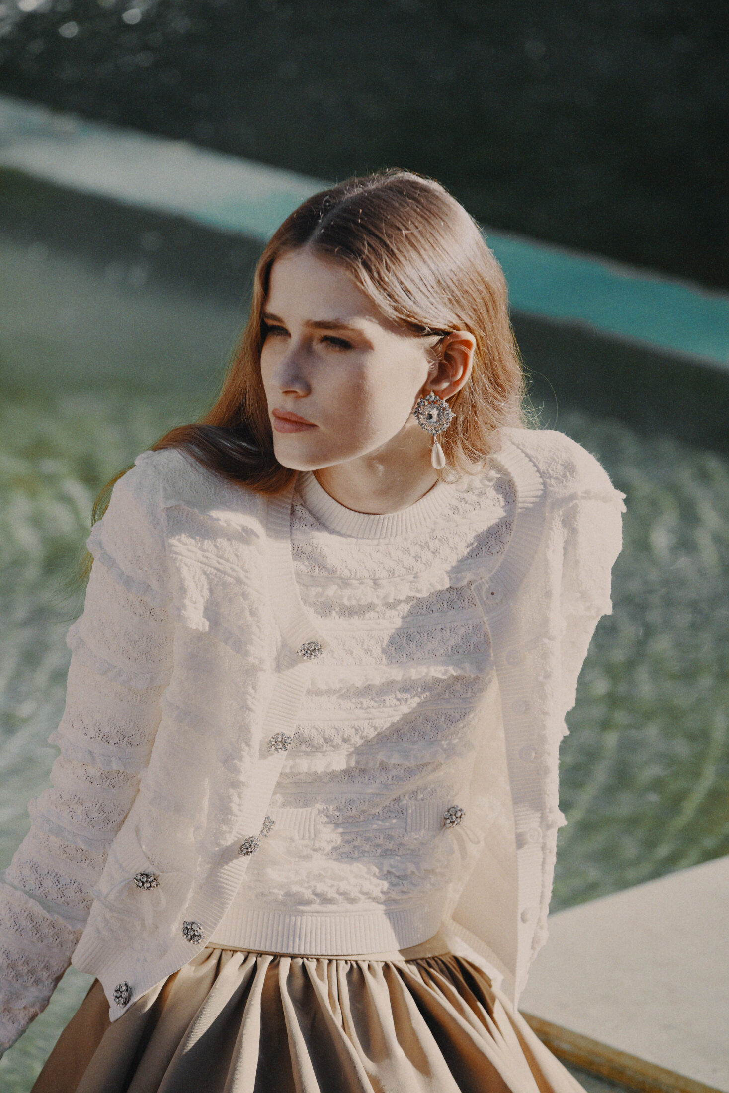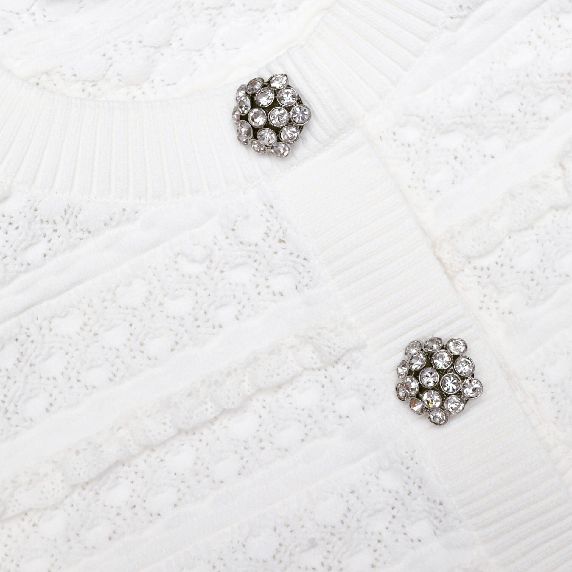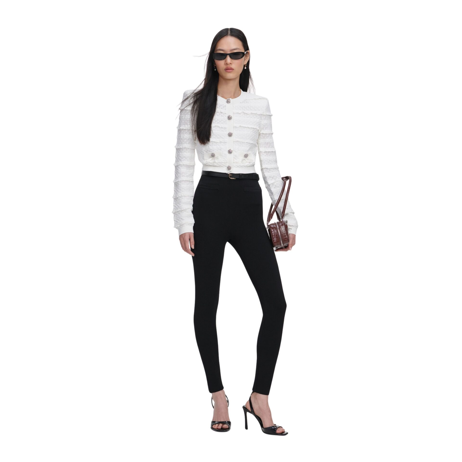 Cardigan til dame fra Self-Portrait. En hvit strikket cardigan med delikate volangdetaljer som gir et elegant og feminint uttrykk. Avtakbare skulderputer og glitrende knapper tilfører en sofistikert touch. Perfekt alene eller stylet med matchende skjørt for et gjennomført og chic antrekk.
