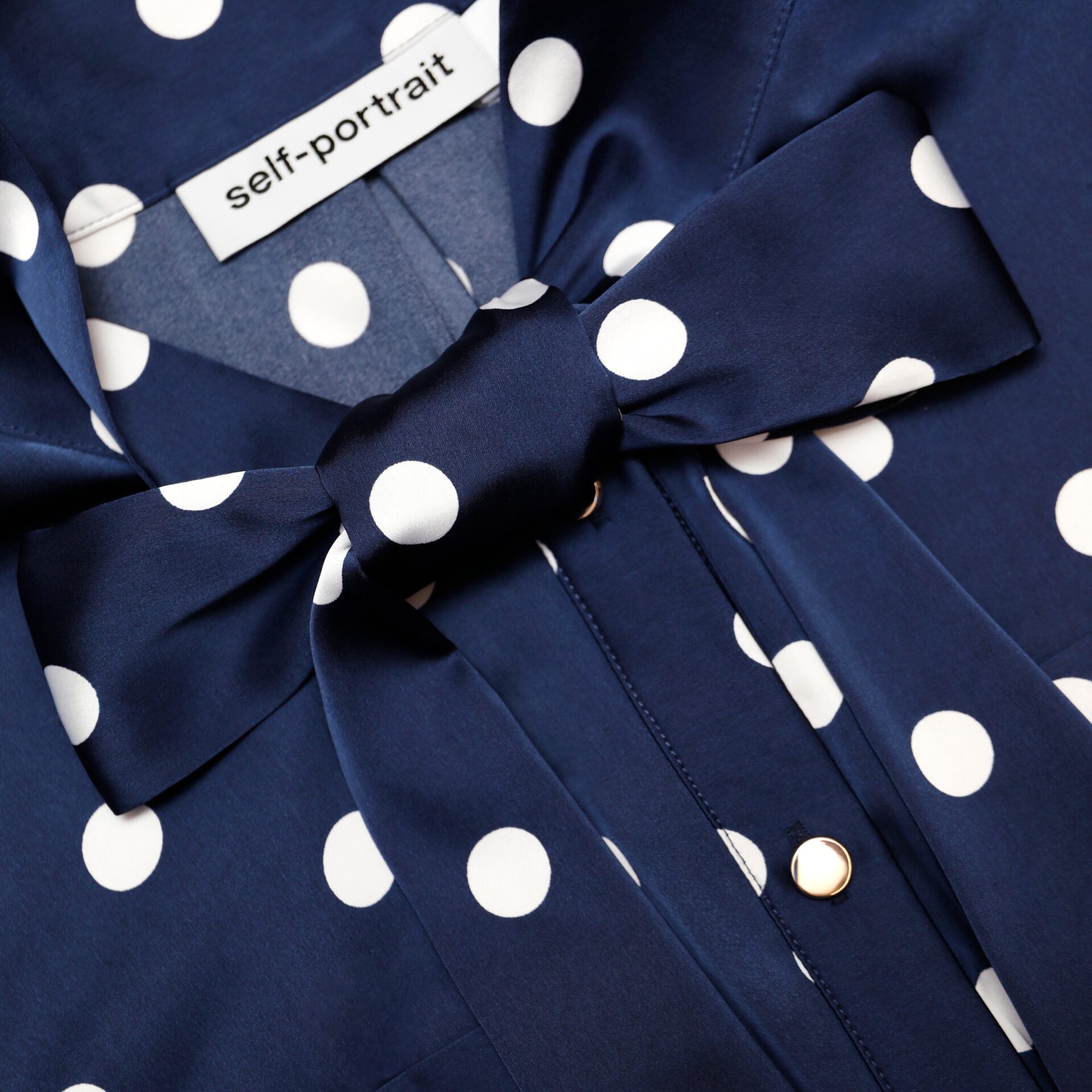 Kjole til dame fra Self-Portrait. En elegant satengkjole i marineblått med klassiske prikker og feminin sløyfedetalj i halsen. Beltet i midjen og det utsvingte skjørtet gir en flatterende og tidløs silhuett. Perfekt til både jobb og selskap – styles med hæler for et sofistikert uttrykk.