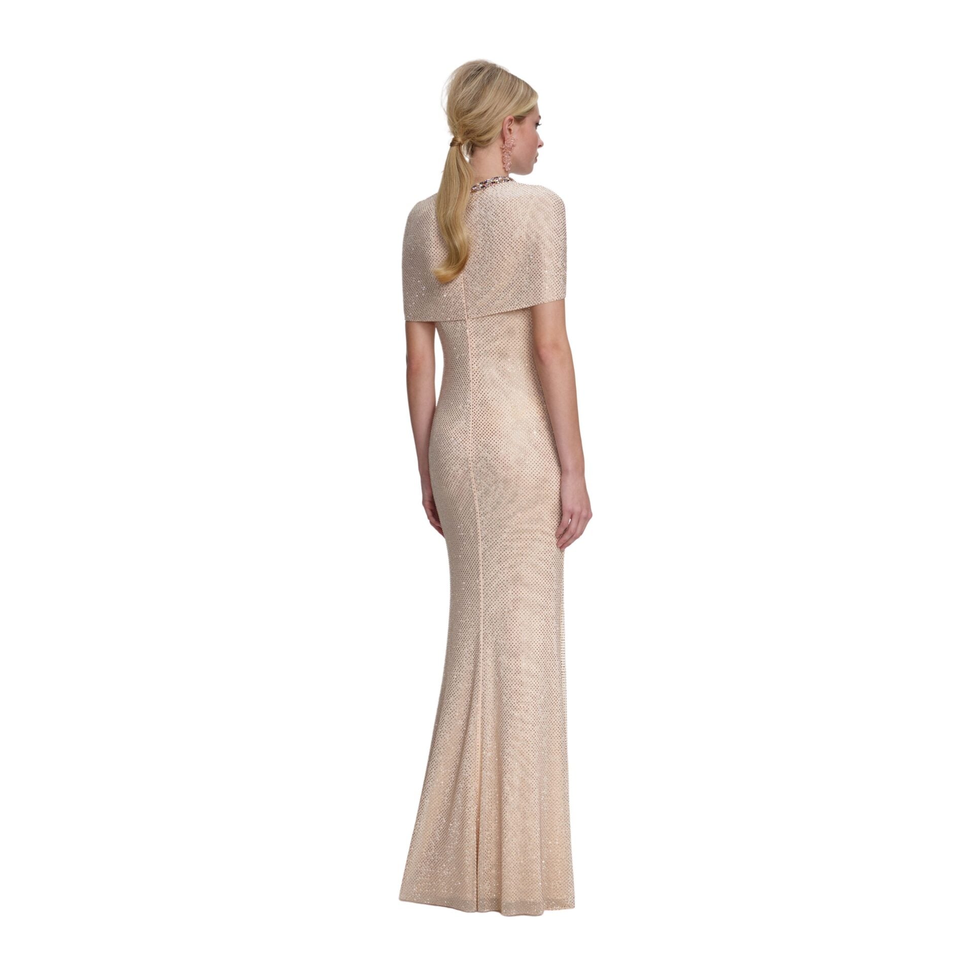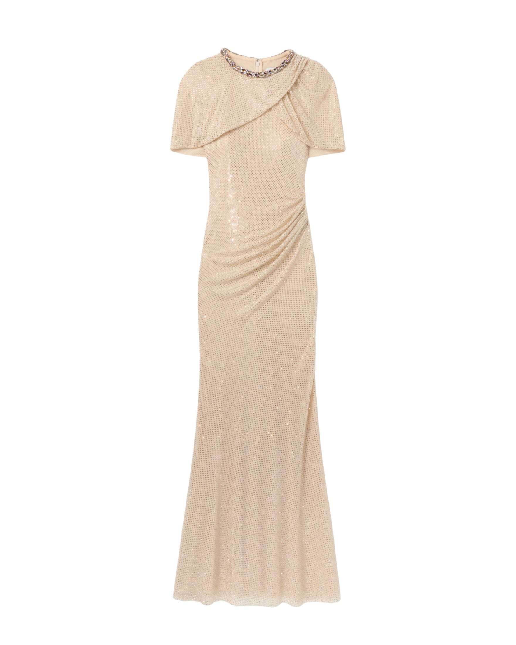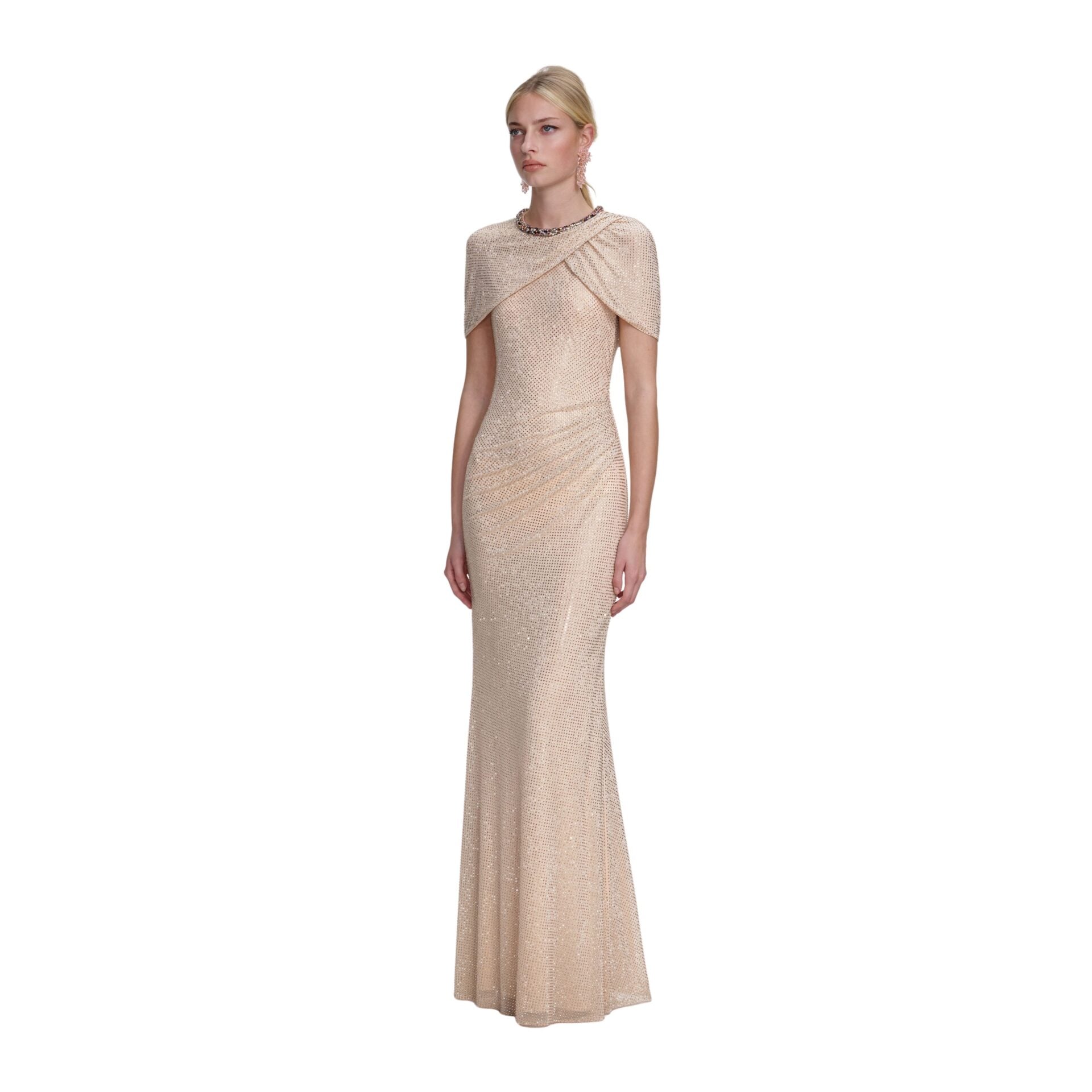 Kjole til dame fra Self-Portrait i skinnende champagnefarge med all-over rhinestones som fanger lyset fra alle vinkler. Den elegante kappedetaljen faller mykt over skuldrene og gir kjolen et dramatisk, men sofistikert uttrykk. Diamantpynt langs halsen tilfører et eksklusivt preg som gjør kjolen ideell for formelle anledninger, gallamiddager og vinterens festkvelder. En spektakulær kjole perfekt for sesongens store anledninger.