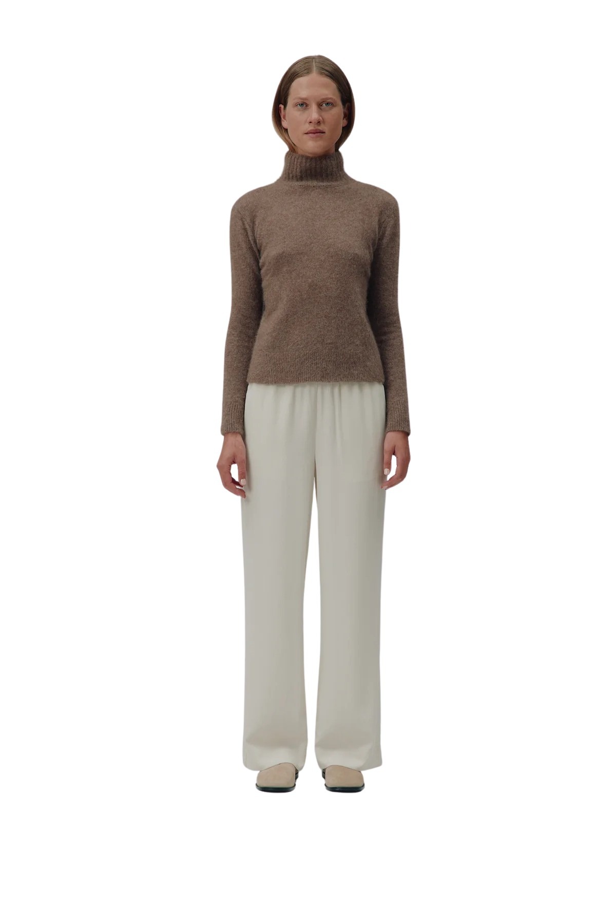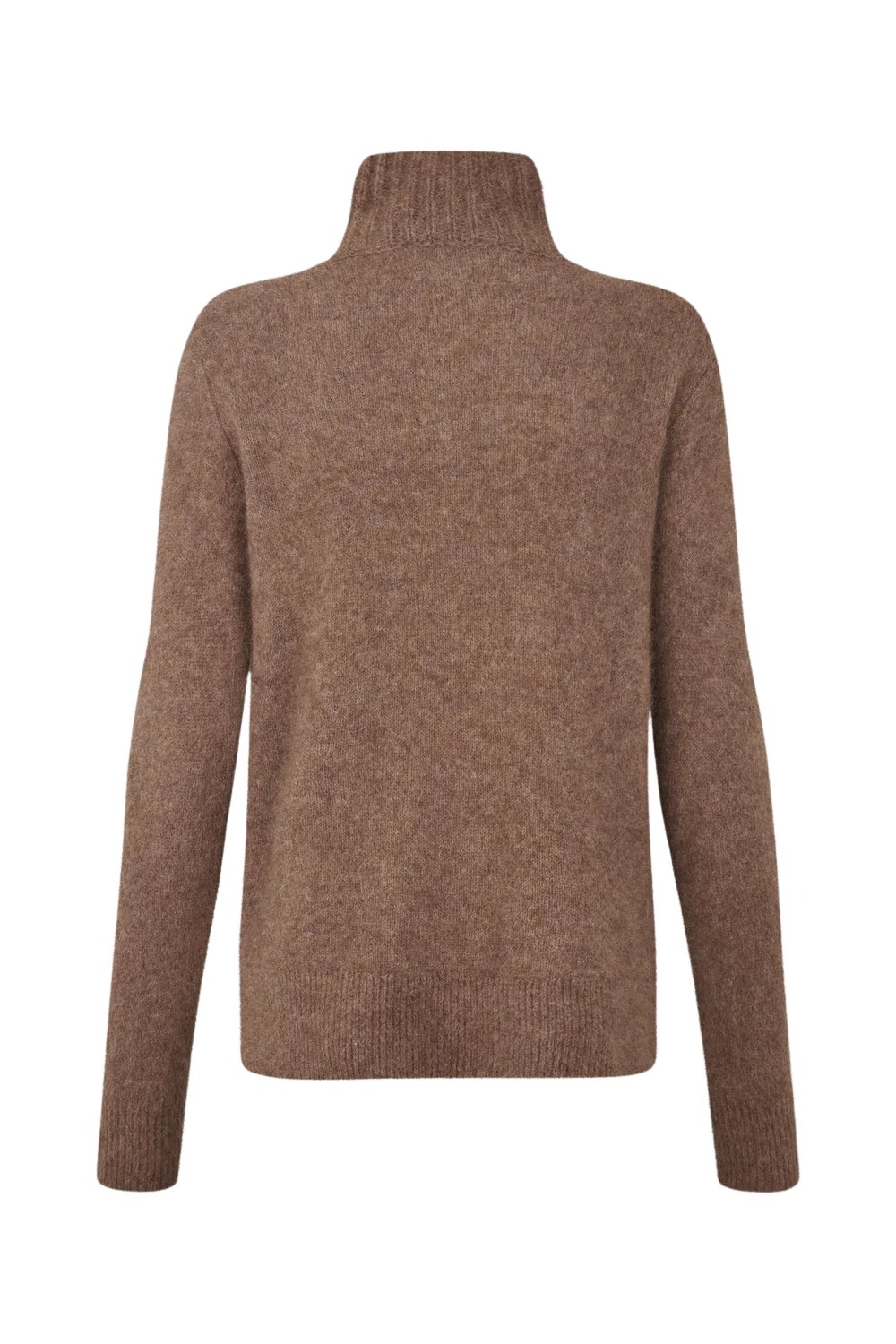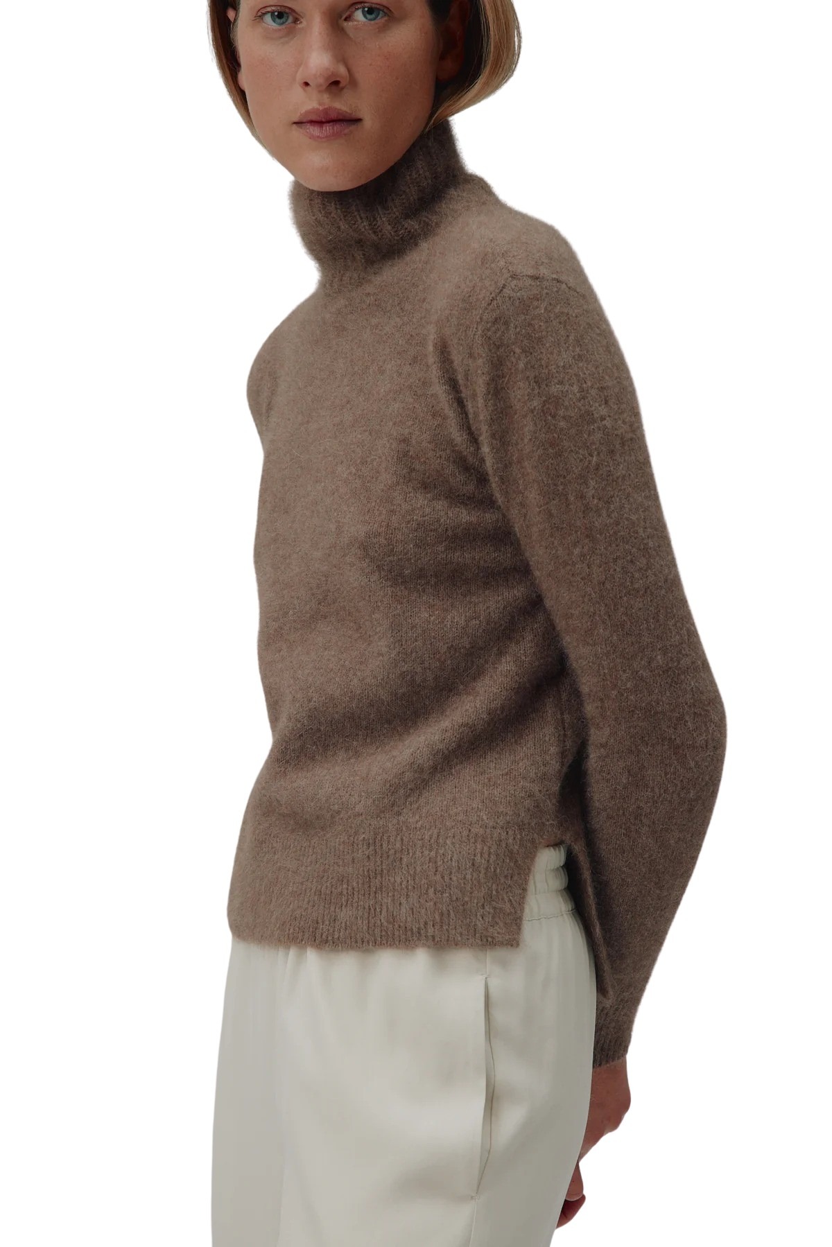 Jade fra Six Ames. En myk og behagelig genser i 100% vaskebjørnull med ledig passform og smalere ermer for en balansert silhuett. Den høye, runde halsen og ribbestrikkede avslutninger gir et tidløst og sofistikert uttrykk. En lun favoritt som omslutter deg med komfort på kjølige dager.