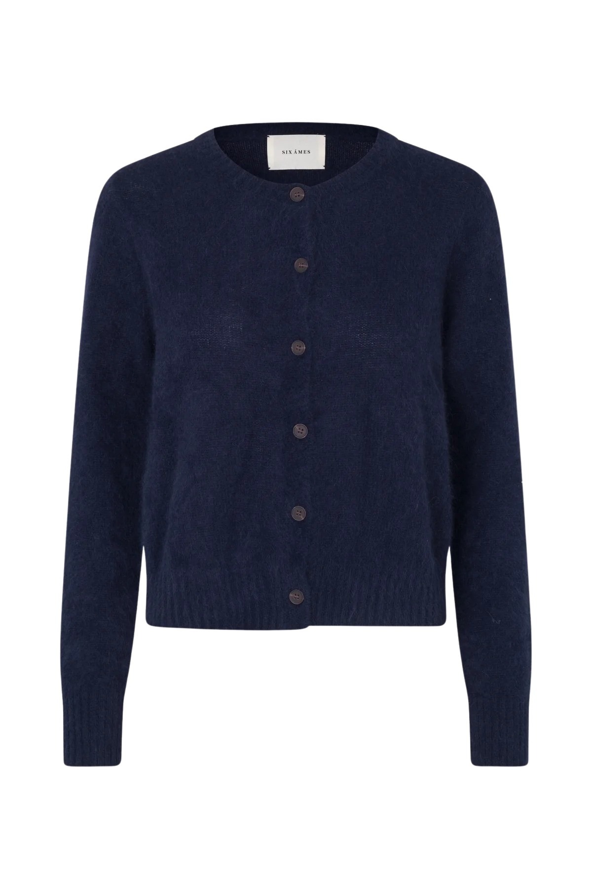 Olle fra Six Ames. En lett og myk cardigan i 100% vaskebjørnull med en smal, flatterende passform. Den runde halsen, figurnære ermer og knapper i horn gir et klassisk og gjennomført uttrykk. Perfekt til lag-på-lag og et sikkert valg i hverdagsgarderoben.