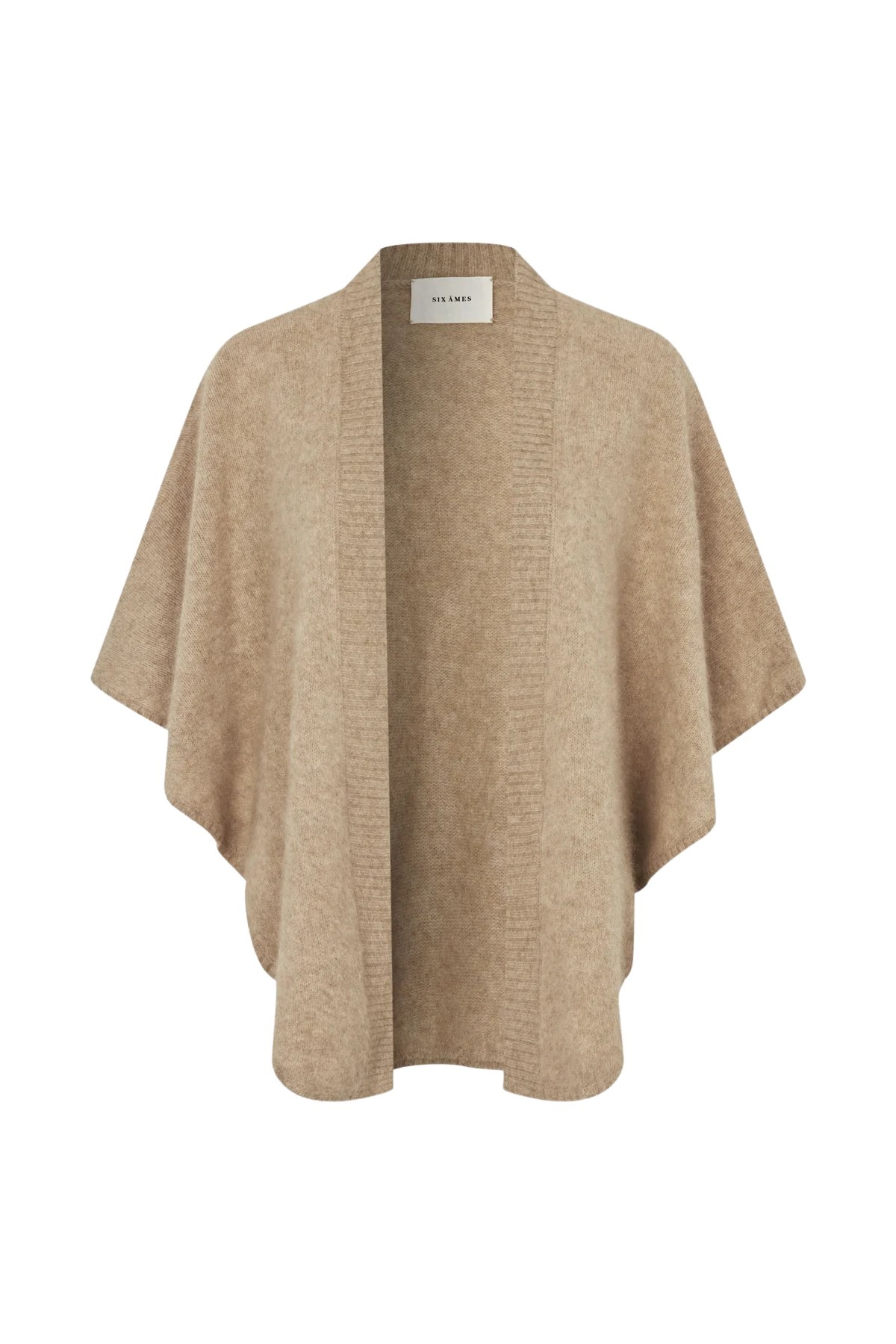 Sanne fra Six Ames. En omsluttende cardigan i 100% vaskebjørnull, designet som en cape med en luksuriøs og avslappet passform. Diskré ribbestrikk i front og fine avslutninger gir et moderne og elegant uttrykk. Perfekt for både hverdagsbruk og mer sofistikerte anledninger.