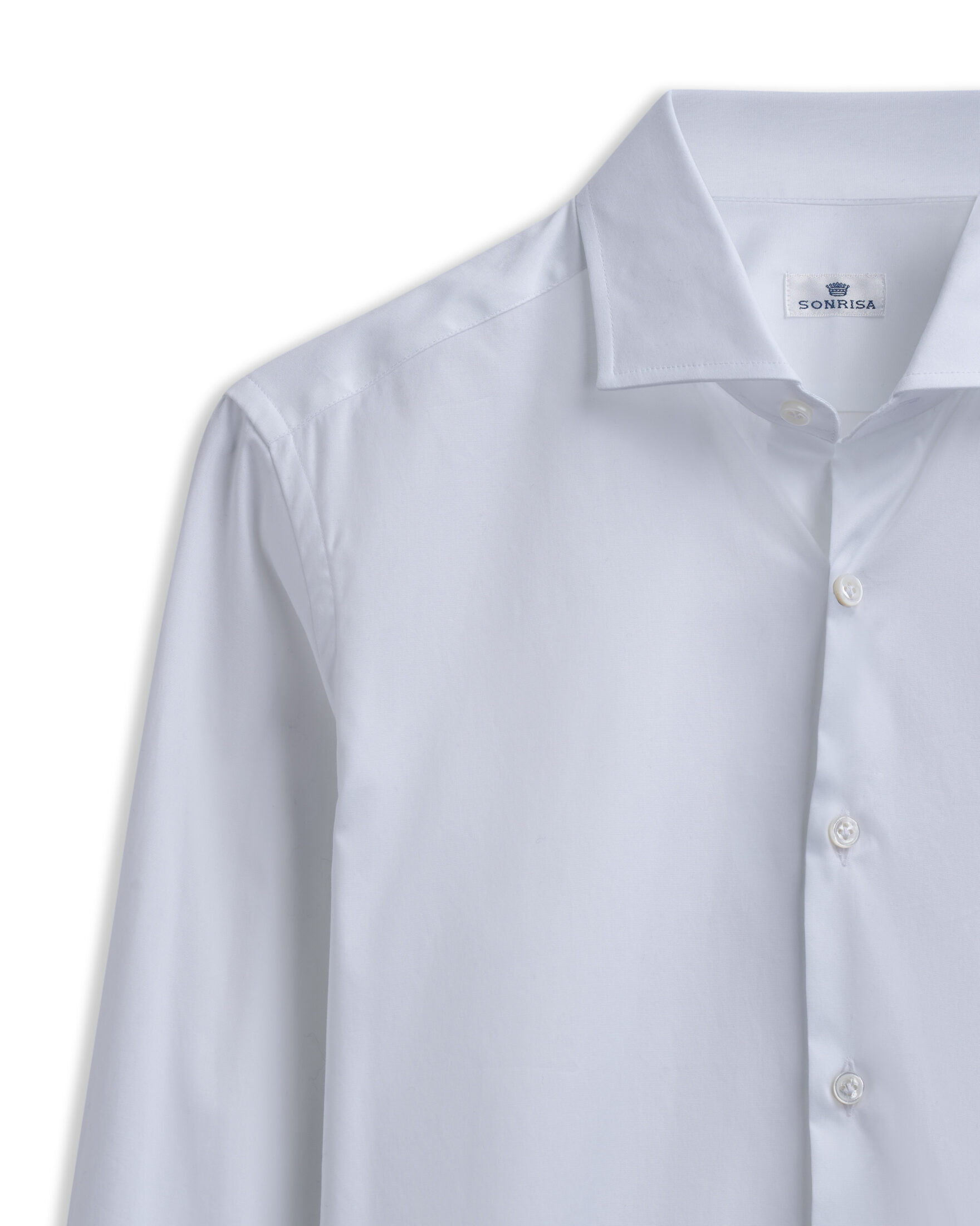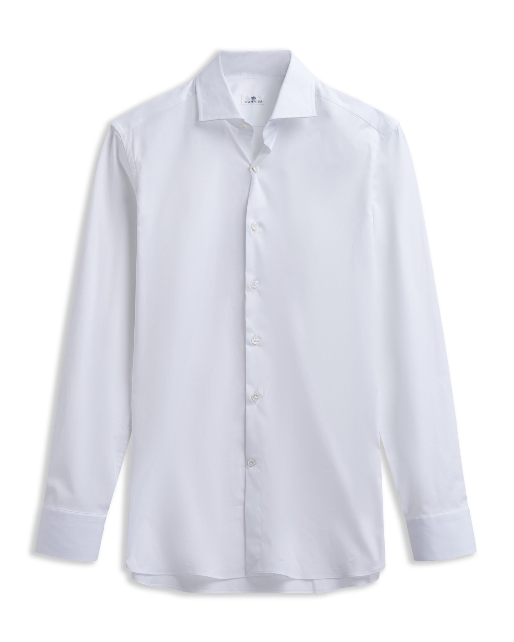 Klassisk hvit skjorte til herre fra Sonrisa. Perfekt eksempel på italiensk skreddersøm og moderne komfort. Laget av en eksklusiv blanding av bomull og elastan som gir naturlig stretch. Et uunnværlig plagg i enhver garderobe. Perfekt til både dress og blazer.