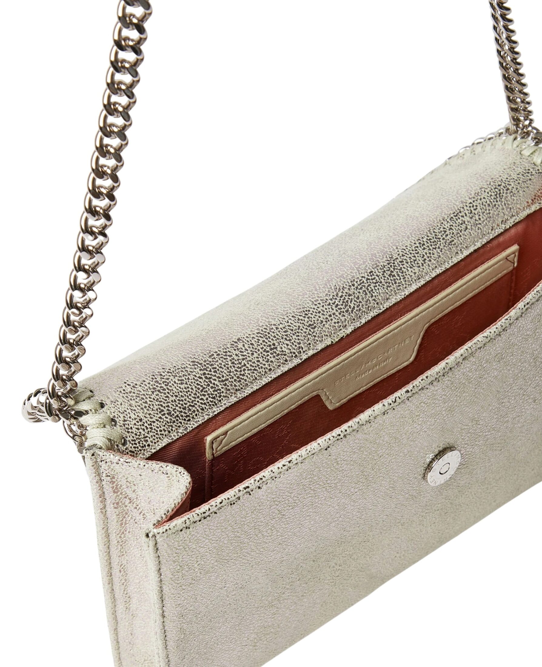 Falabella Wallet on Chain fra Stella McCartney kombinerer funksjonaliteten til en lommebok med den ikoniske Falabella-estetikken. Vesken er laget i glansfull, prikket chamois-struktur i en frisk limegrønn tone og har signatur diamantkuttet kjede i palladiumfarget metall. Et elegant og allsidig tilbehør som løfter antrekket, perfekt både til hverdags og kveldsbruk.