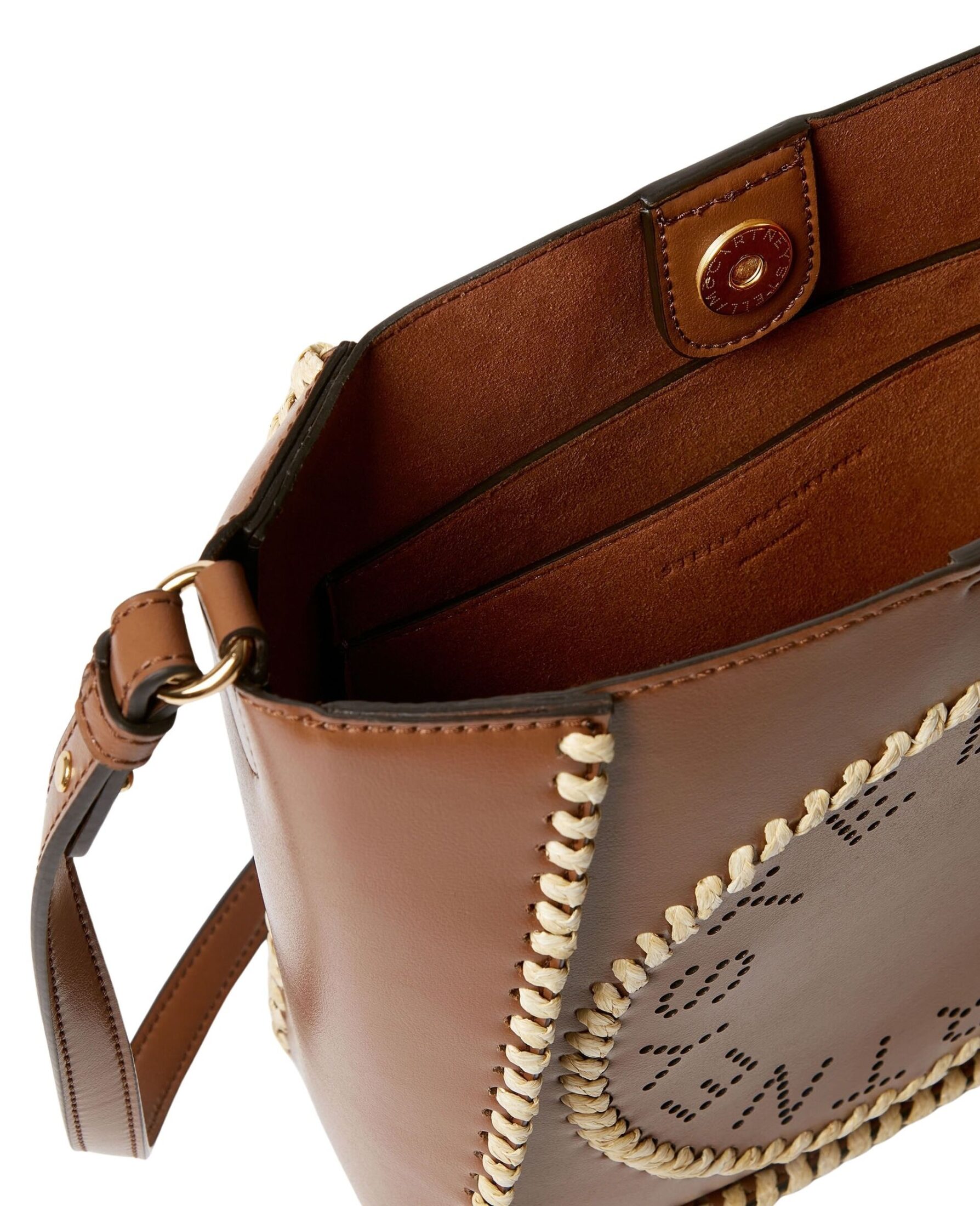 Crossbody-veske til dame fra Stella McCartney i vegansk skinn med flettede raffia-detaljer. Et sommerlig og moderne design som kombinerer struktur og tekstur, perfekt til både hverdagsbruk og feriegarderoben.