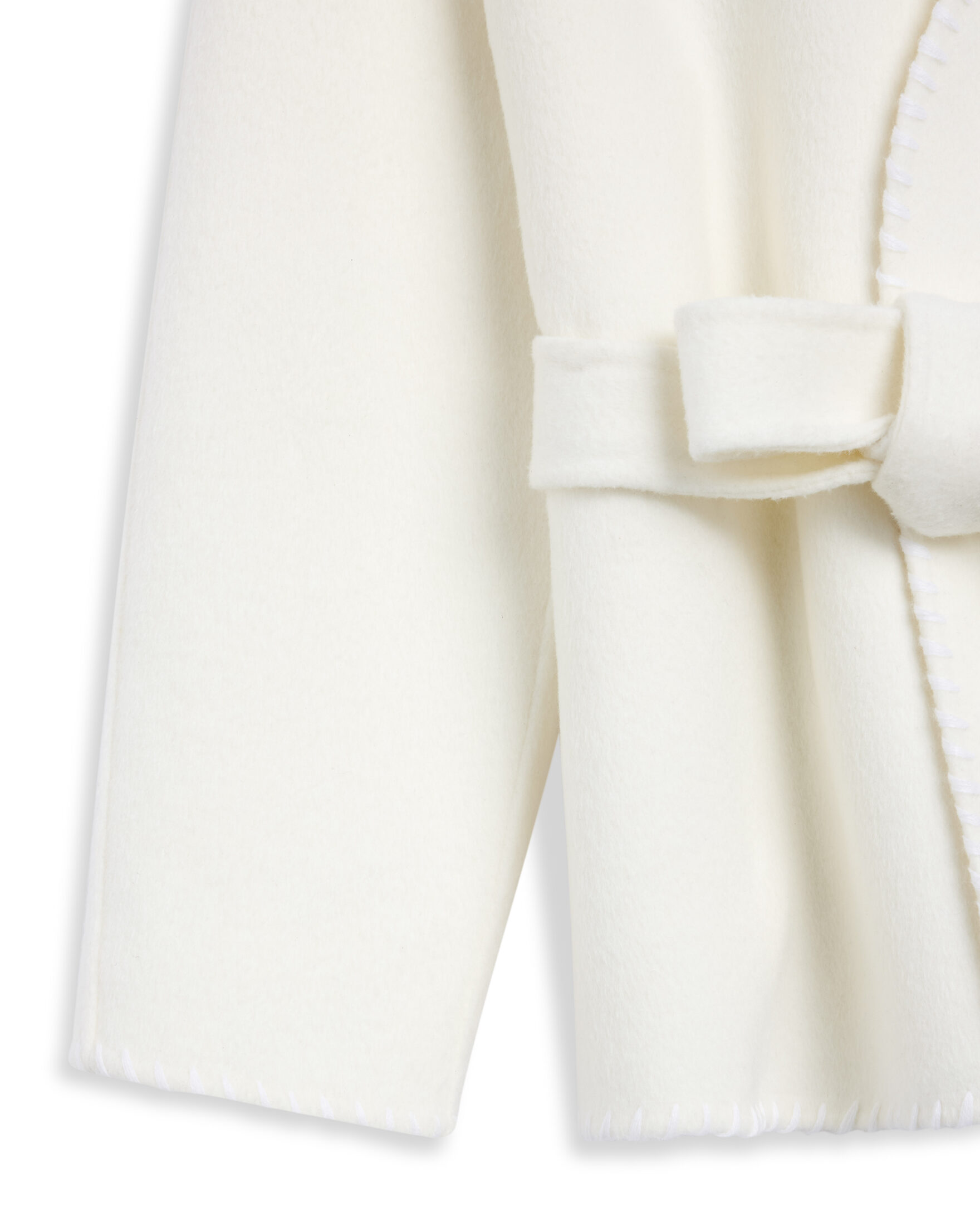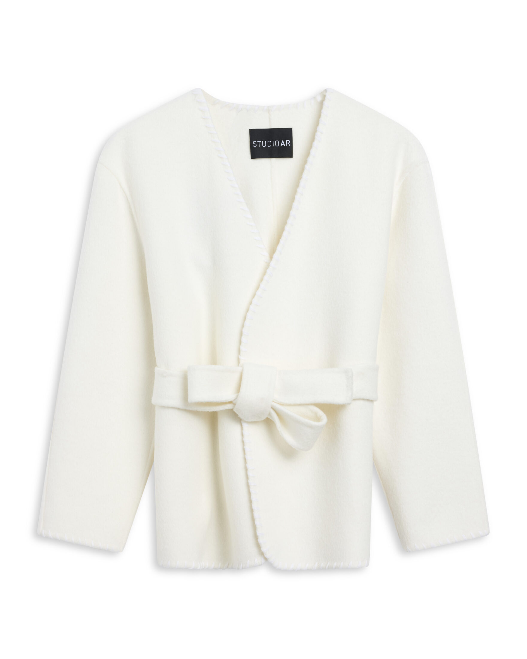 Jakke til dame fra Studio AR. Denne ulljakken kombinerer et tidløst uttrykk med en feminin silhuett. Det matchende beltet fremhever midjen, mens dekorative hvite sømmer langs kantene gir jakken et raffinert og moderne preg. Et elegant plagg som løfter både hverdags- og mer formelle antrekk.