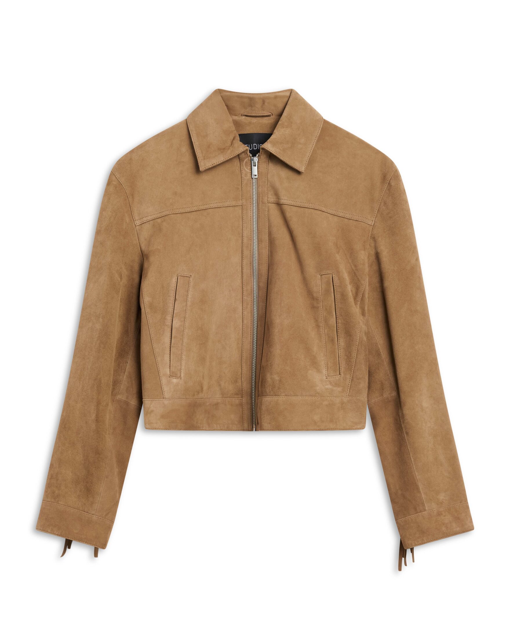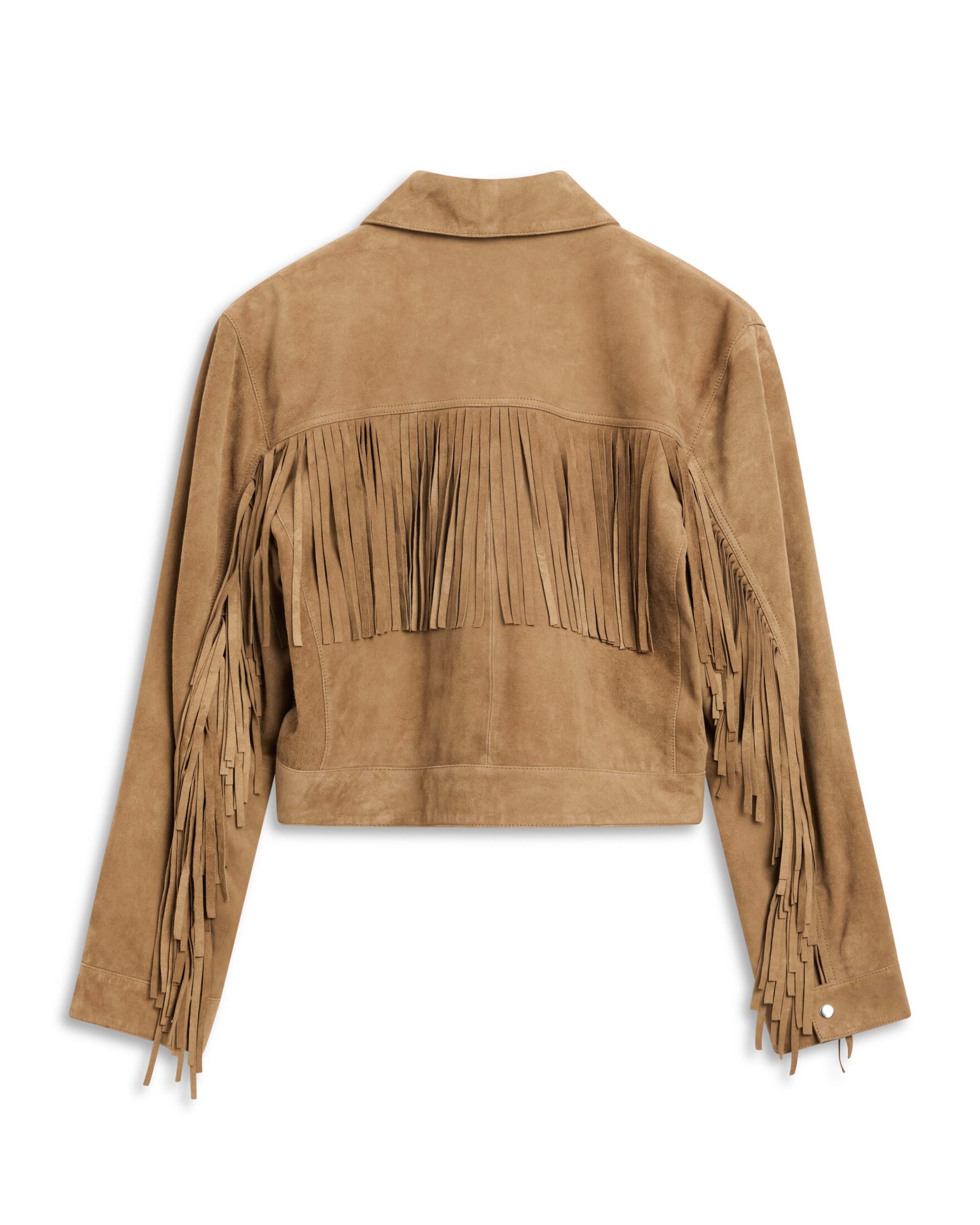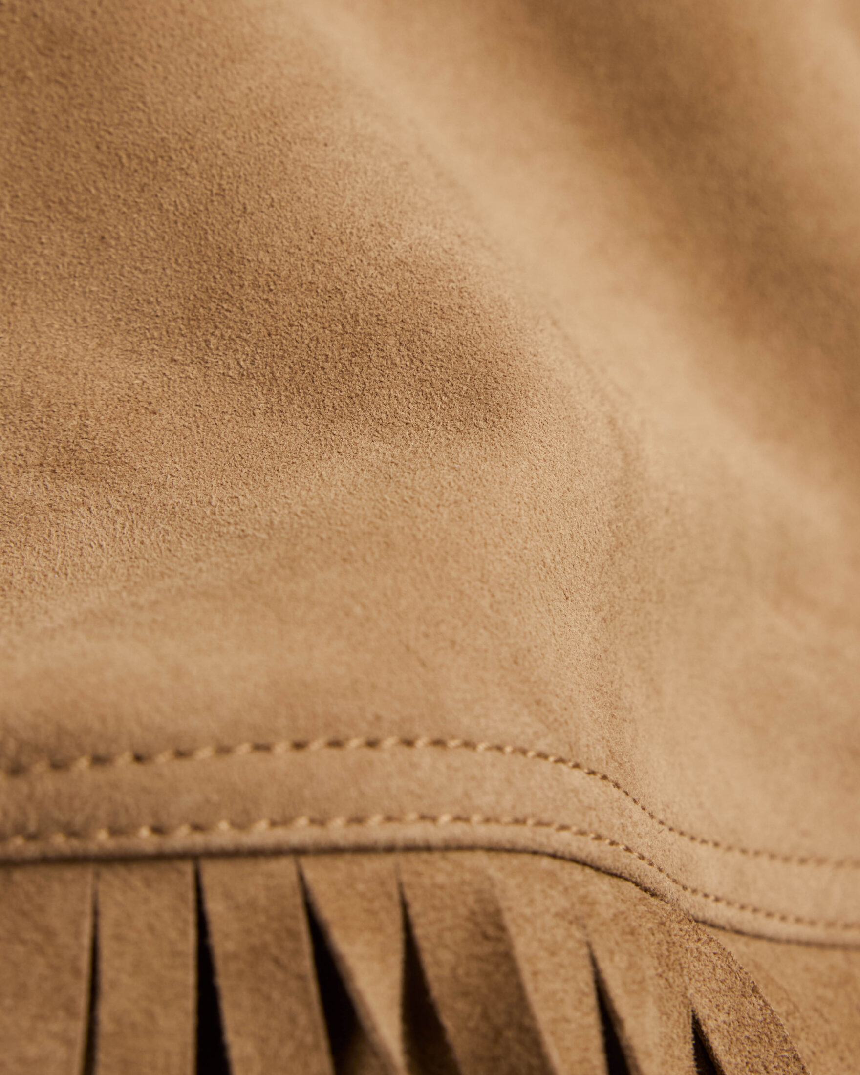 Semsket skinnjakke til dame fra Studio AR. Vintageinspirert uttrykk med en avslappet, bohemsk stil. Det myke skinnet gir en eksklusiv følelse, mens frynsedetaljene langs ryggen og ermene skaper bevegelse og et karakterfullt, westerninspirert preg. En iøynefallende jakke som tilfører antrekket både personlighet og tidløs sjarm.