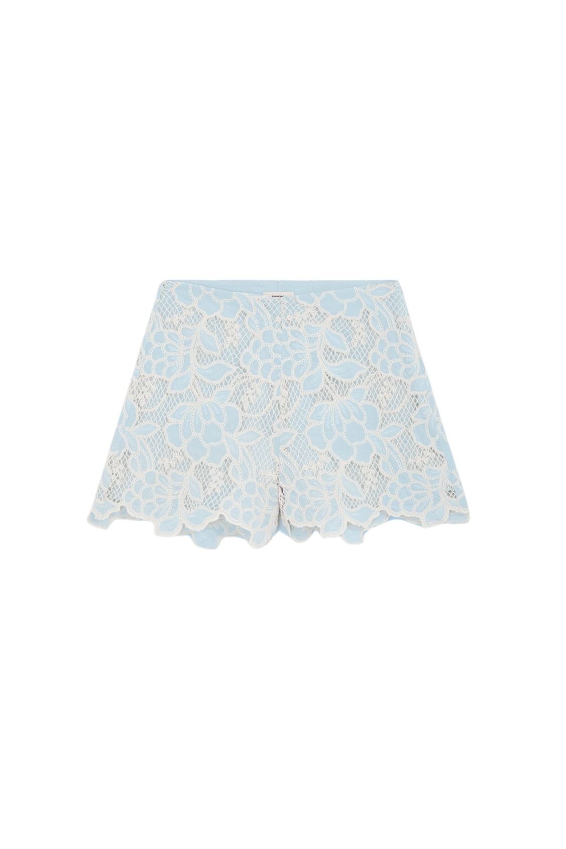 Shorts til dame fra Suncoo. Feminine blondeshorts i lyseblått med dekorativt mønster og bølget kant som gir et delikat og sommerlig uttrykk. Perfekt sammen med matchende topp.