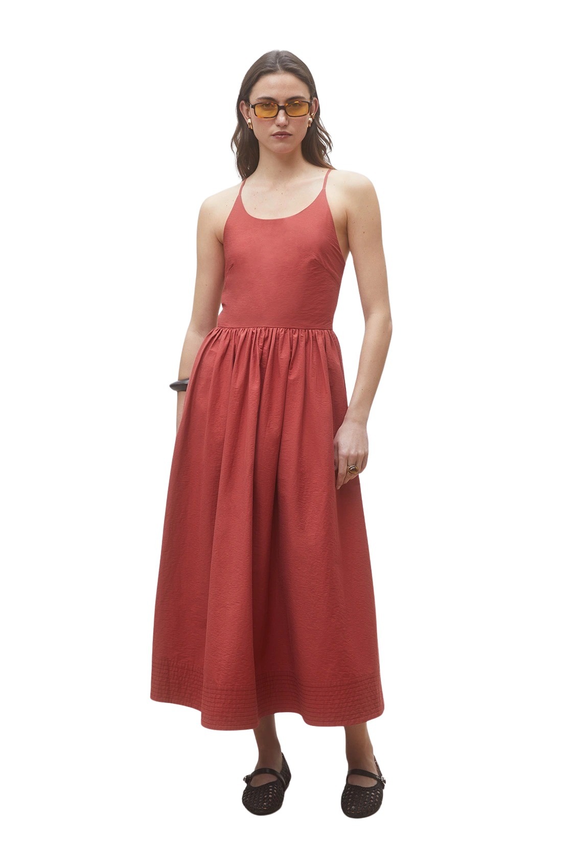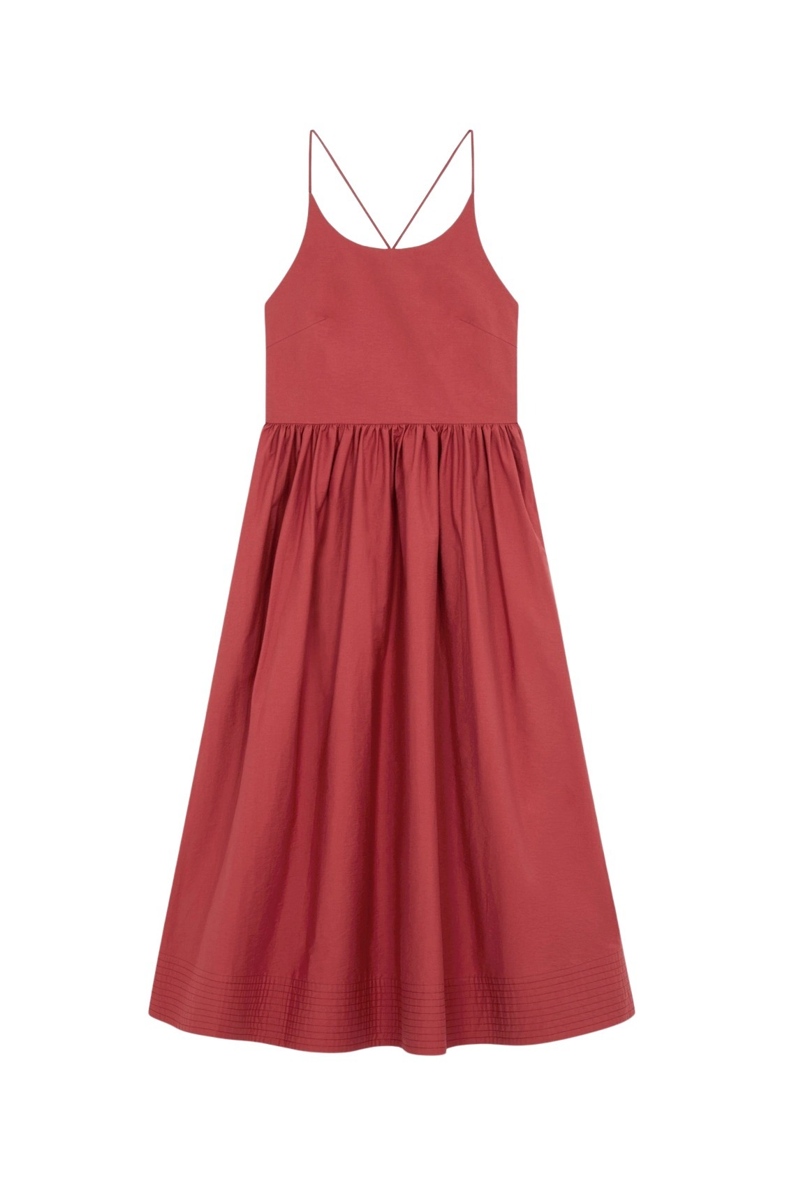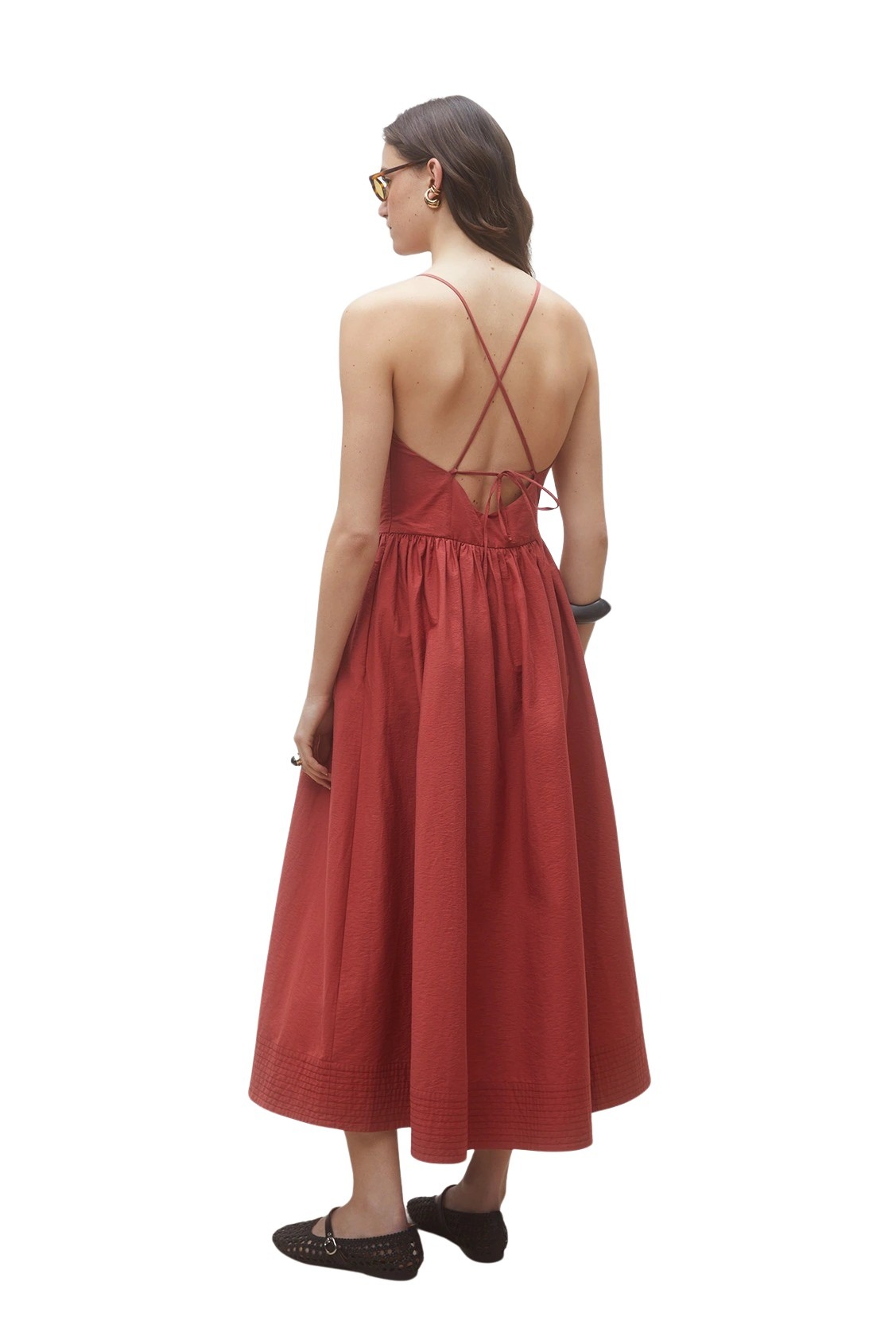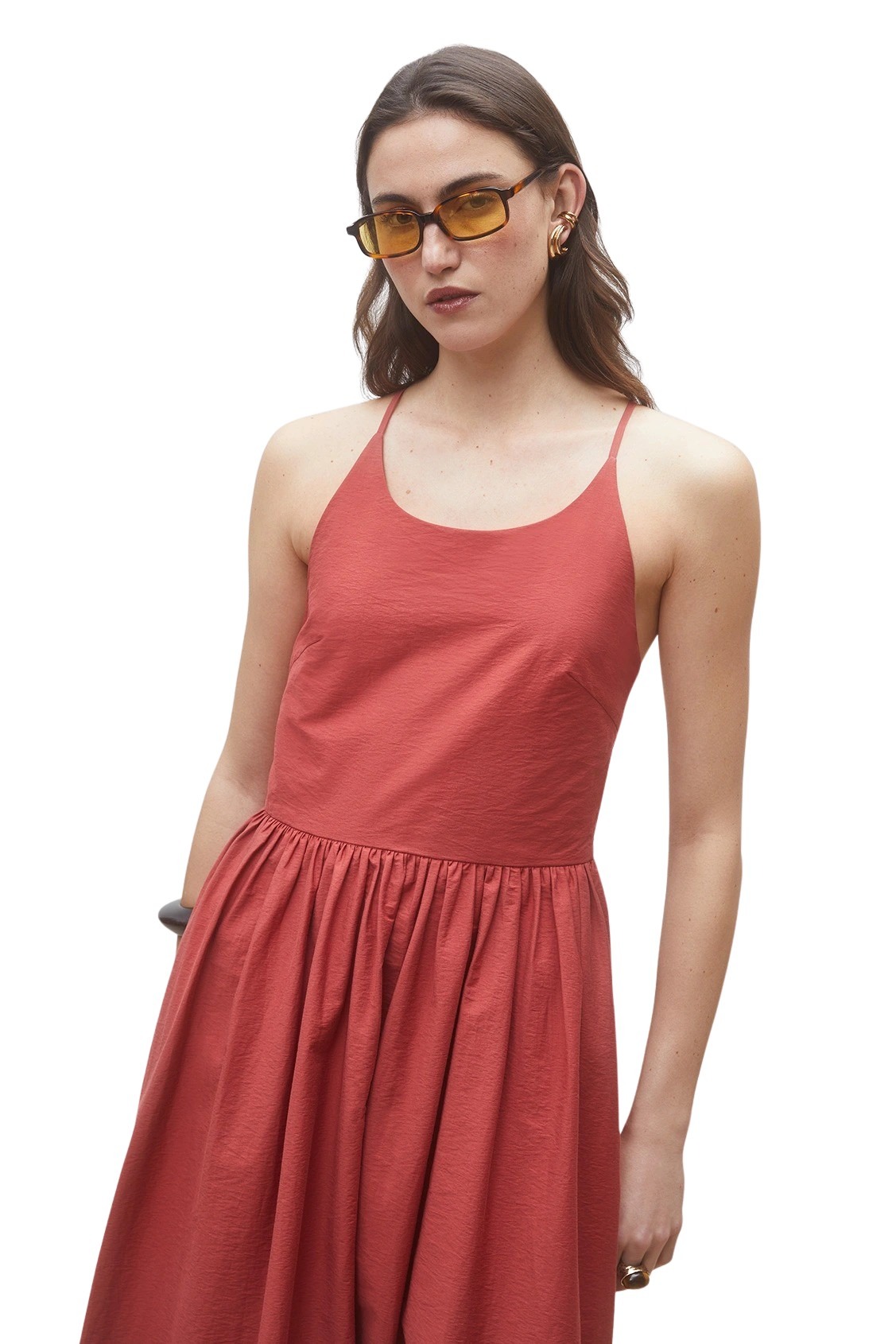 Kjole til dame fra Suncoo i lett poplin med strukturert finish. Elegant, lang modell med åpen rygg og kryssede knytebånd bak. Preget effekt nederst gir et sofistikert uttrykk, perfekt til sommerens anledninger.