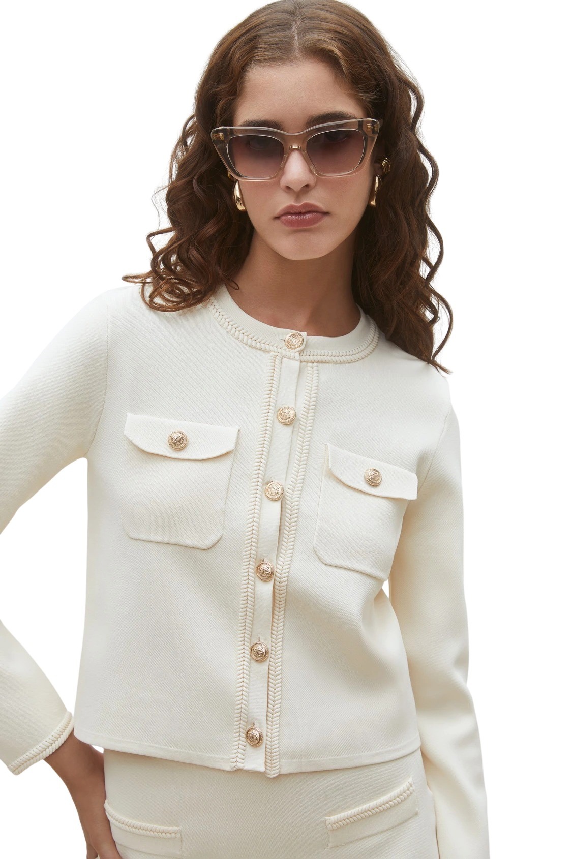 Cardigan til dame fra Suncoo. Designet med flettede detaljer og gullknapper som gir et feminint og sofistikert uttrykk. En allsidig cardigan som passer perfekt til både hverdagsbruk og mer pyntede anledninger, gjerne stylet med matchende skjørt.