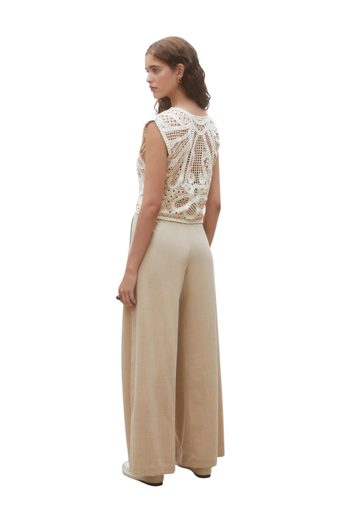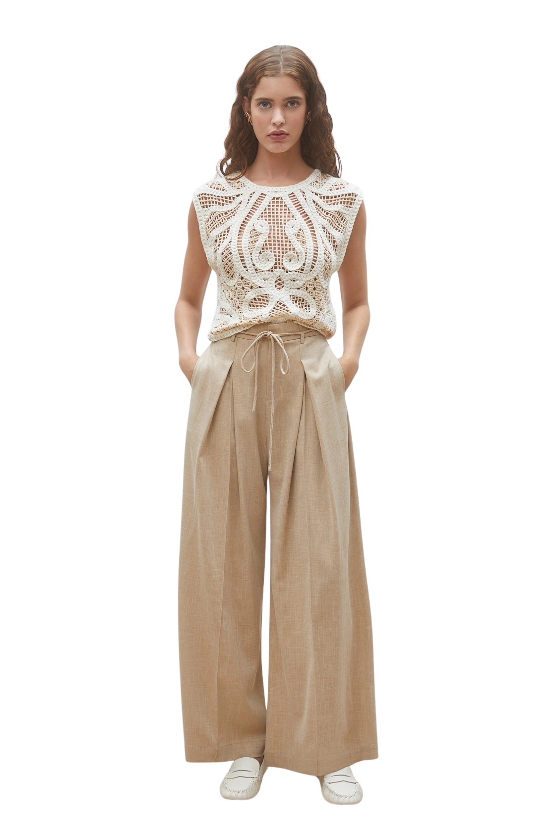 Bukse til dame fra Suncoo. Vide bukser med legg som gir et elegant og avslappet uttrykk. Designet med knytebelte i livet og lett, flytende kvalitet. Perfekt til både hverdagsbruk og mer pyntede anledninger.