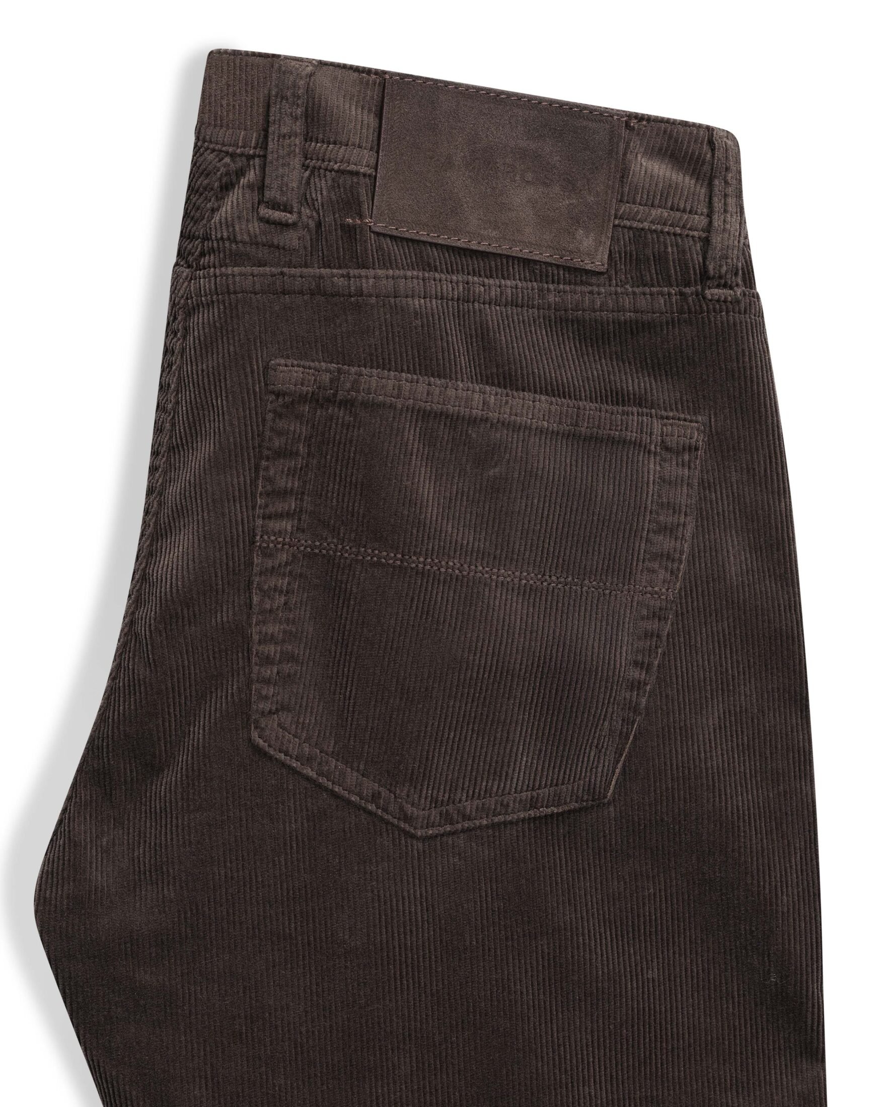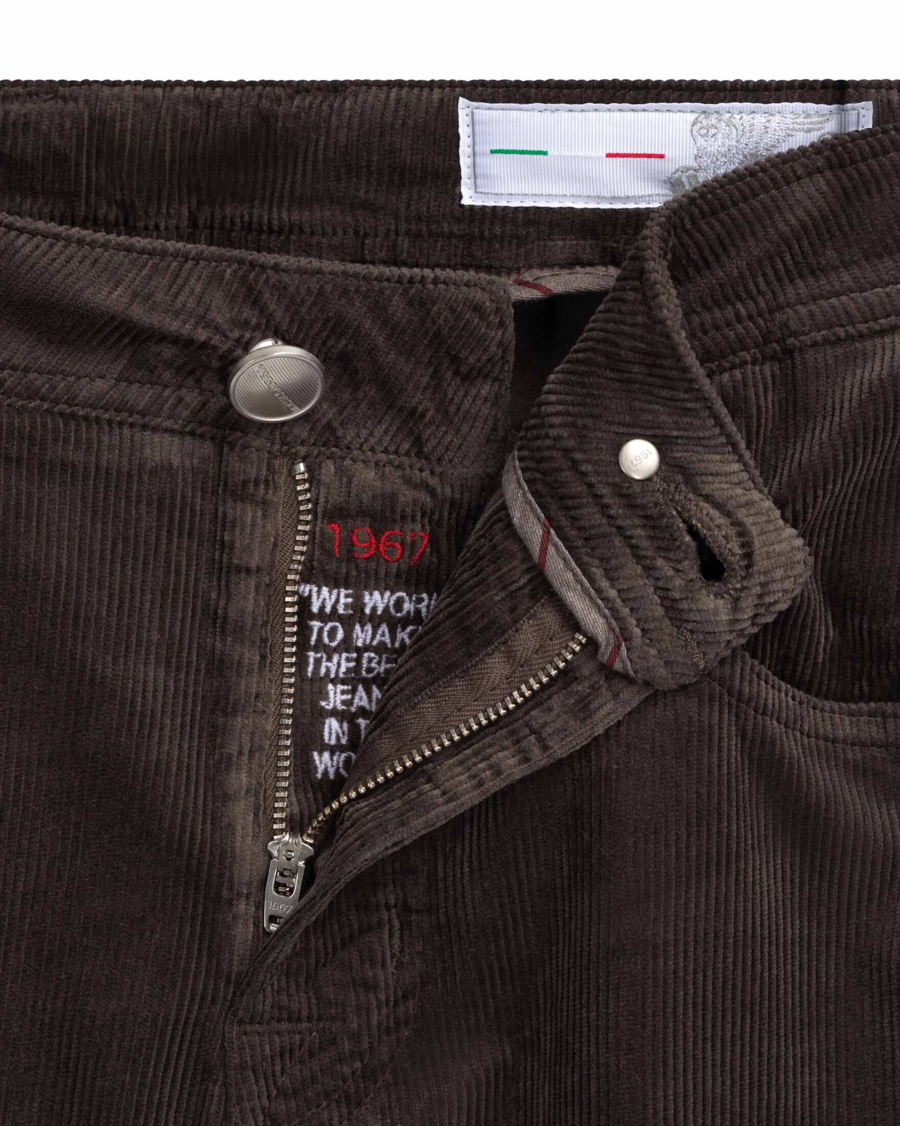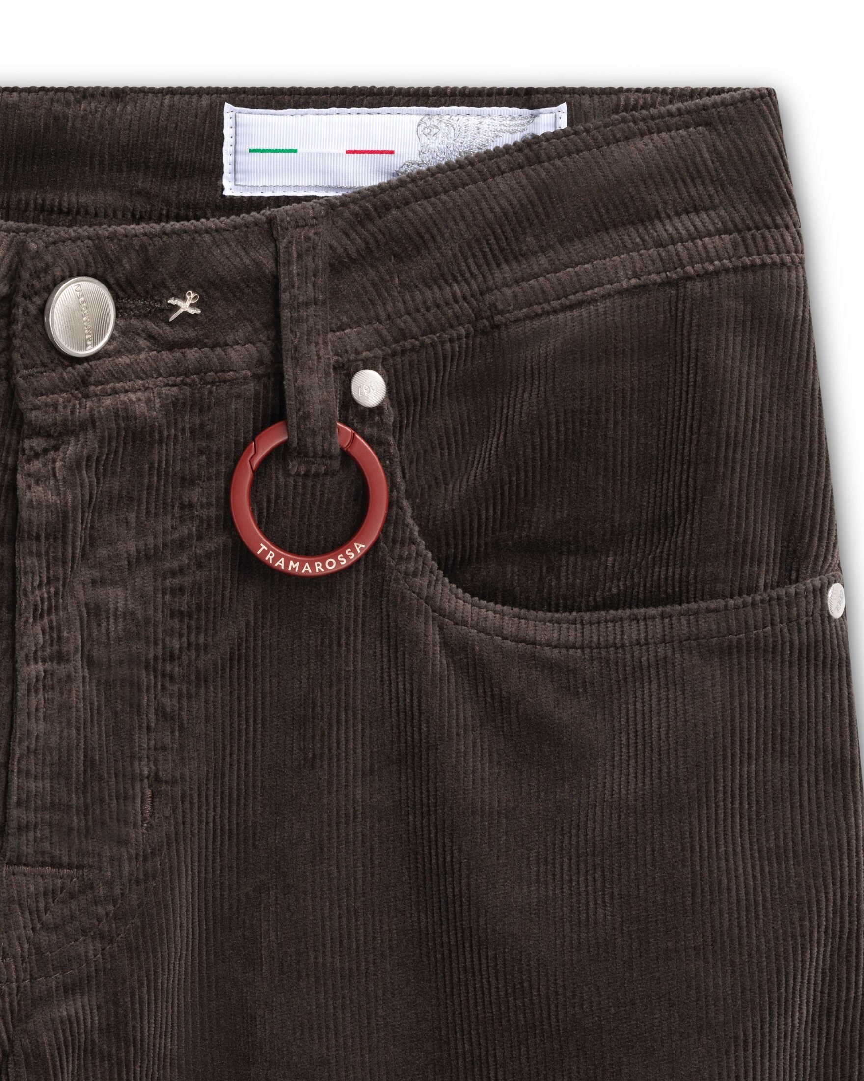 Kordfløyelbukse fra Italienske Tramarossa. Buksene har en moderat smal passform med stretch for god komfort. Klassisk 5-lommer modell som lukkes med glidelås i gylf. Eksklusive detaljer, som den røde ringen på beltestroppen. En tidløs mørk brunfarge og en perfekt passform gjør disse buksene til et sikkert valg denne høsten og vinteren.