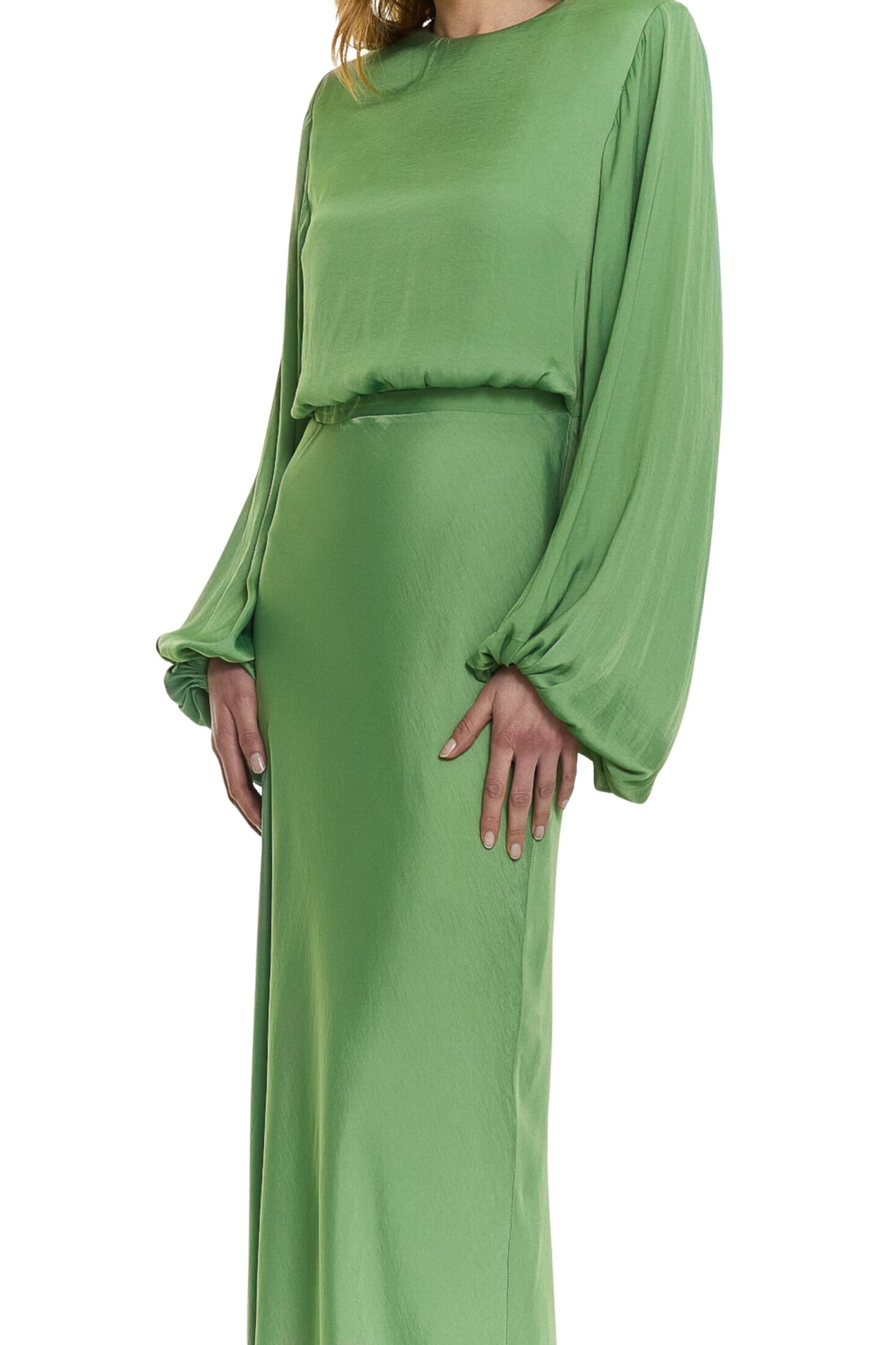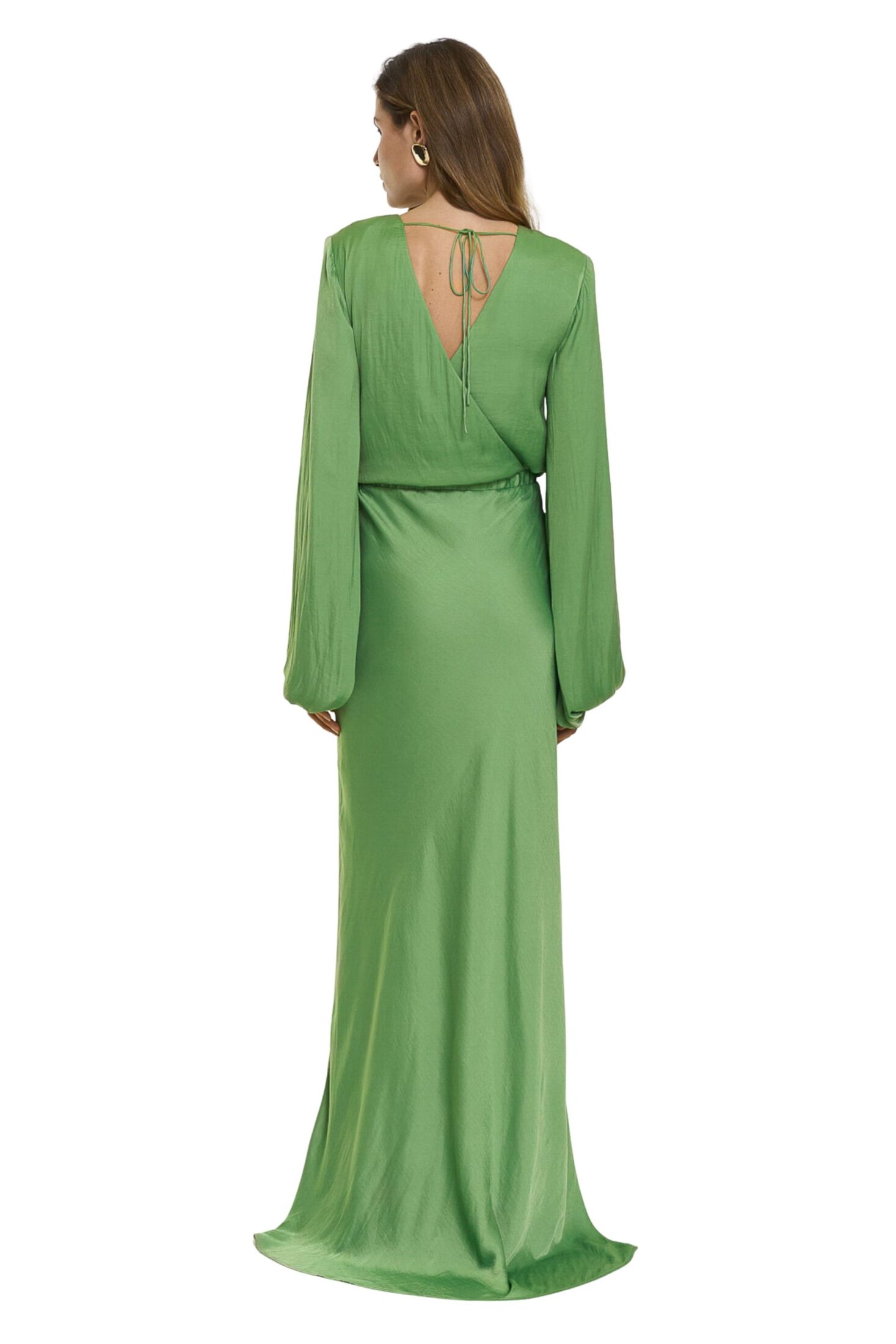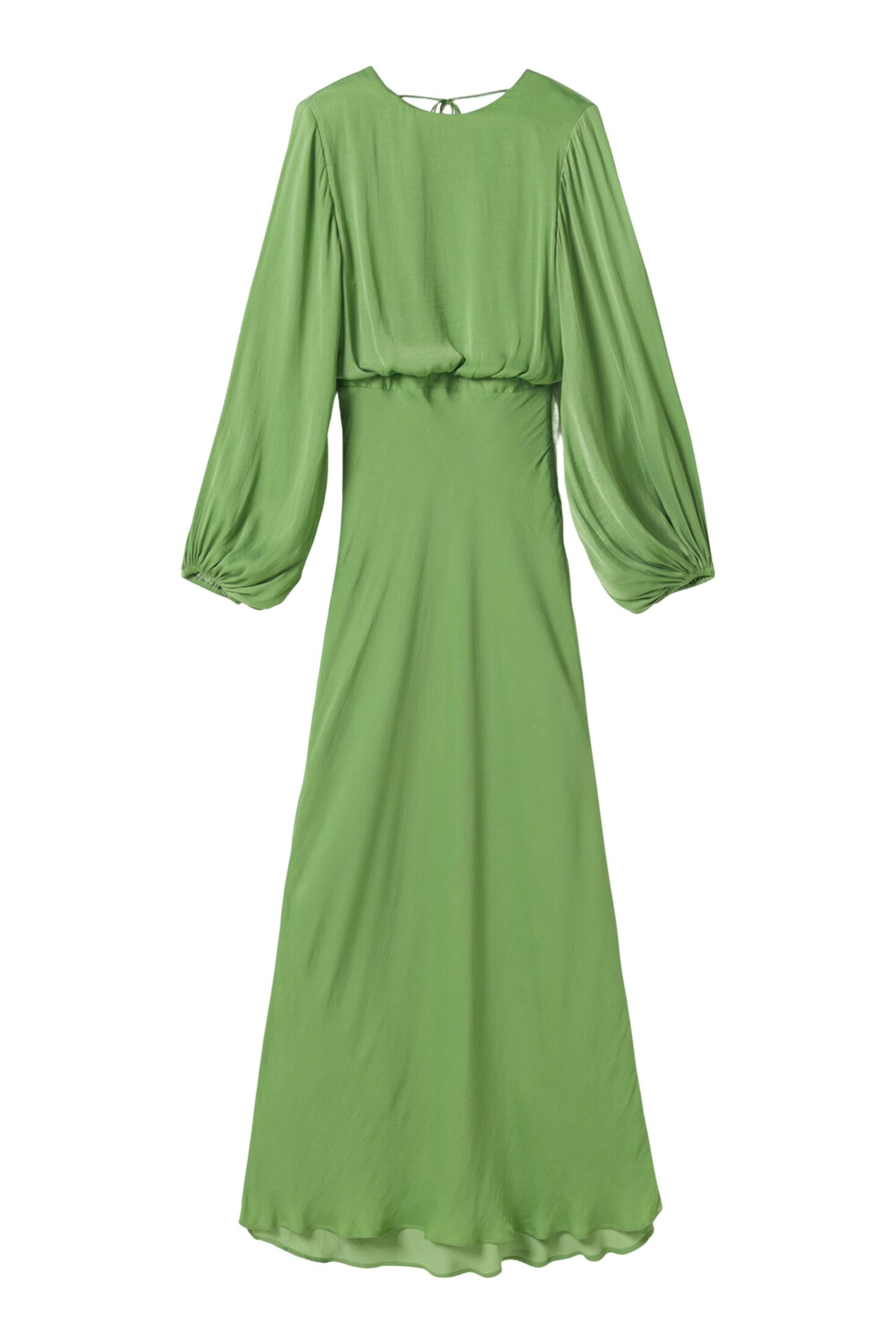 Juliette Dress fra Twist & Tango. En elegant maxikjole med flatterende midje, mykt fall og voluminøse ermer som gir et sofistikert uttrykk. Den friske grønntonen gjør den perfekt til både festlige anledninger og sommerens selskaper.