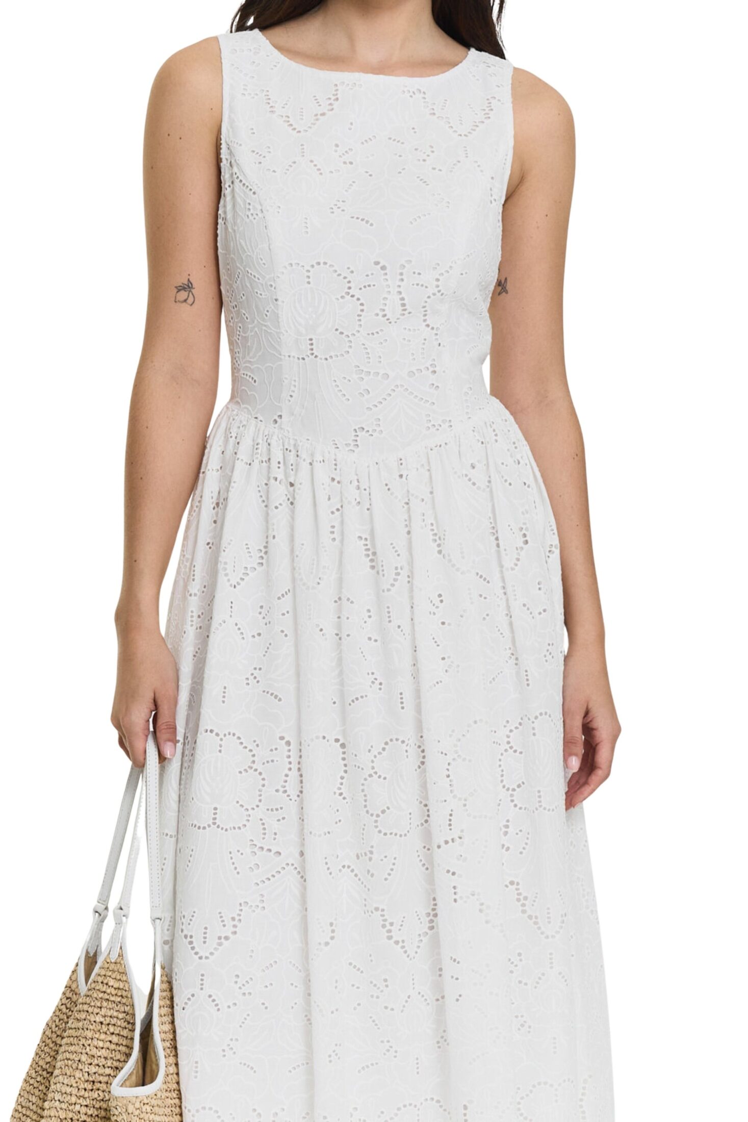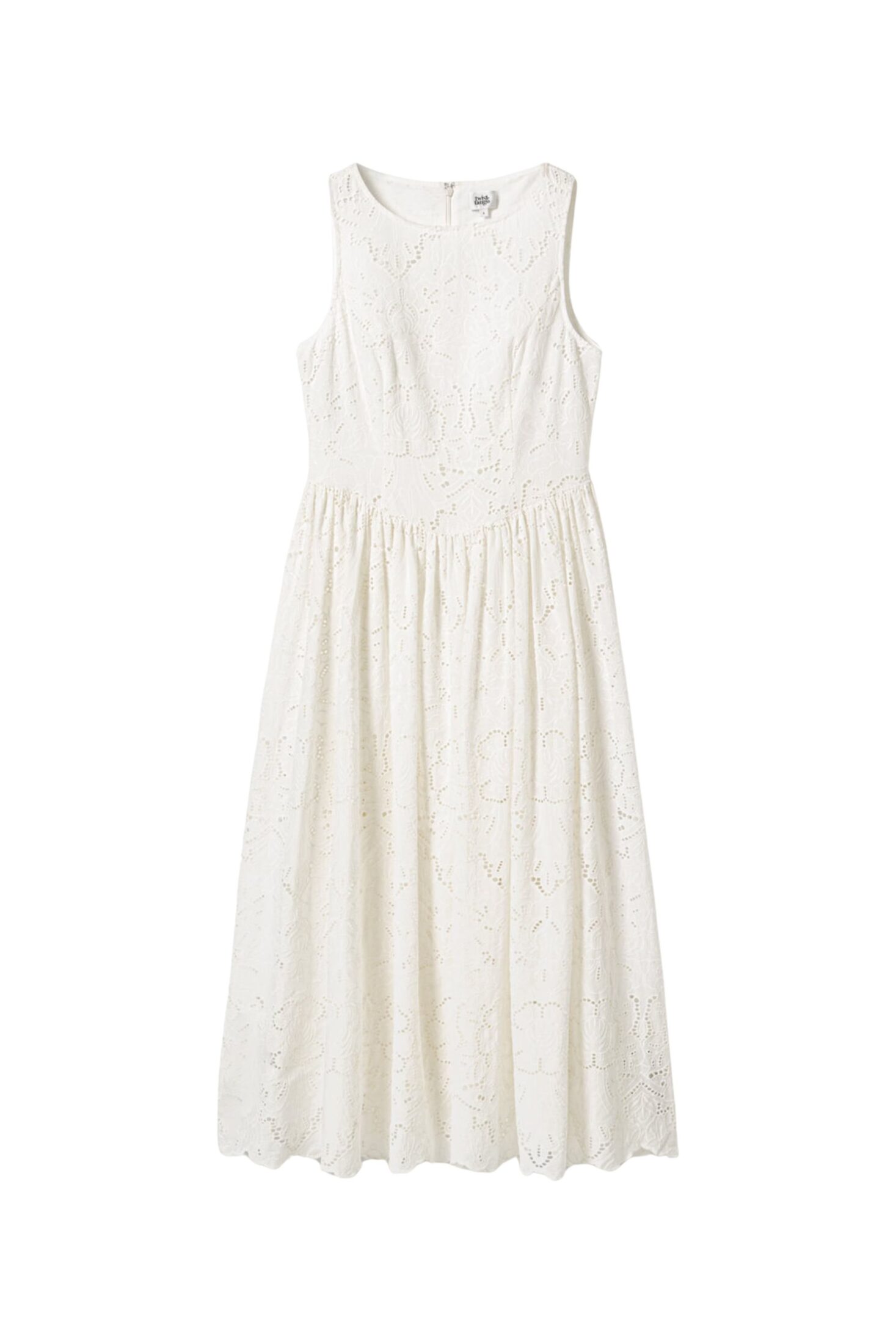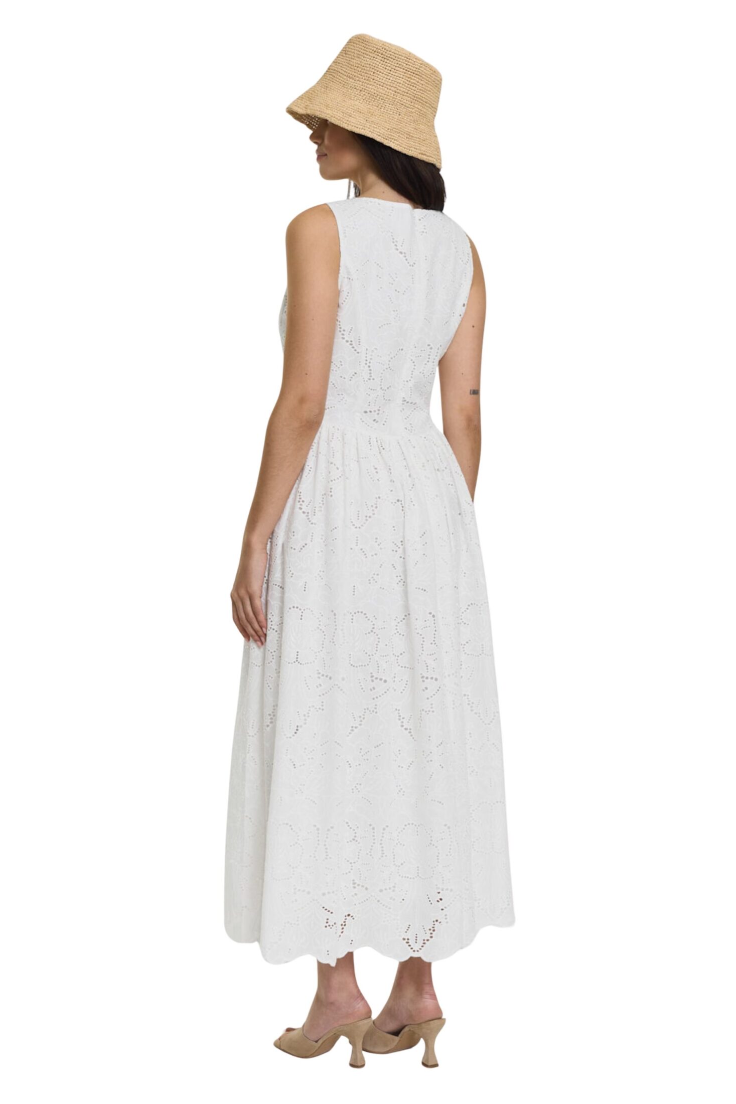 Myka Broderie Dress fra Twist & Tango. En feminin kjole med delikat broderie anglaise og en elegant, tidløs silhuett. Subtile rynker ved hoftene og en scallop-kant nederst gir et lett og romantisk uttrykk.