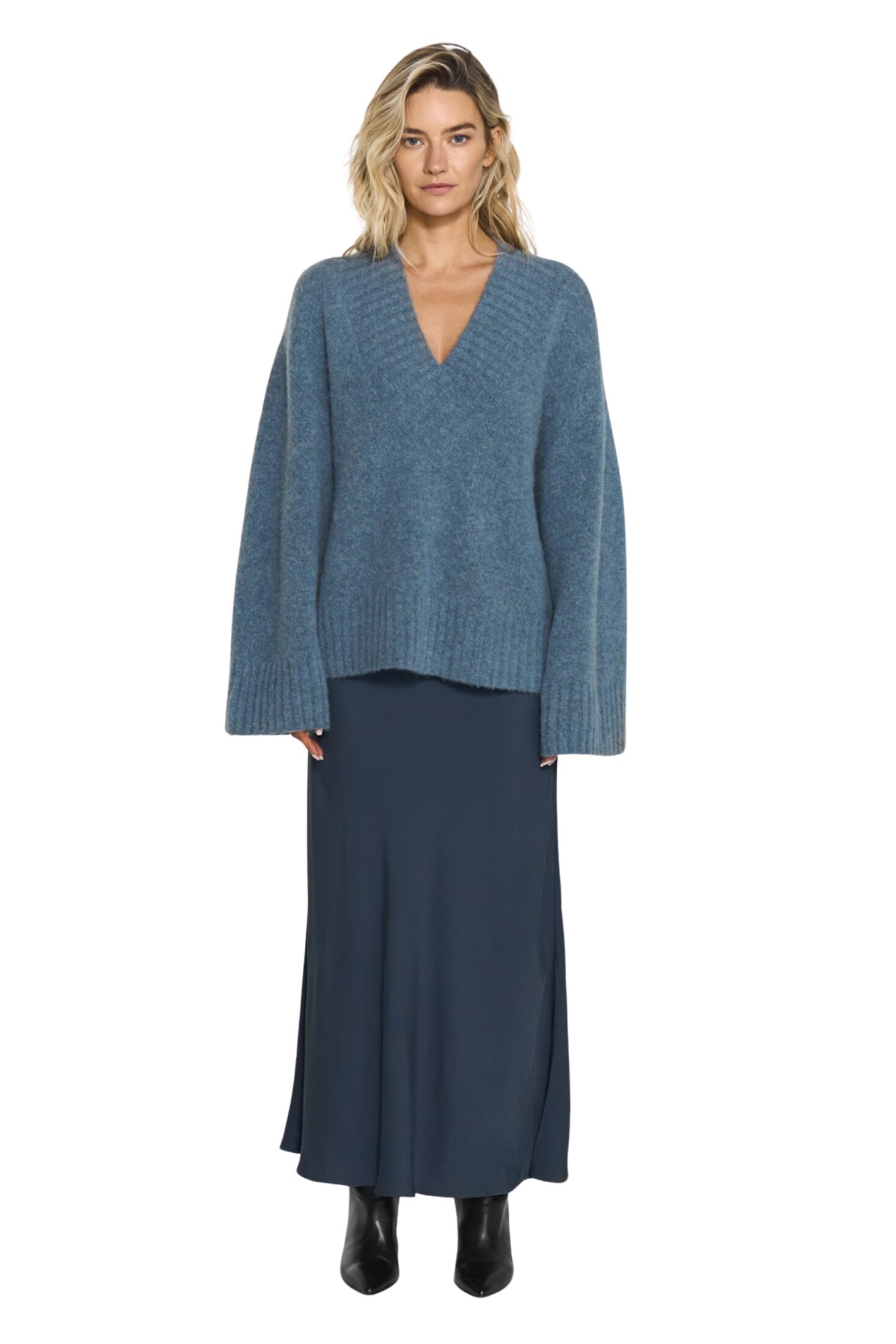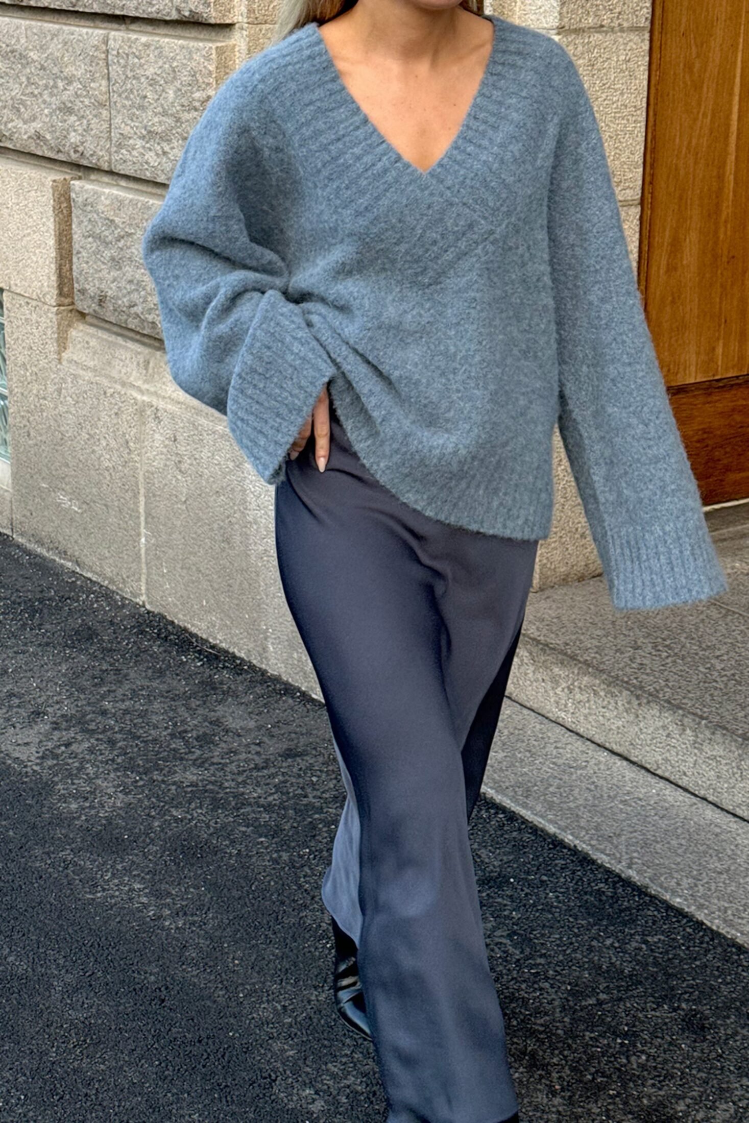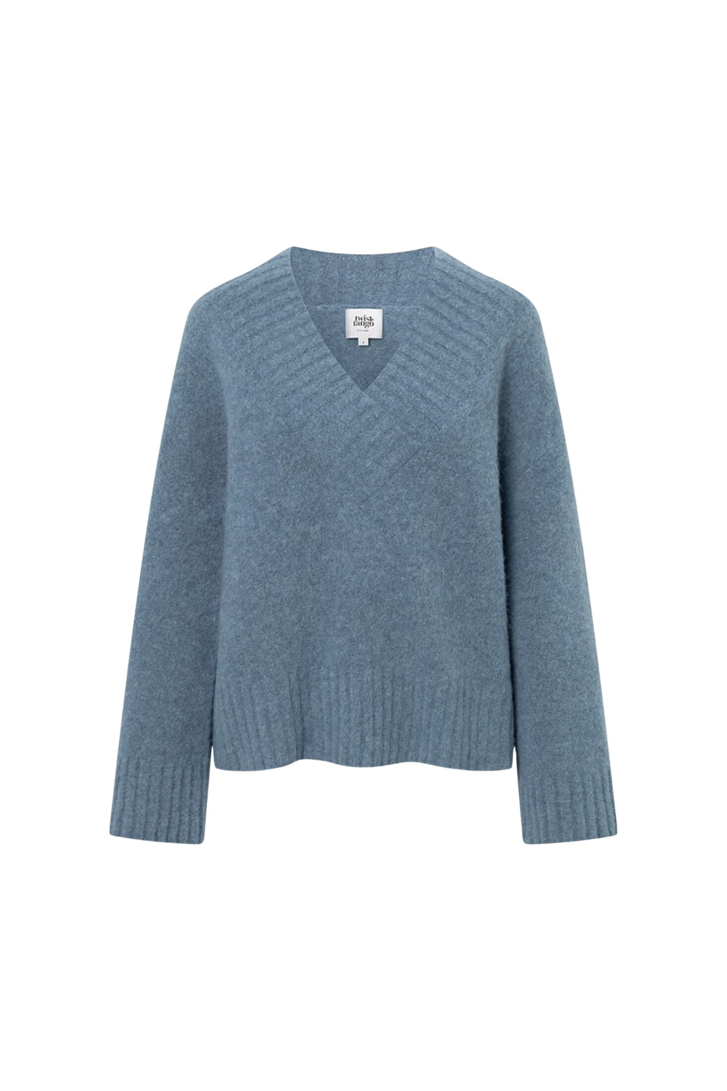 Strikkegenser til dame fra Twist & Tango. Laget av en myk baby alpakka-blanding med en dyp V-hals og stilige ribbestrikkede kanter. Den perfekt genseren for lag-på-lag-antrekk til høsten og vinteren, i en nydelig blåfarge.