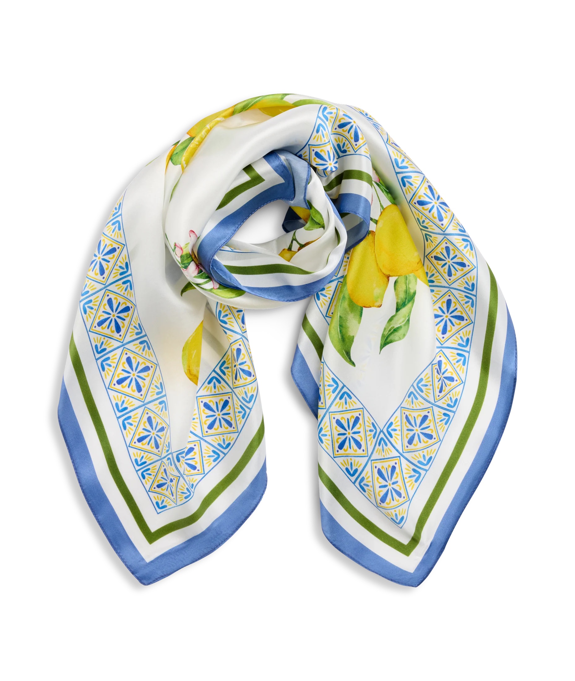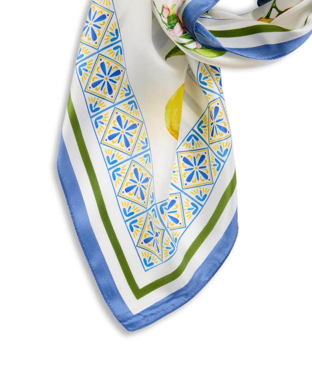 Misa Silk Scarf fra Urban Pioneers. Et kvadratisk skjerf laget i luksuriøs silke. Det elegante designet kombinerer et friskt sitronmotiv med en dekorativ, ornamentert kant som gir et sofistikert uttrykk. Den glatte kvaliteten gir en eksklusiv følelse, mens det tidløse mønsteret tilfører antrekket et friskt og stilfullt løft.