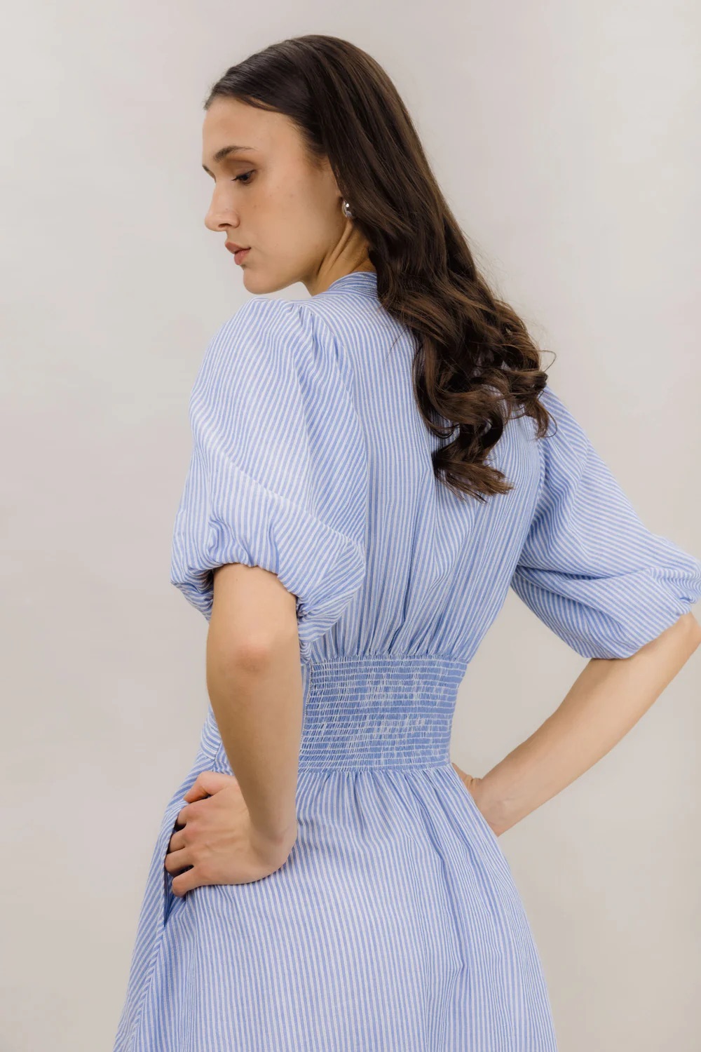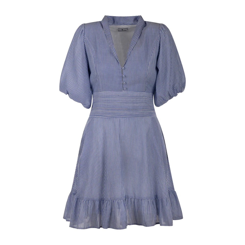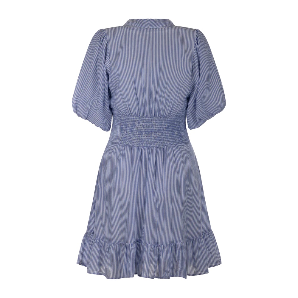 Papira Dress fra Urban Pioneers. En feminin, stripete kjole i 100% bomull, designet med en strukturert silhuett og moderne uttrykk. Den har markerte puffermer, definert midje og et skjørt med volang som gir både volum og bevegelse. En flatterende modell som kombinerer komfort med et lekent og stilfullt design. Perfekt til både hverdags og sommerlige anledninger.