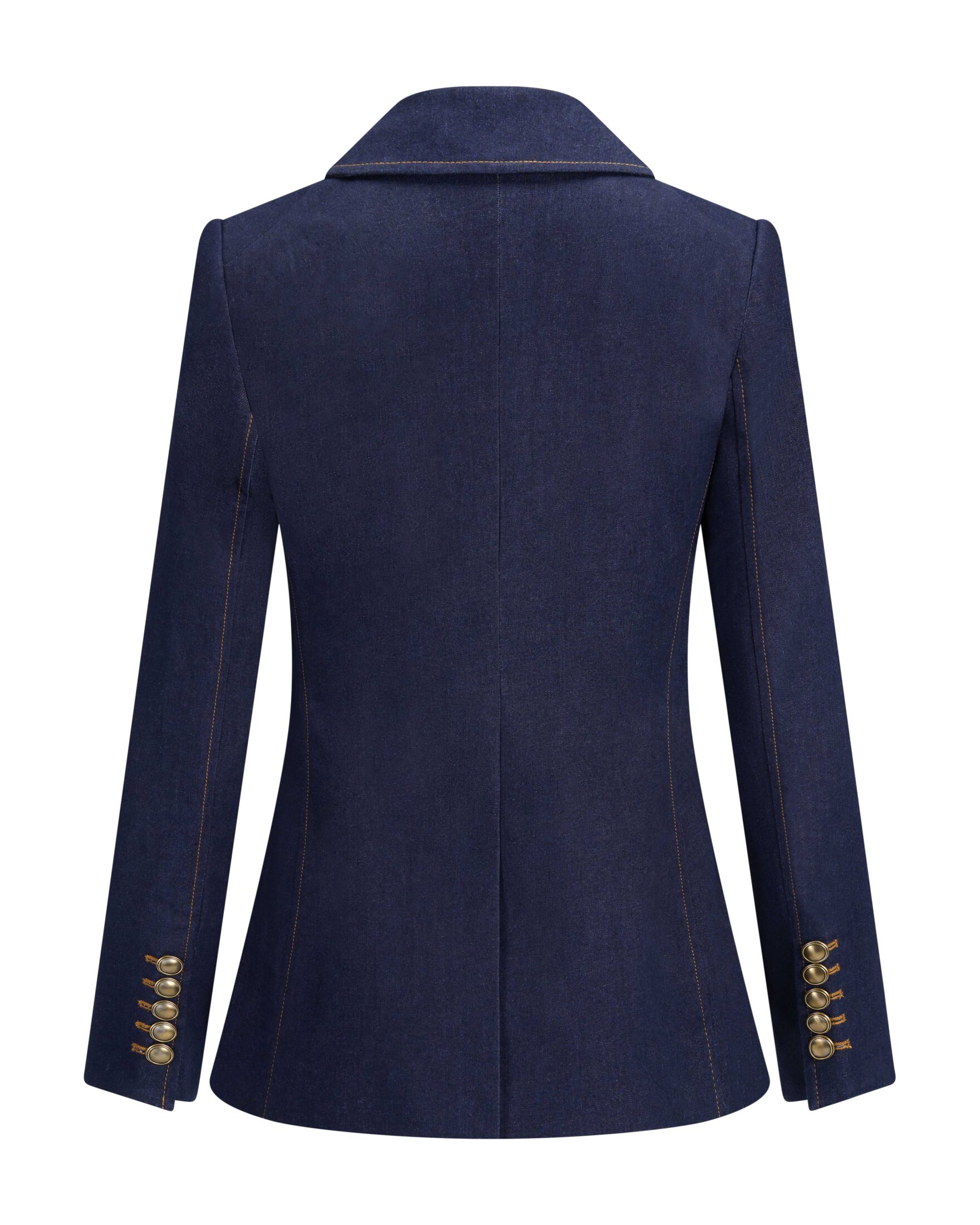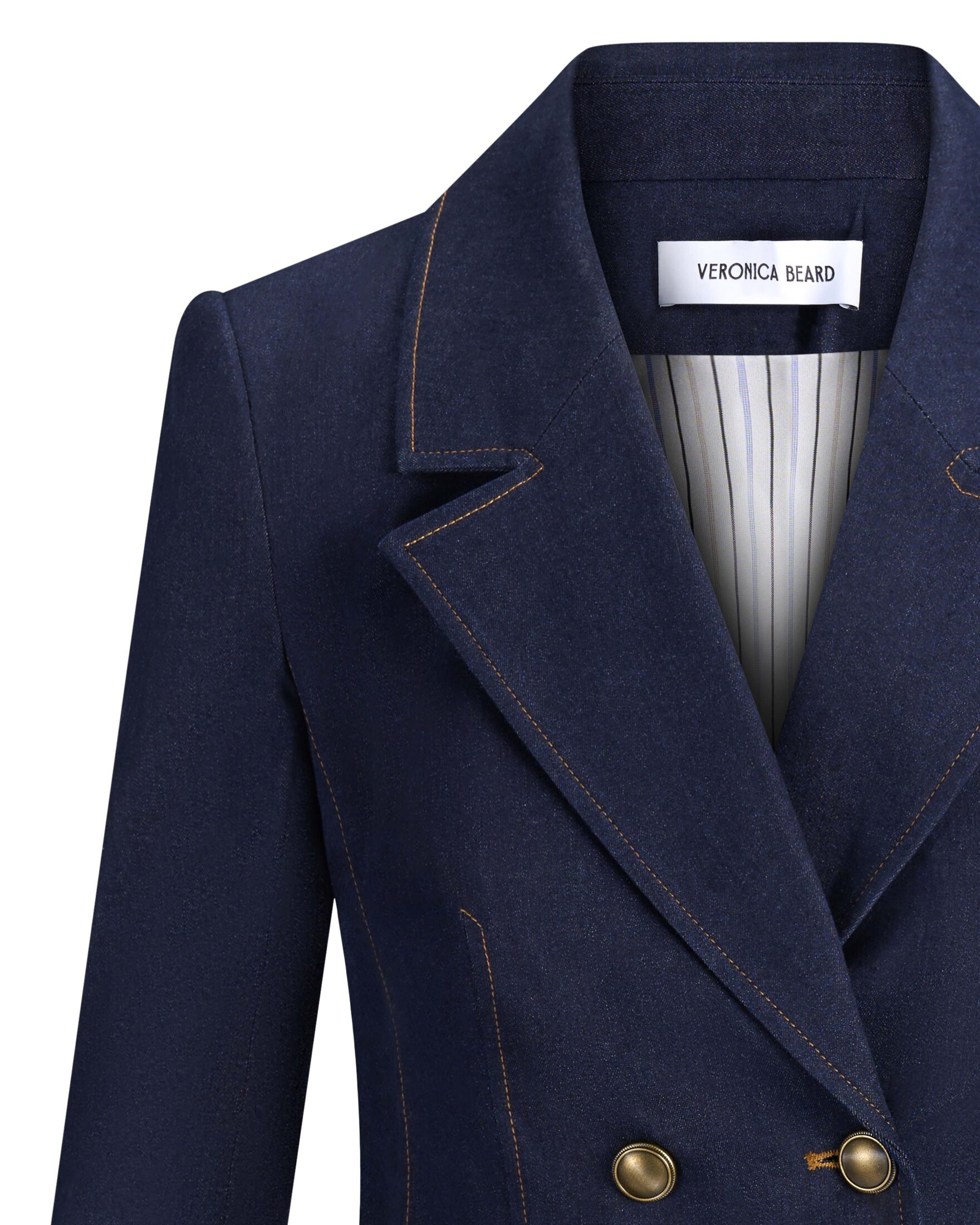 Claude Dickey Jacket fra Veronica Beard. En elegant, dobbeltspent blazer i mørk denim med kontrastsøm og gullknapper. Den skreddersydde passformen gir et feminint og polert uttrykk, samtidig som denimstoffet tilfører en moderne vri. Bruk den med dressbukser for en allsidig look som fungerer både til jobb og hverdagsbruk.