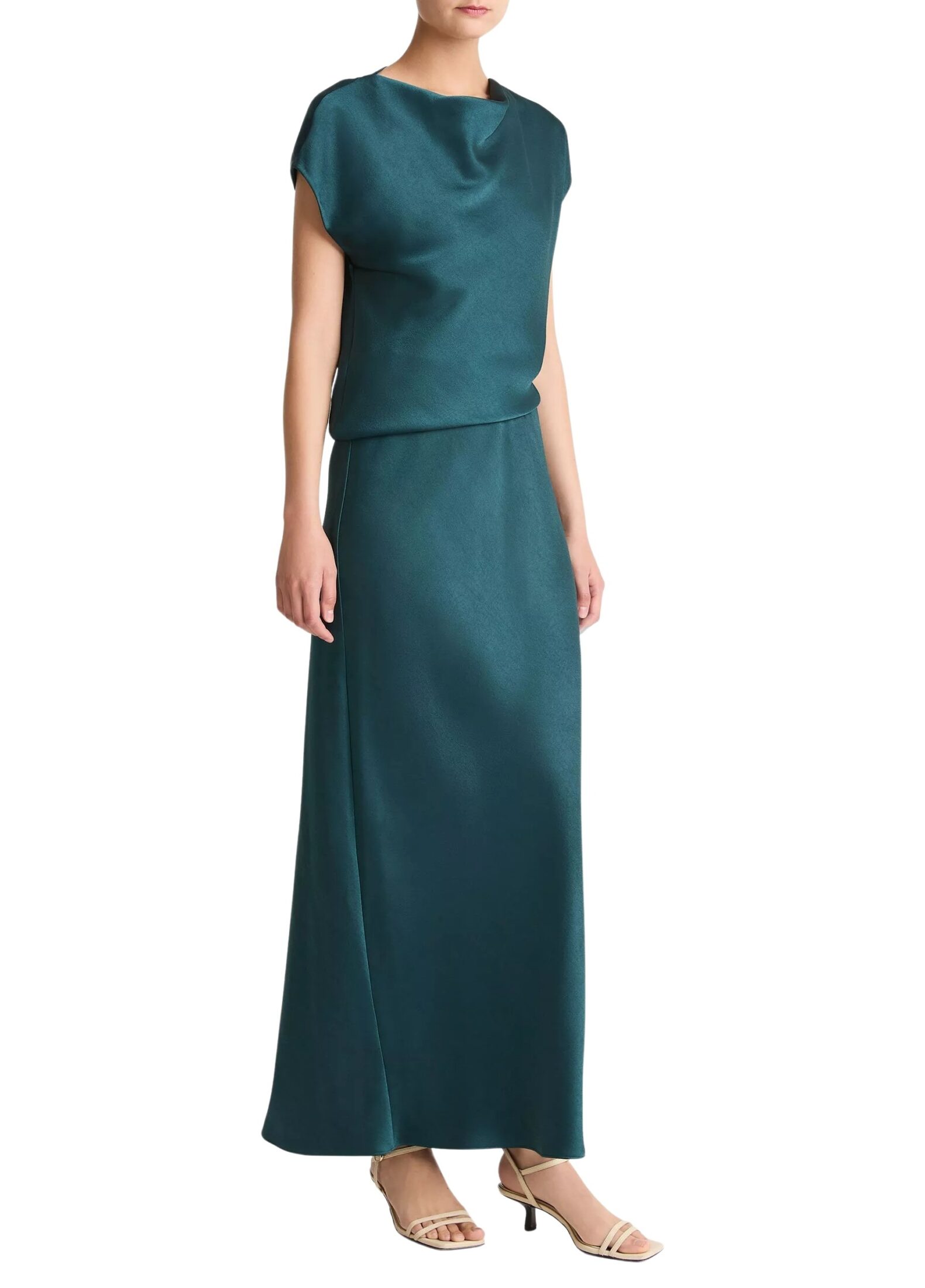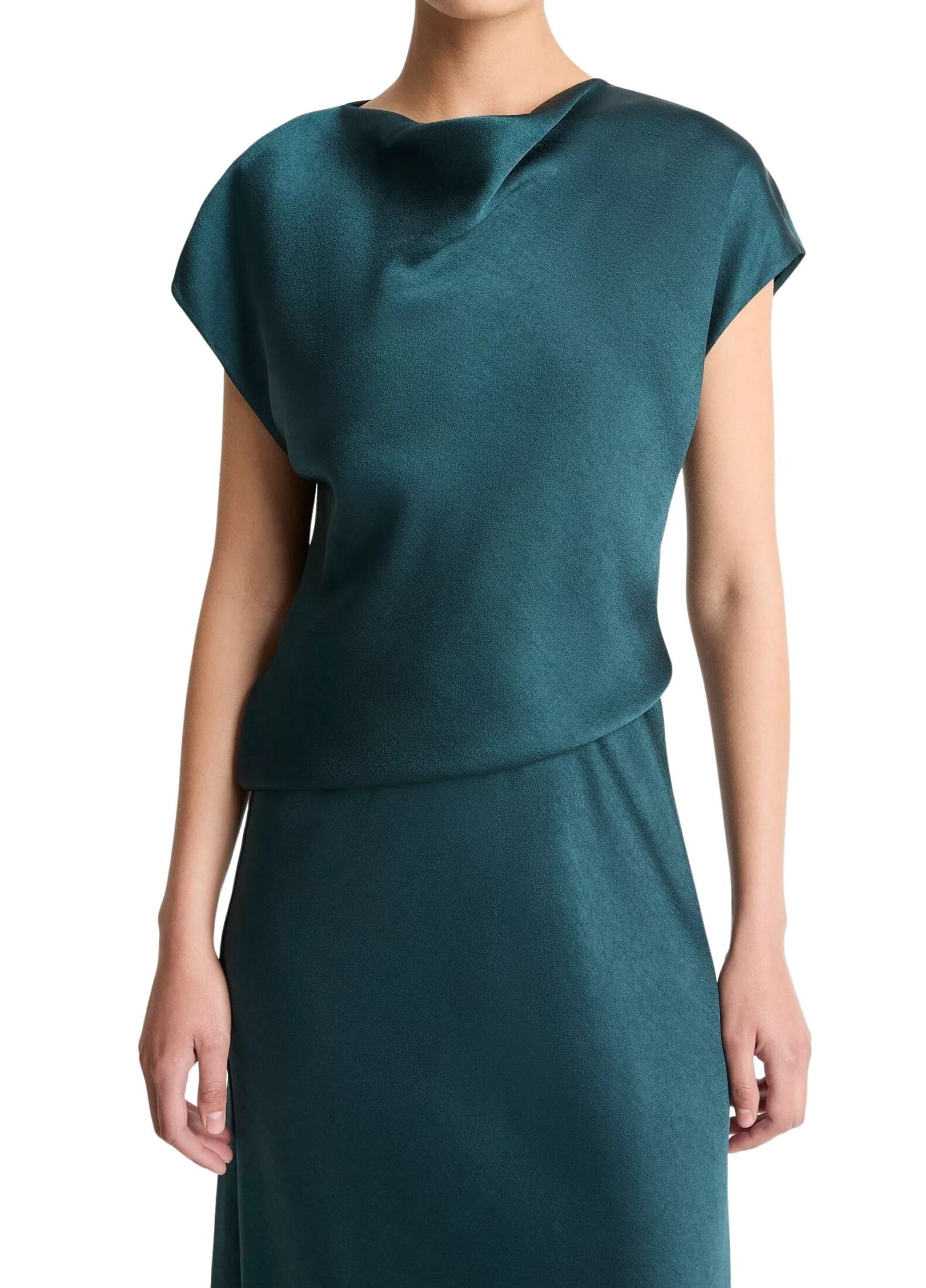 Kjole til dame fra Vince. En elegant kjole i glansfull sateng med en flatterende drapert cowl-neck som gir et mykt og sofistikert uttrykk. Det flytende snittet og den luksuriøse teksturen gjør den perfekt for alt fra formelle anledninger til kveldsarrangementer.
