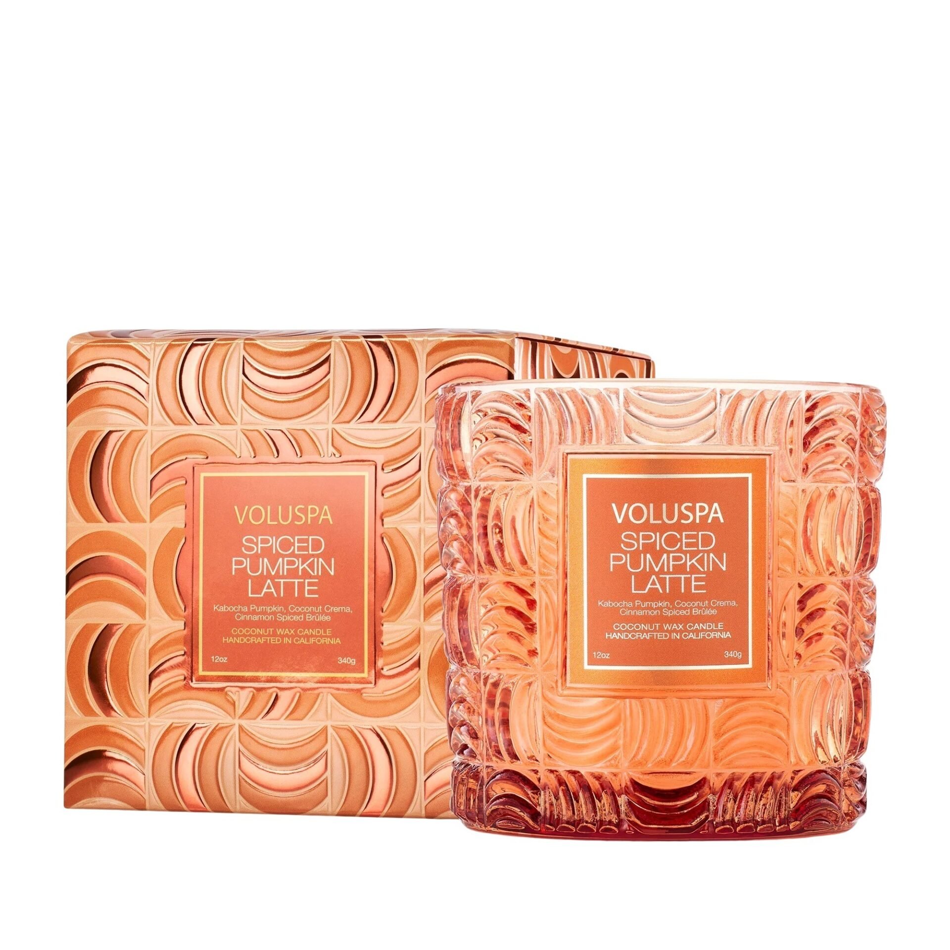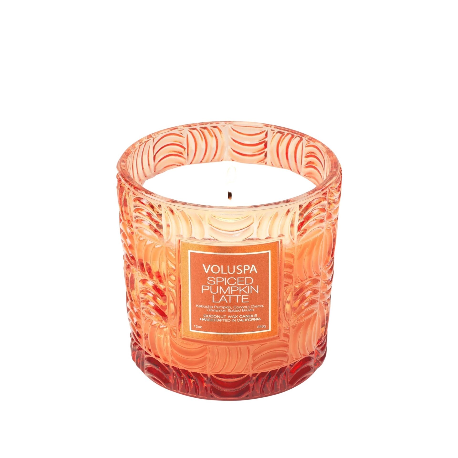 Fang essensen av høst med Voluspa Spiced Pumpkin Latte. En varm og innbydende duft som fyller rommet med koselig komfort. Her møtes kremet gresskar, søt vanilje, krydret kanel og nellik i en deilig blanding som minner om en rykende kopp pumpkin latte. Lyset kommer i et vakkert, rillet glass med en glødende oransjetone. Et elegant innslag i enhver interiørstil. Den rene kokosnøttvoksblandingen og den naturlige veken gir en jevn og langvarig brenning med rik duftspredning.