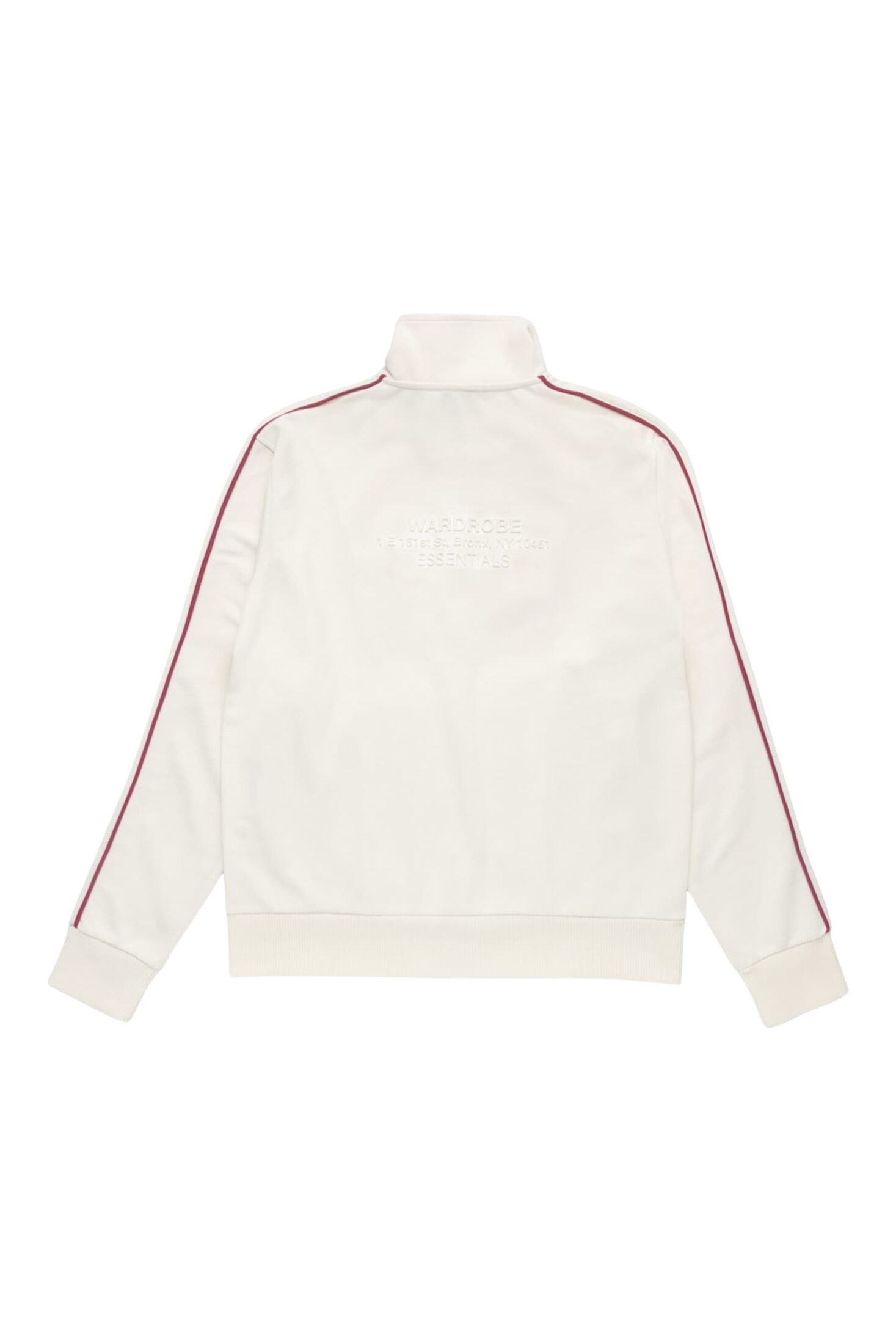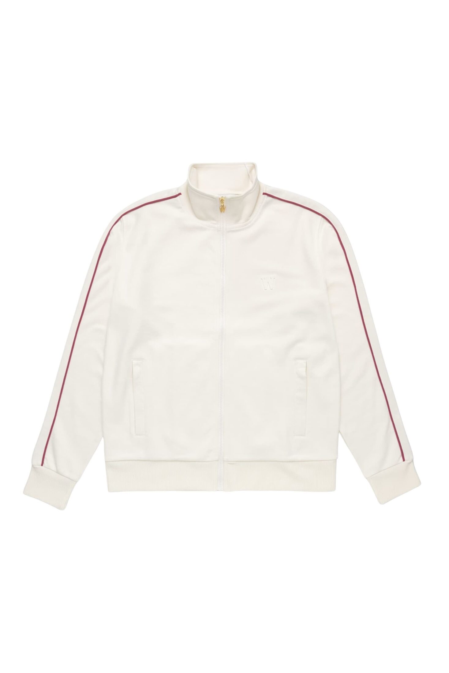 Hvit track jacket til herre fra Wardrobe Essentials. Jakken kombinerer en ren og sporty silhuett med elegante detaljer som kontraststriper og gullfarget glidelås. Den myke kvaliteten og diskré logoen gjør den til et perfekt plagg for både hverdagsbruk og en avslappet, stilsikker look.